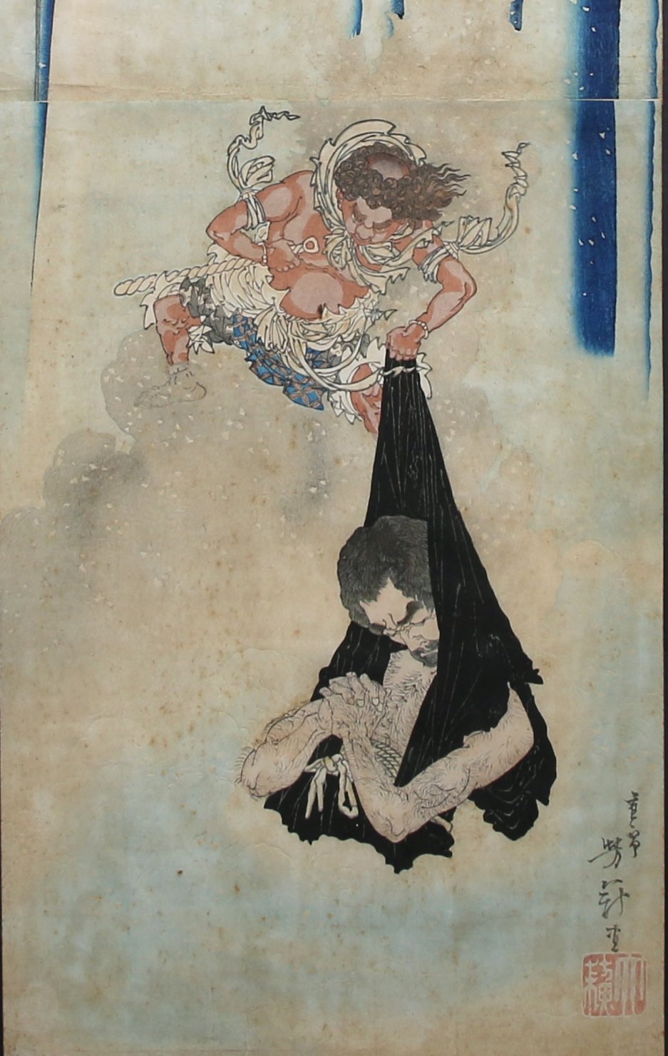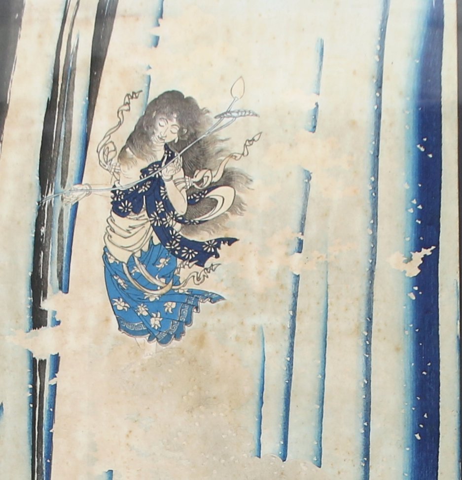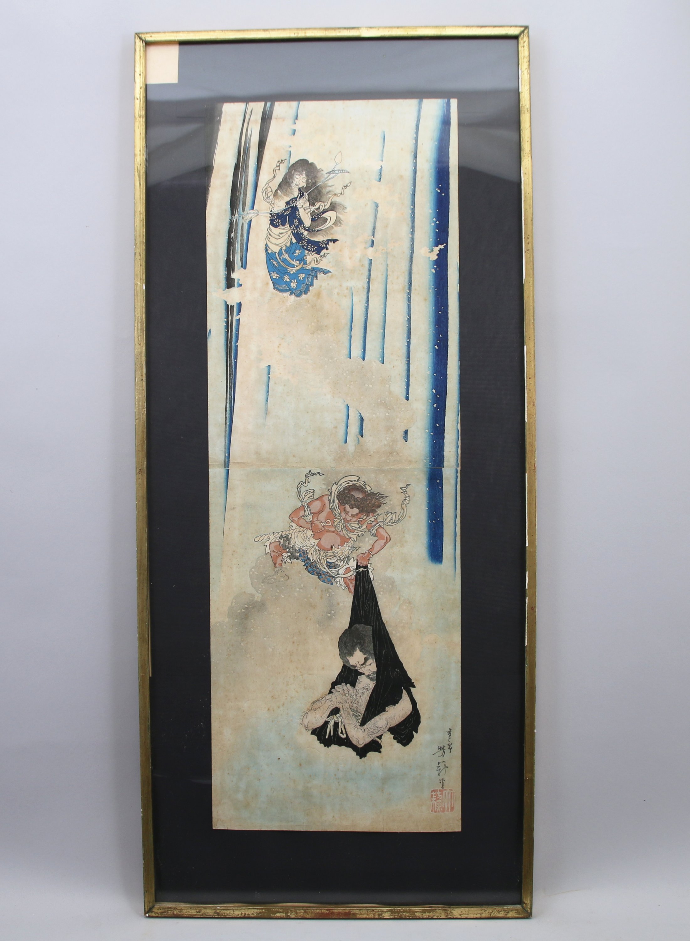 Double OBAN TATE-E, la pénitence de Mongaku, se tenant sous une cascade, Kannon au-dessus de lui. Signé Yoshitoshi suivi du sceau de l'artiste.