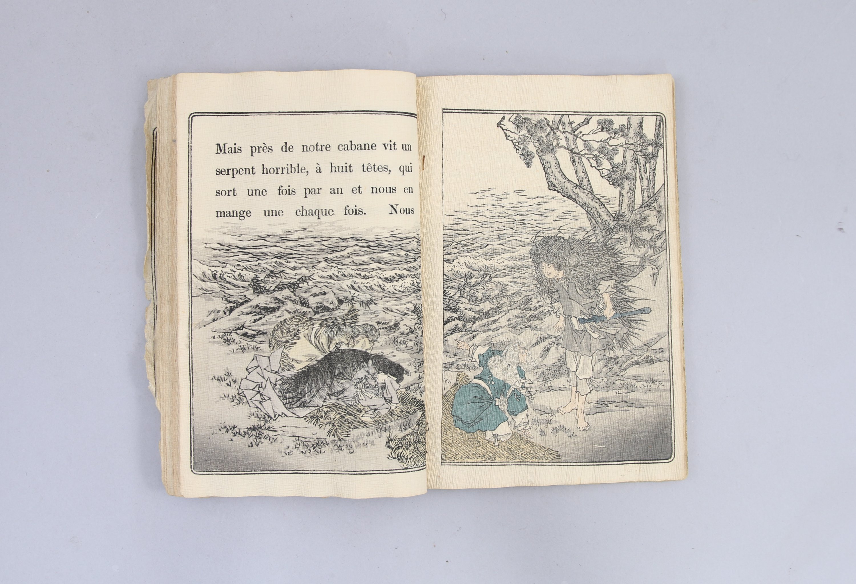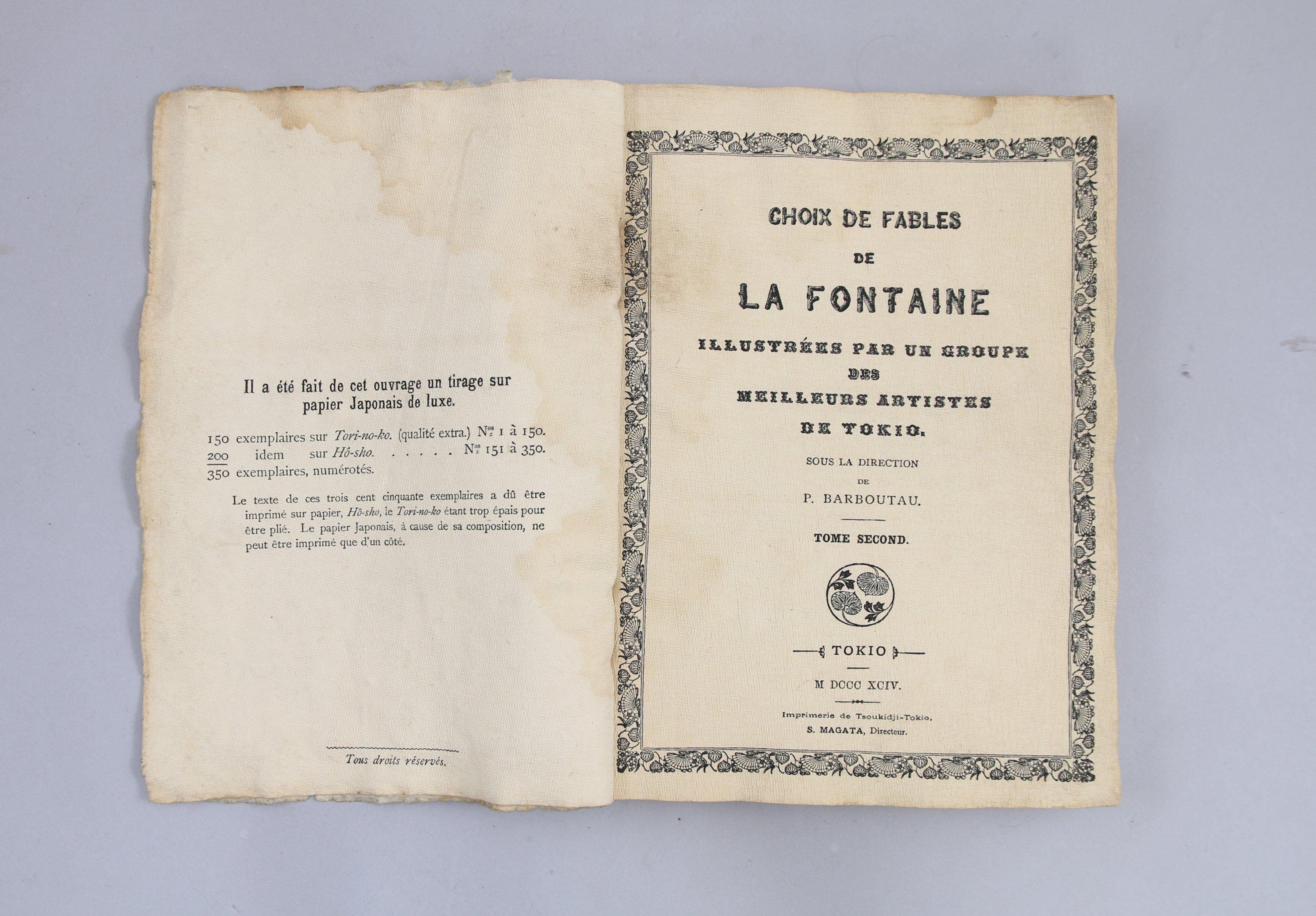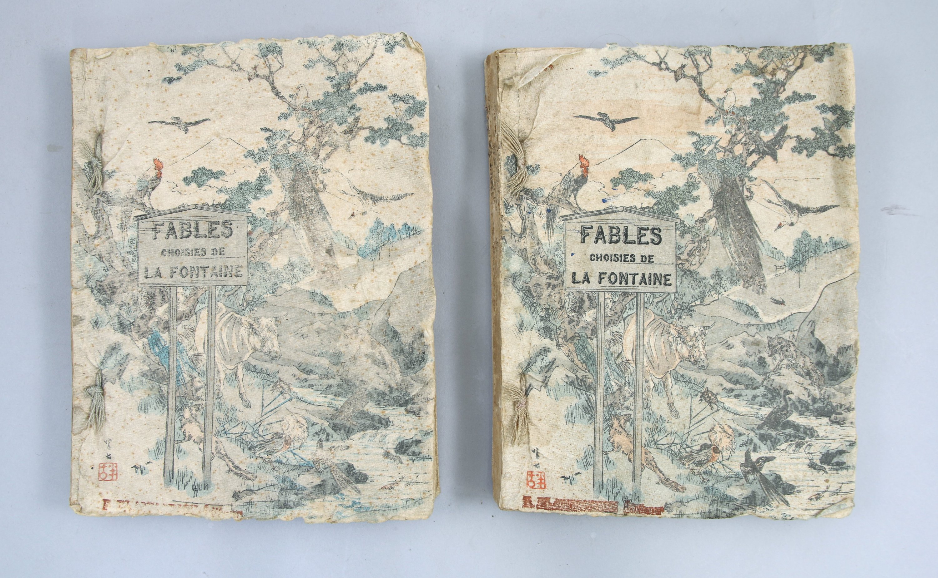 Trois ALBUMS sur papier crépon, Fables de la Fontaine illustrées par des artistes japonais sous la direction de Barboutau en deux tomes et Contes du Vieux Japon.