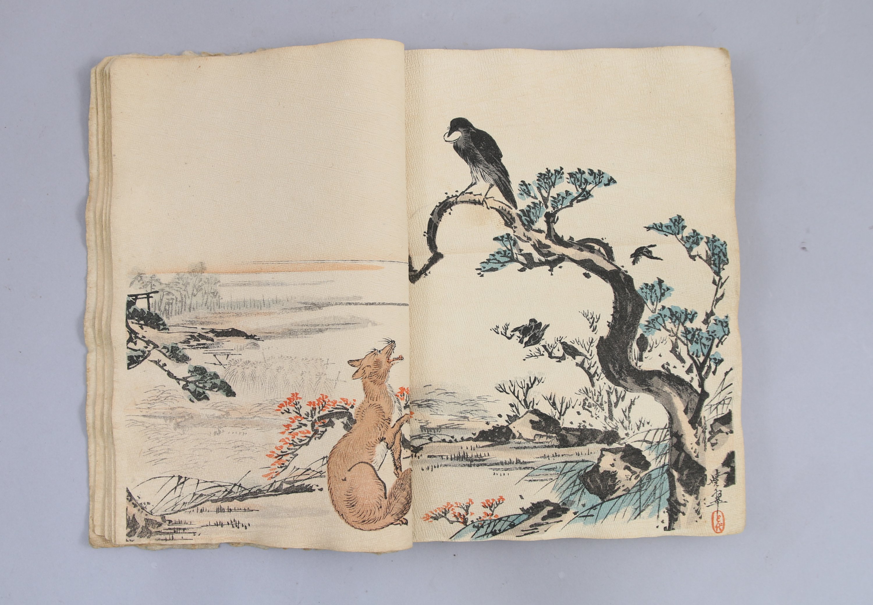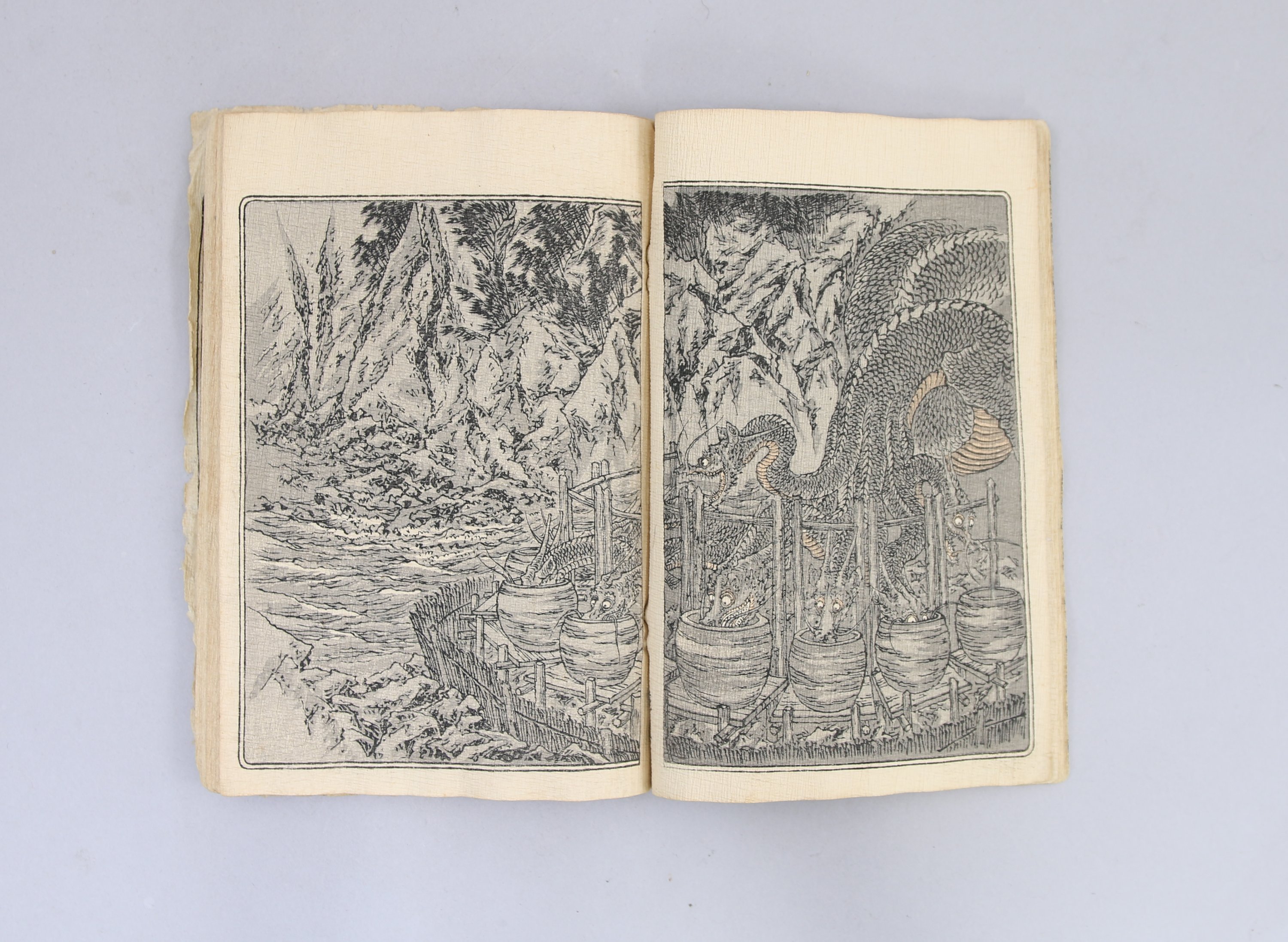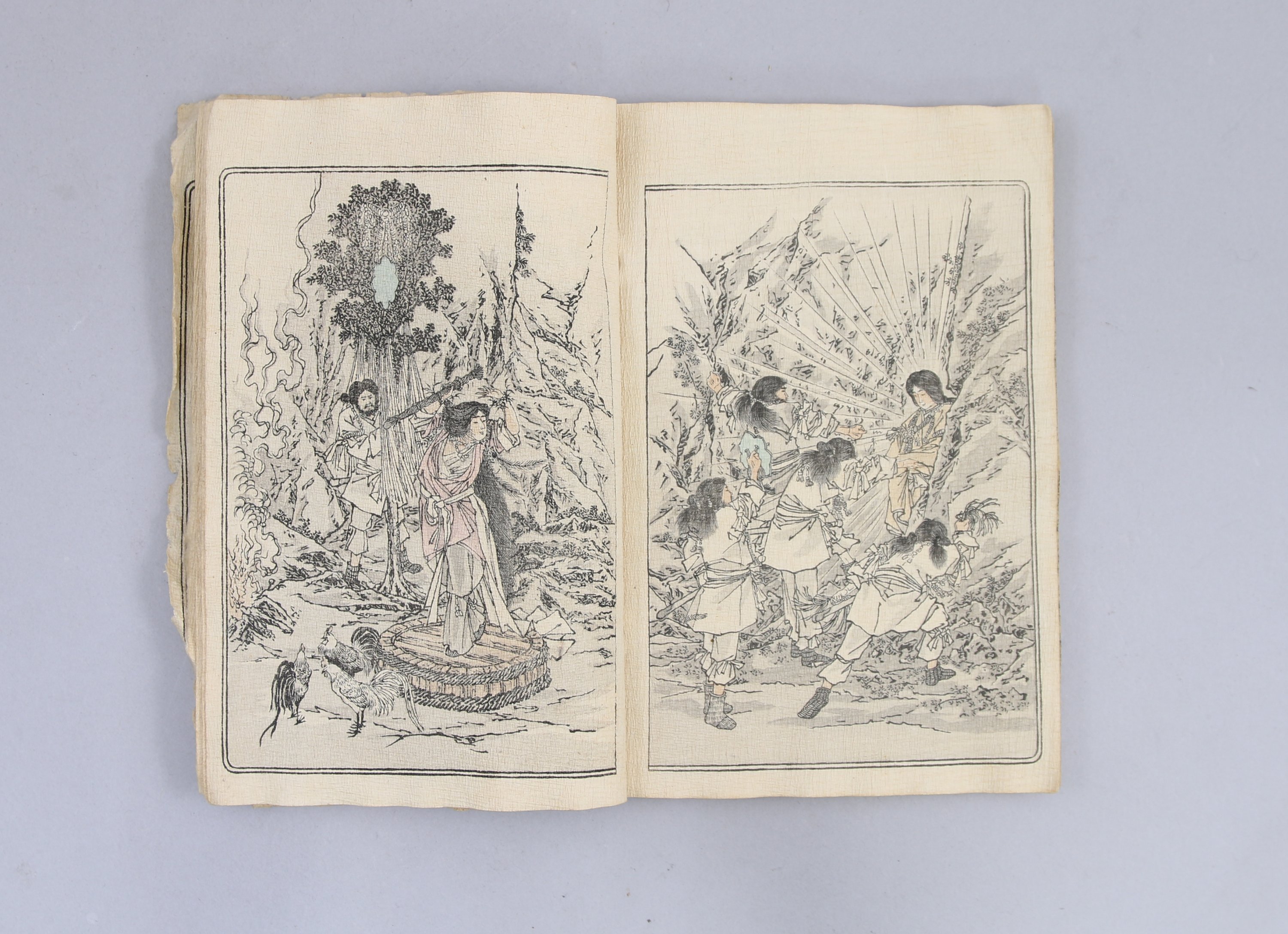 Trois ALBUMS sur papier crépon, Fables de la Fontaine illustrées par des artistes japonais sous la direction de Barboutau en deux tomes et Contes du Vieux Japon.
