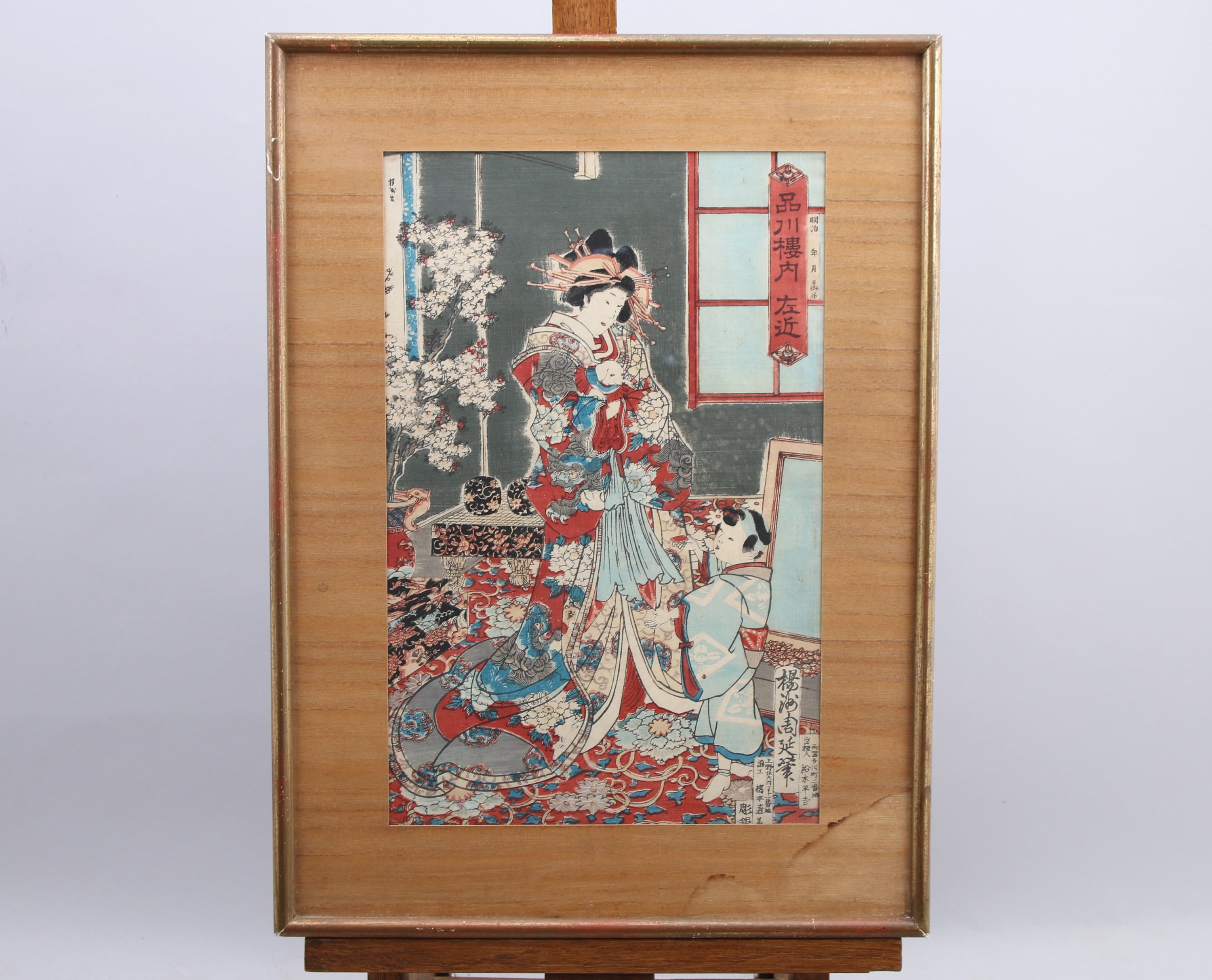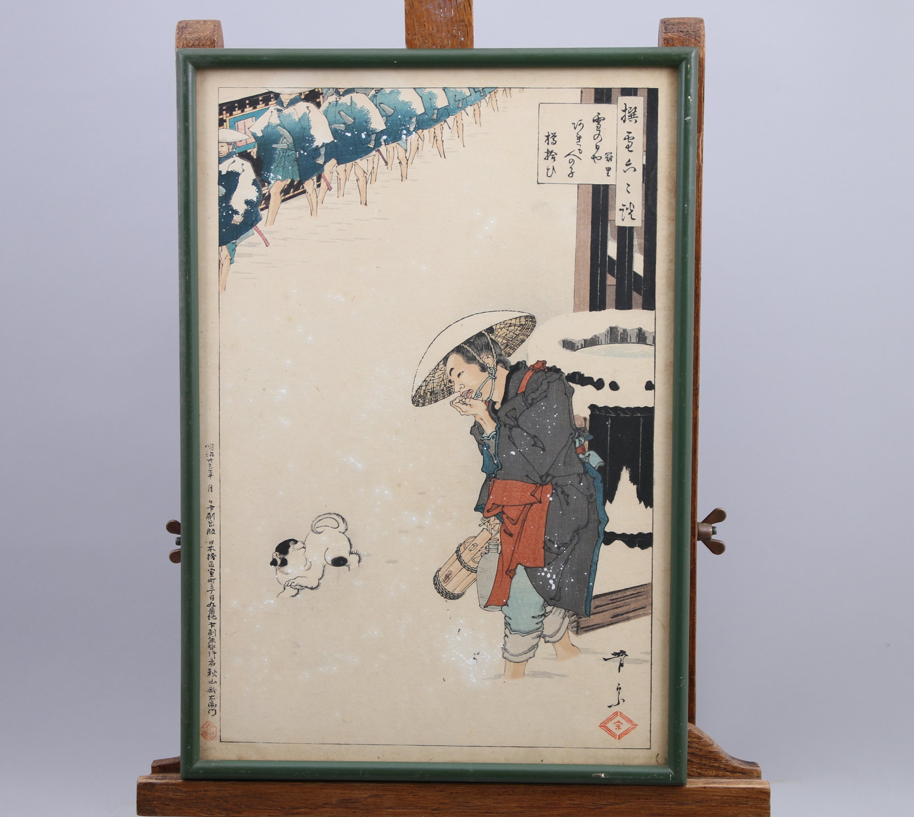 JOINT : un oban tate-e par Chikanobu, geisha tenant un chiot dans ses bras. Signé Yoshu Chikanobu hitsu. Dim. 46 x 33 cm. Encadré sous verre.
