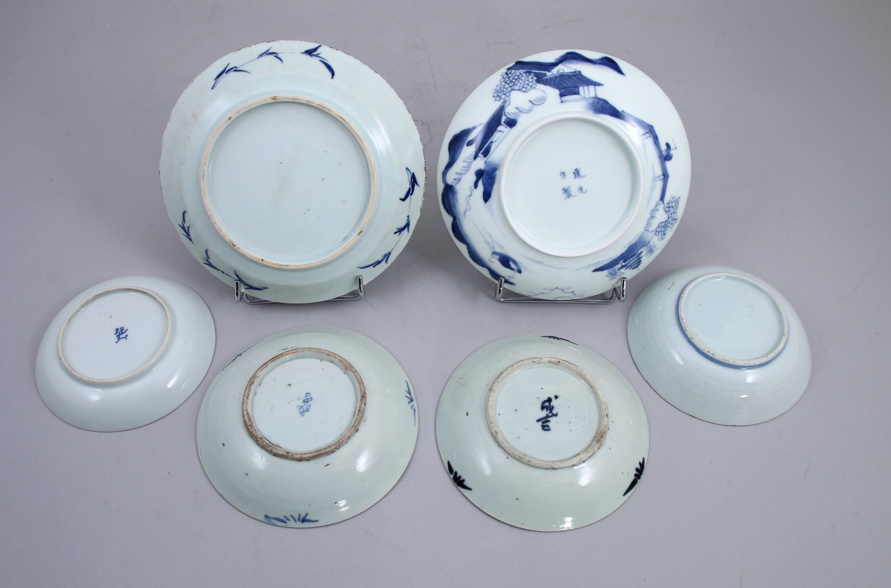 TROIS ASSIETTES et TROIS SOUCOUPES en porcelaine bleu blanc à décor de pièces de monnaie, chevaux, lotus et fleurs.
