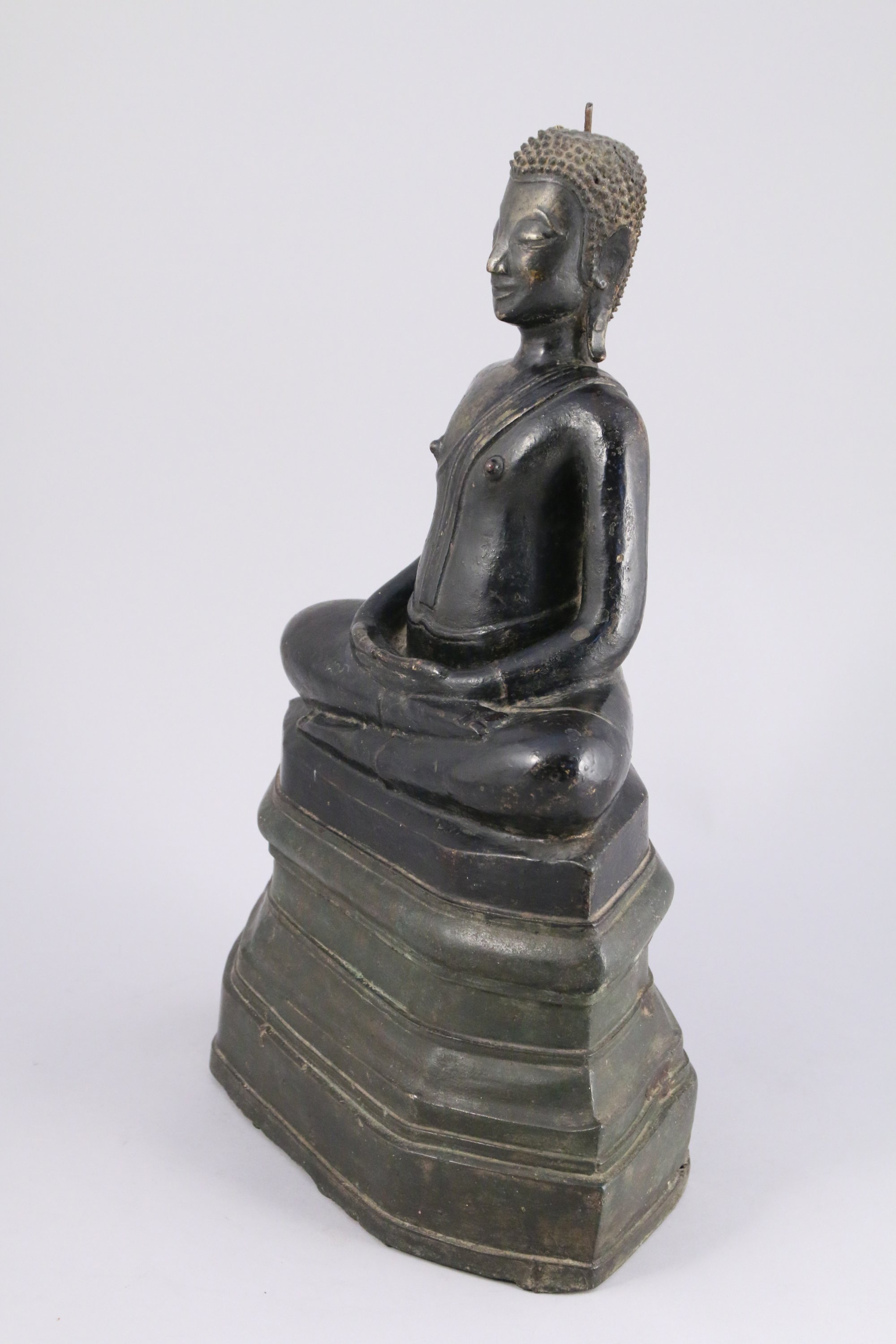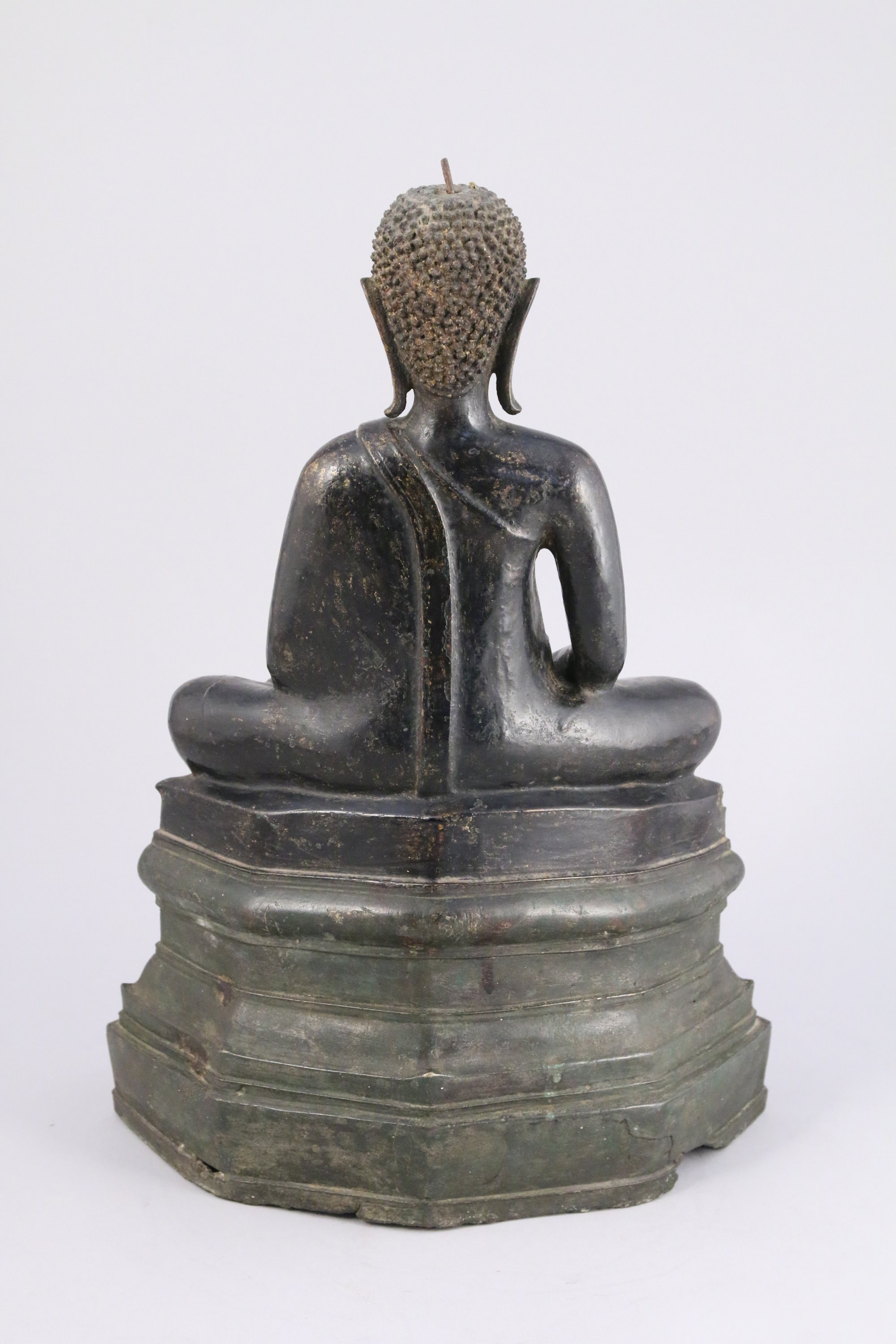 BOUDDHA en BRONZE à patine brune assis en padmasana sur son socle, les mains en bhumisparsa mudra (geste de la prise de la terre à témoin).
