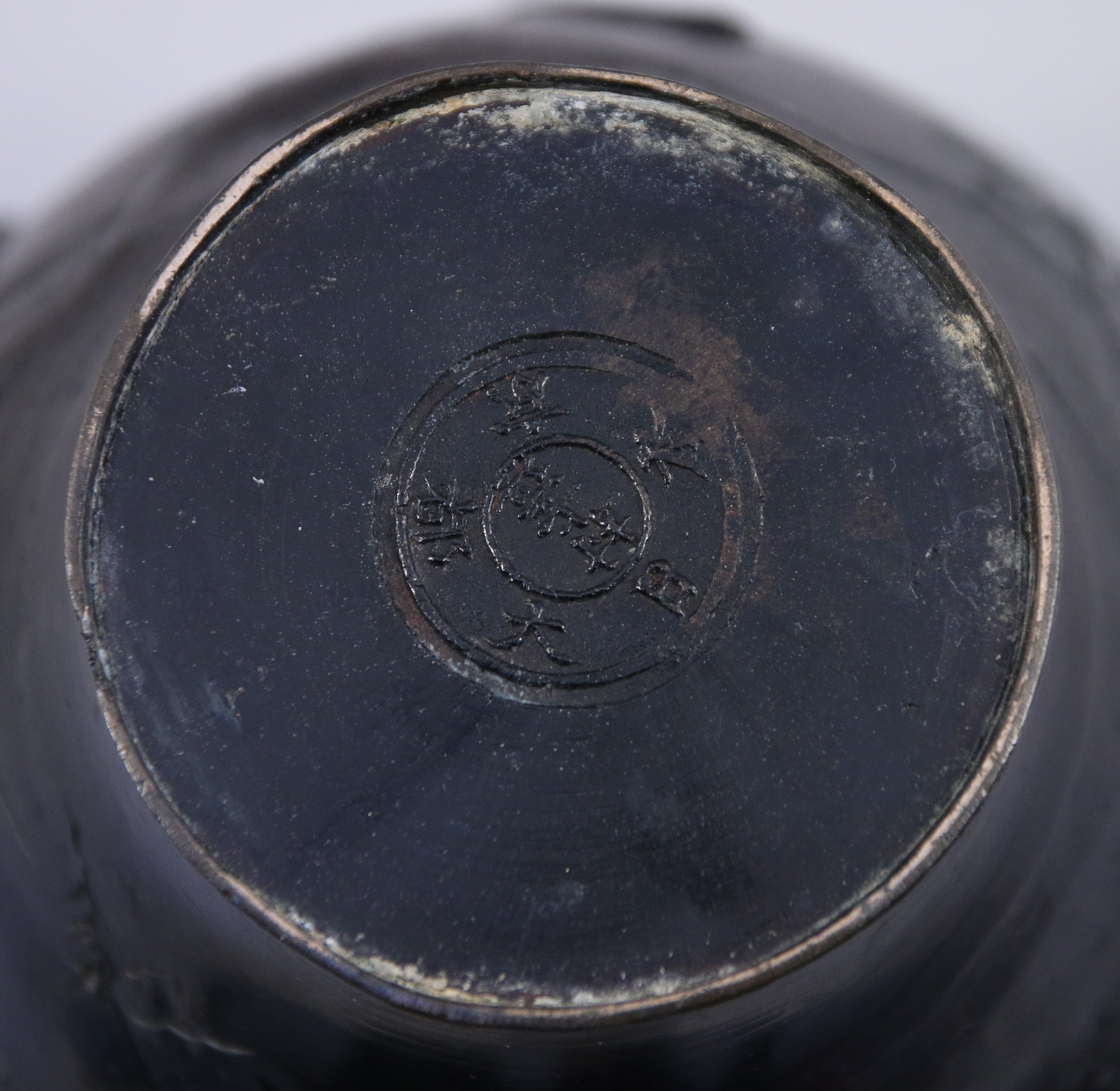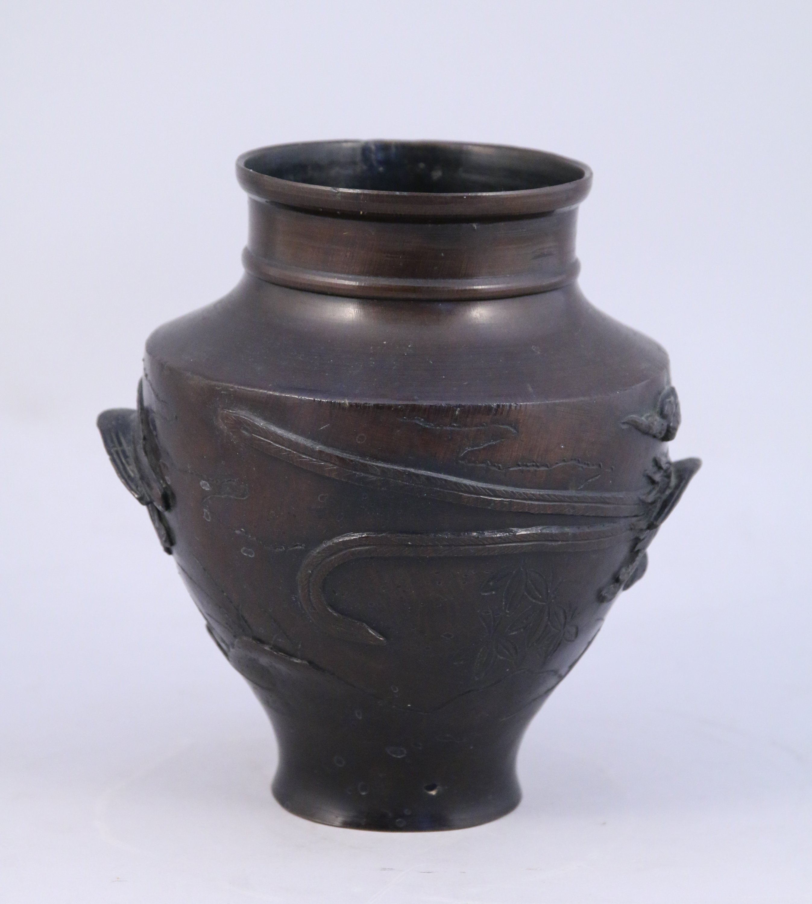 VASE balustre en bronze patiné à décor d'oiseaux dans un paysage. Cachet sous la base.