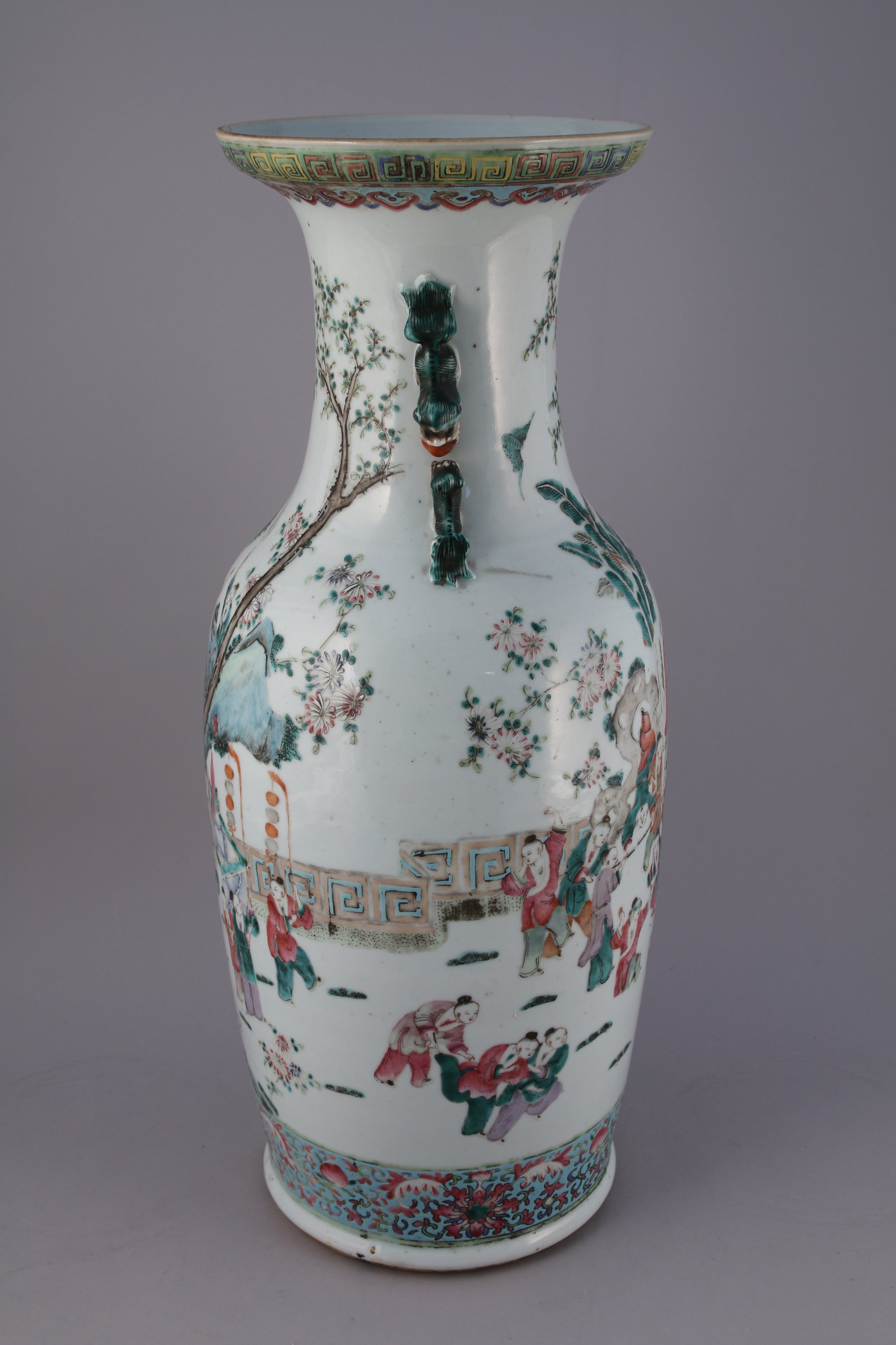 VASE de forme balustre en porcelaine émaillée polychrome à décor d'enfants jouant dans un jardin, deux anses en forme de deux chimères jouant avec une boule.
