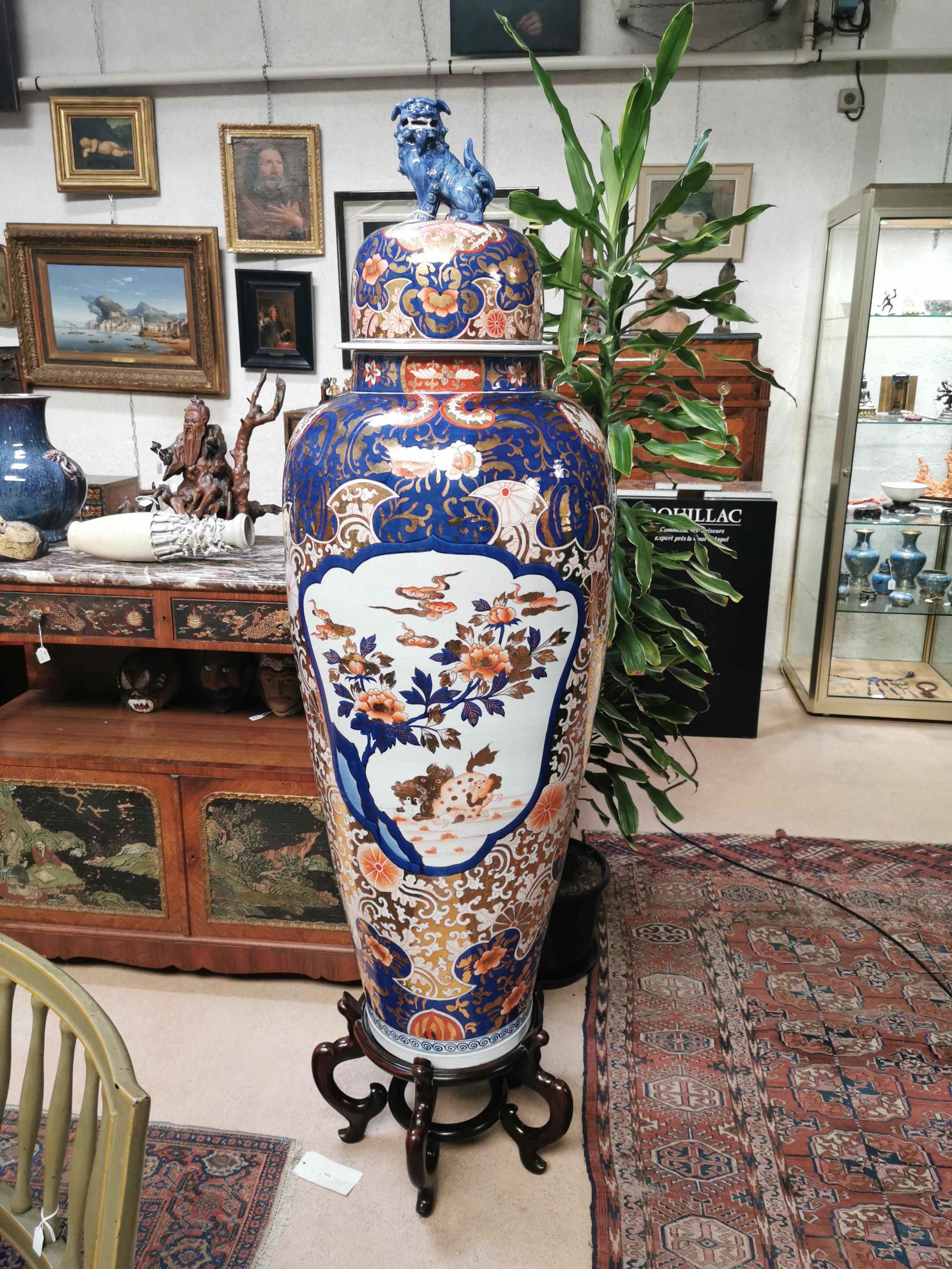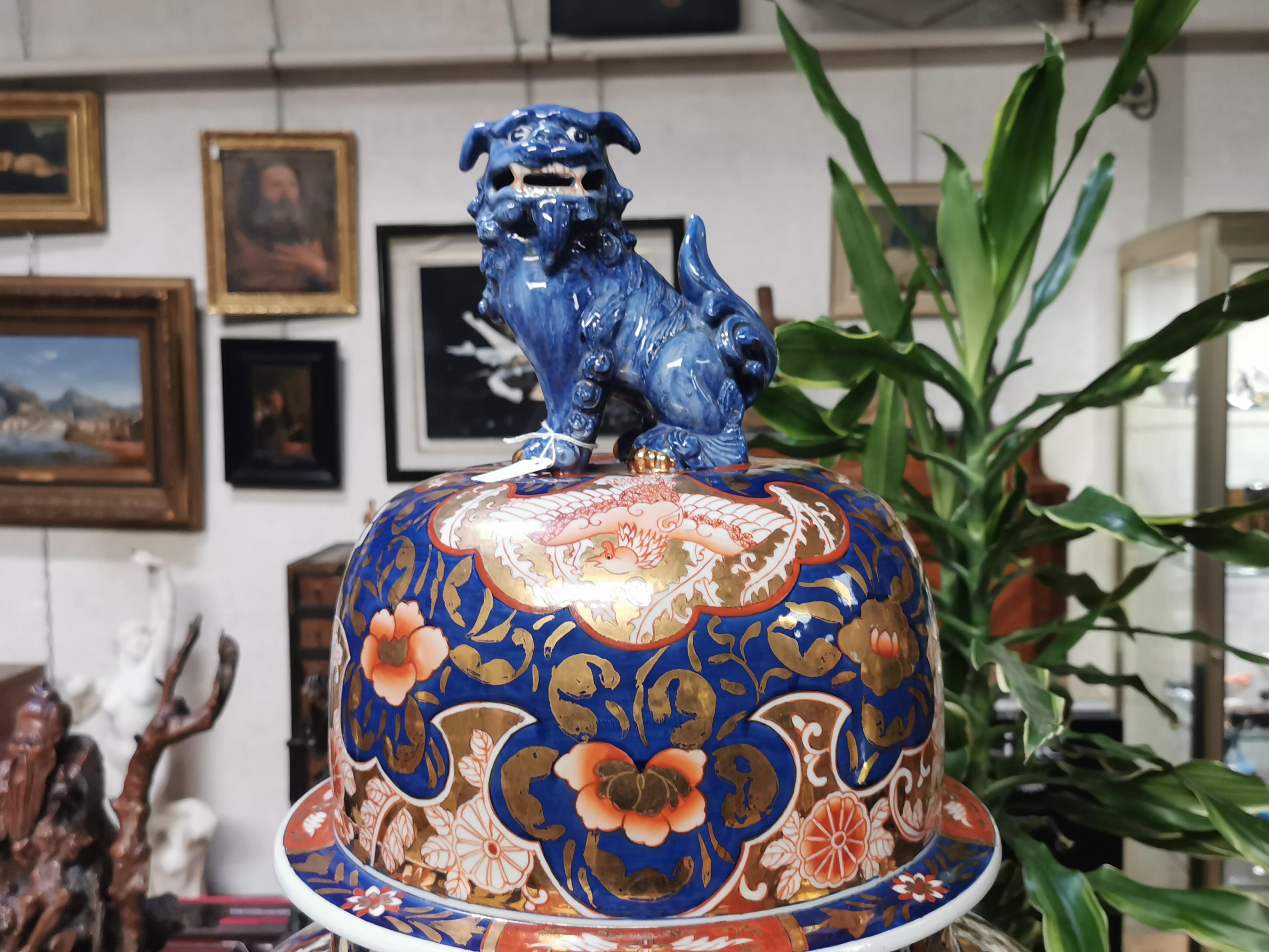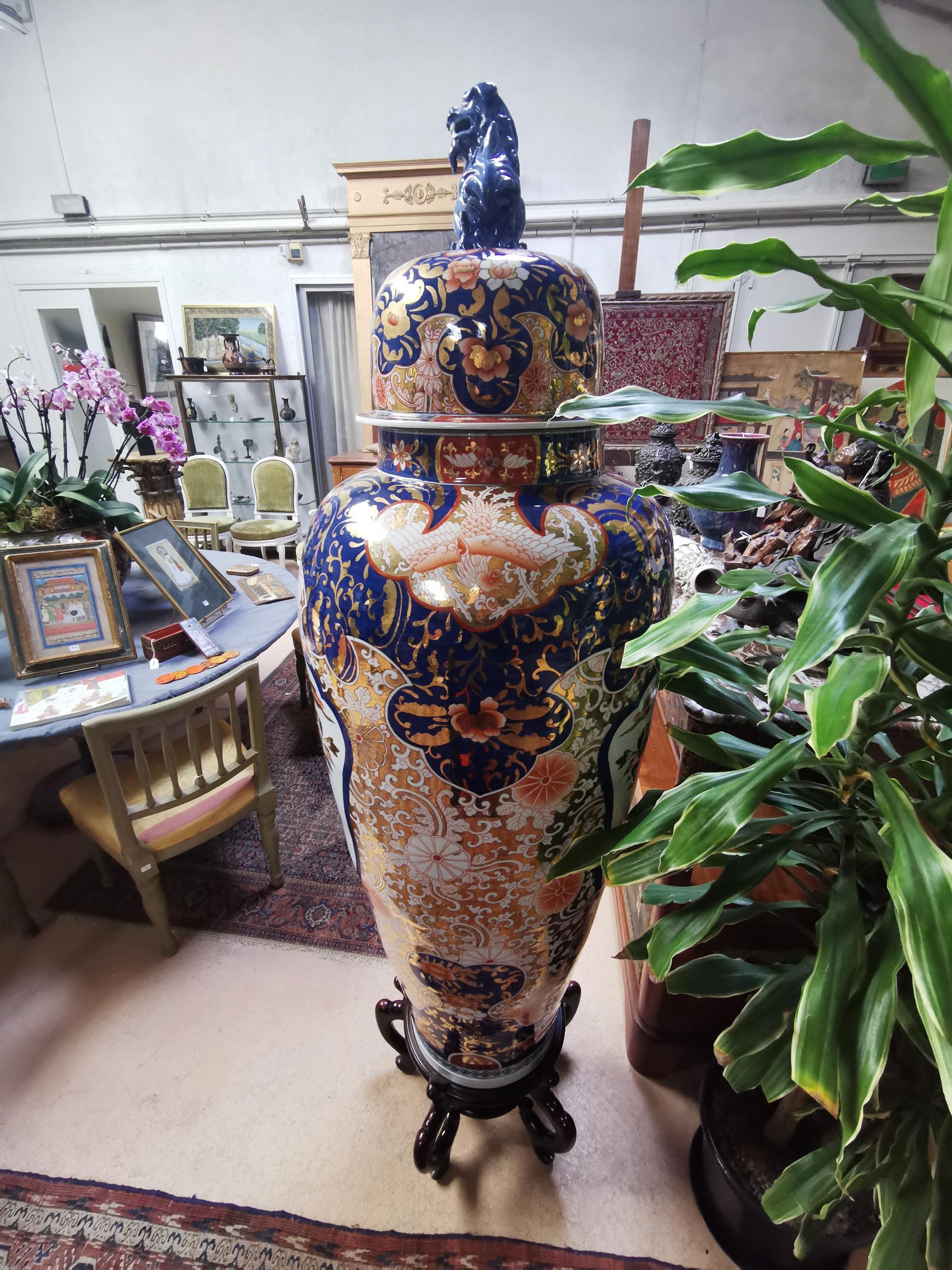 CHINE - Moderne. Grande POTICHE COUVERTE en porcelaine à décor Kakiemon et rehauts d'or figurant deux lions jouant sous un arbre dans un cartouche. Réserve avec des motifs feuillagés, des rinceaux et des phénix.
