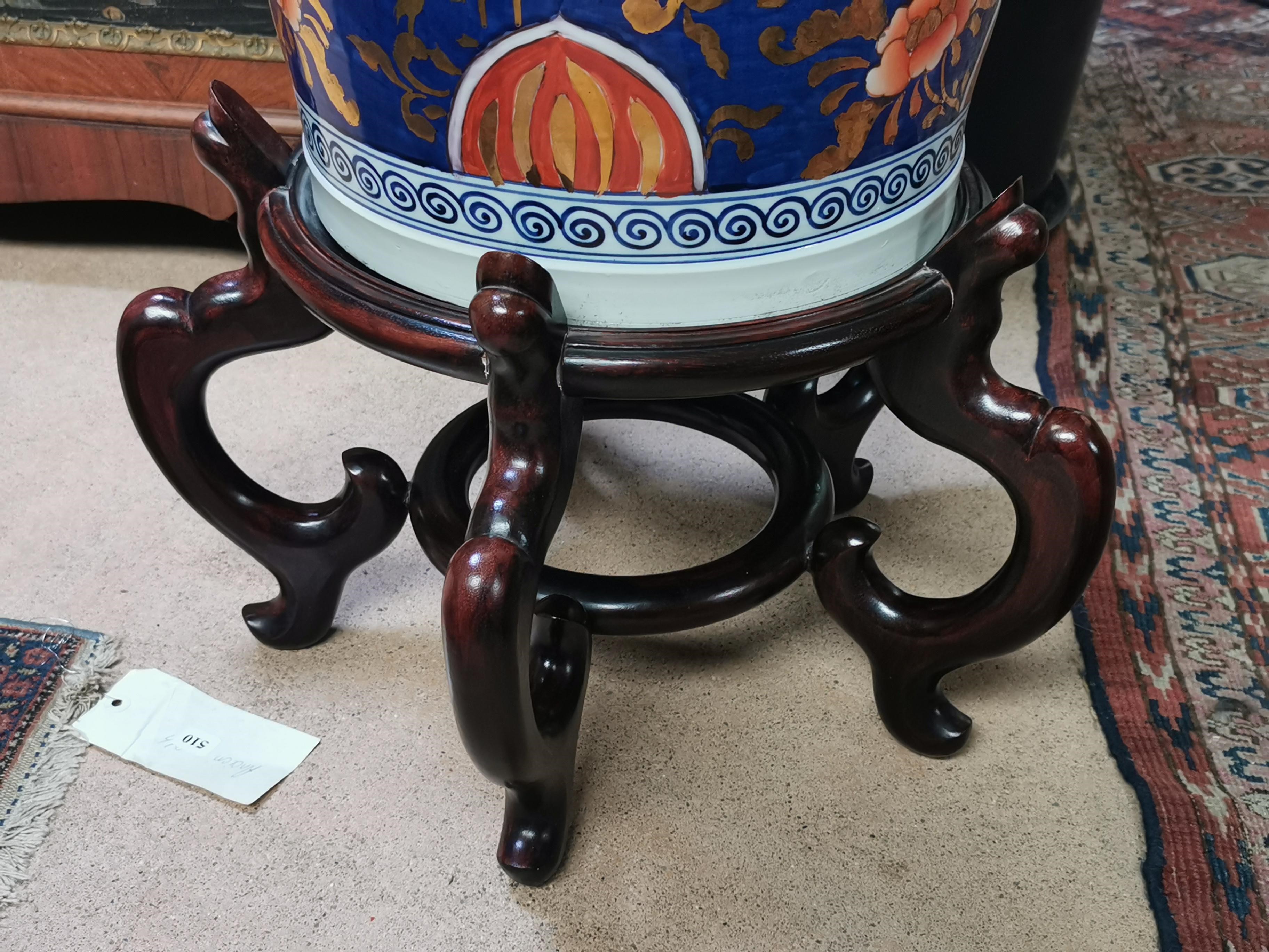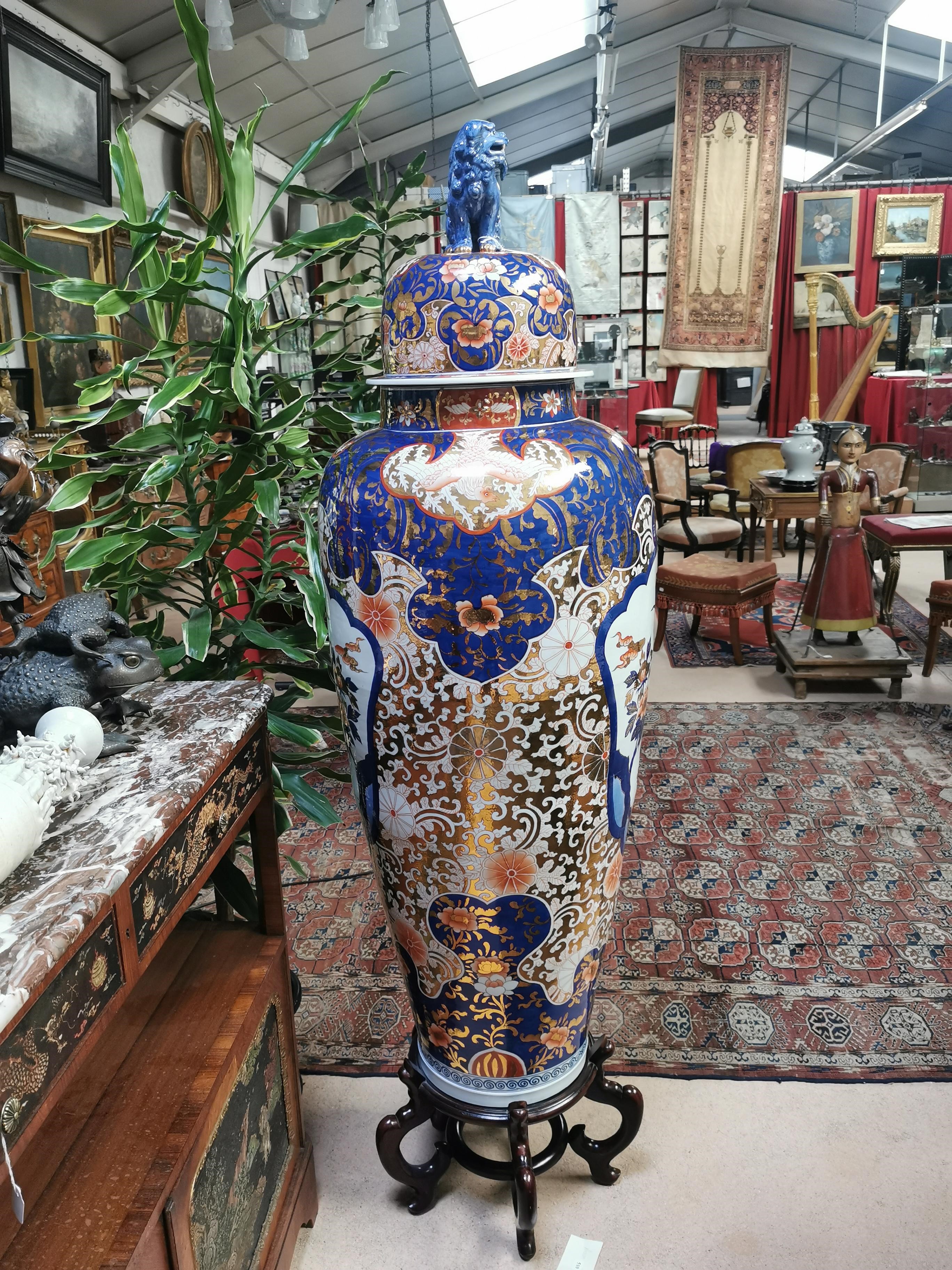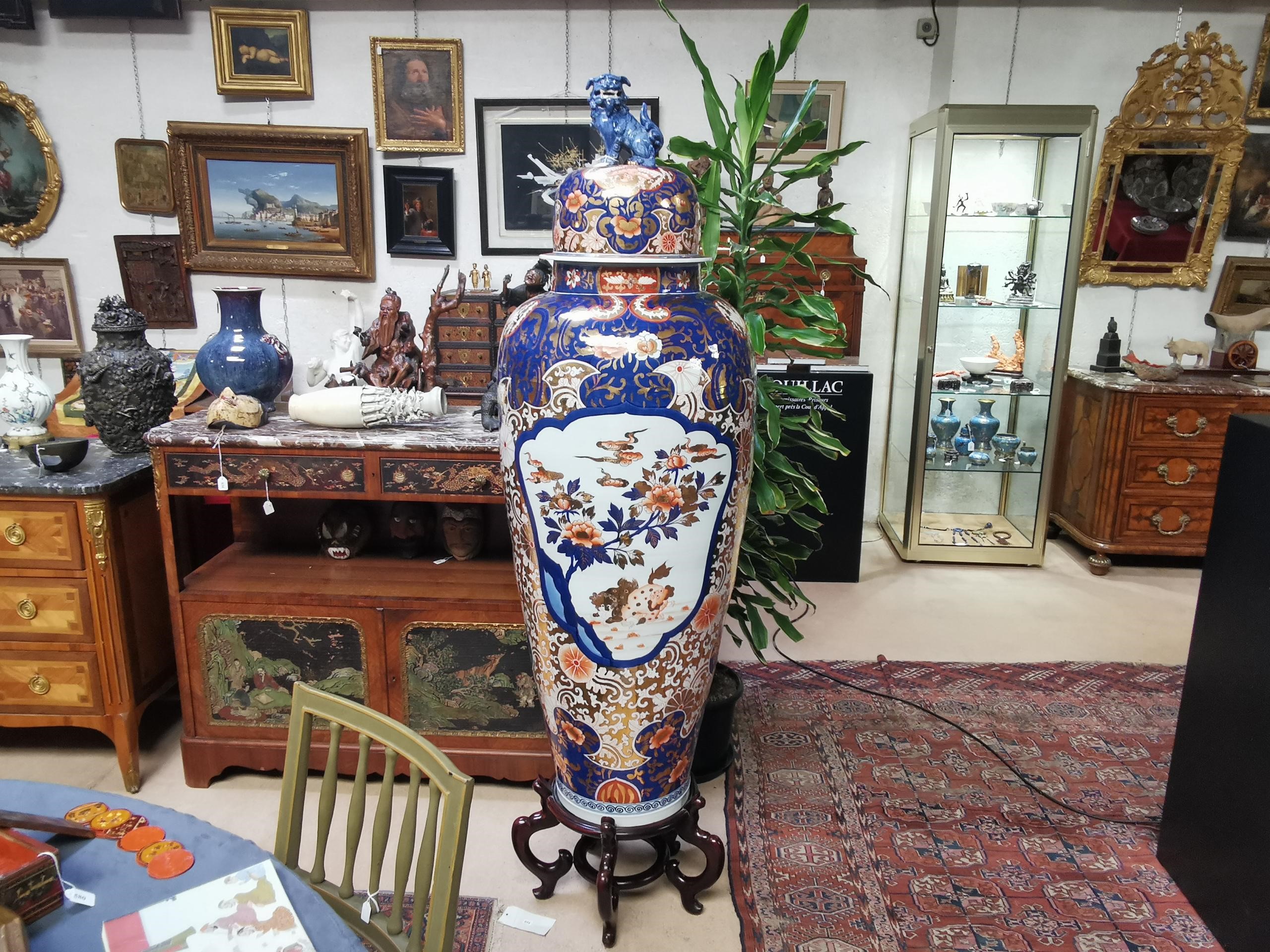 CHINE - Moderne. Grande POTICHE COUVERTE en porcelaine à décor Kakiemon et rehauts d'or figurant deux lions jouant sous un arbre dans un cartouche. Réserve avec des motifs feuillagés, des rinceaux et des phénix.