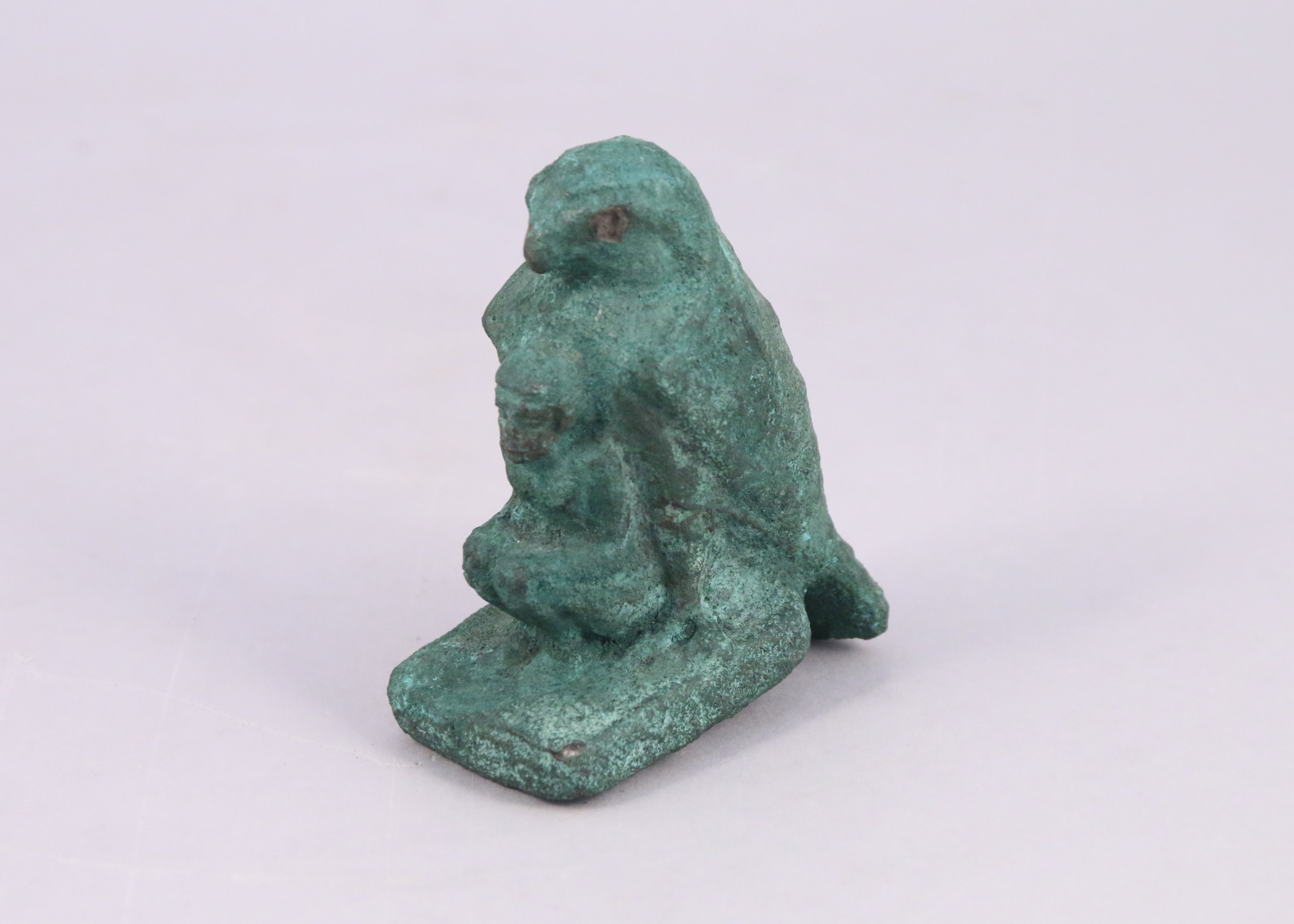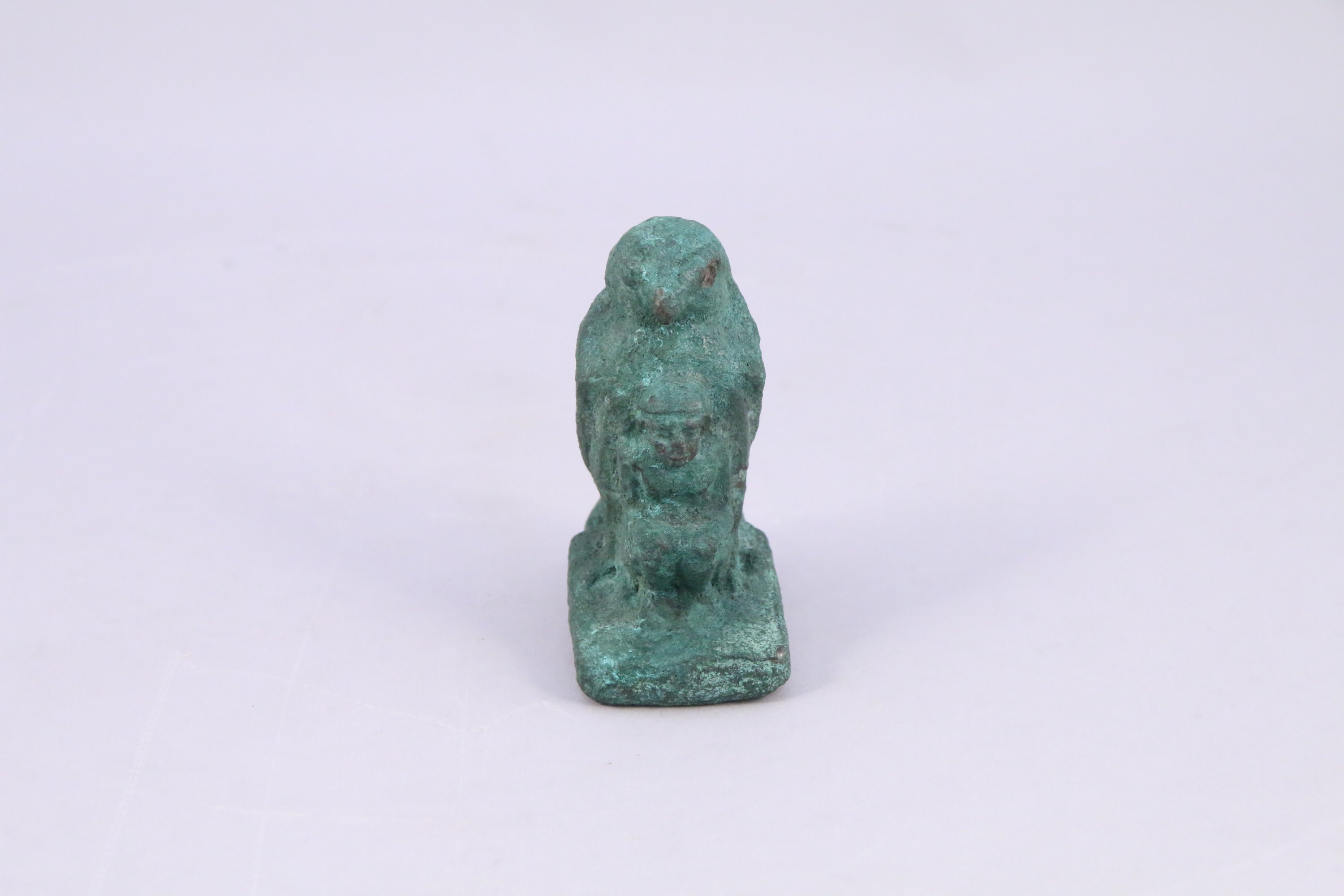 STATUETTE en bronze figurant un faucon protégeant un personnage accroupi. Ce type de représentation, qui reste assez rare, serait attesté dès la VIe dynastie (2323-2150 av. J.-C.) par une statue de cuivre découverte dans le sanctuaire d’Horus à Hiérakonpolis. La position accroupie rappelle la statue de Ramsès II protégé par Houroun/Horus, trouvée à Tanis par P. Montet et conservée au Musée du Caire. Le thème fut ensuite repris sous le Pharaon Nectanébo II (360-343 av. J.-C.) comme en témoignent trois statues célèbres conservées au Louvre, au Metropolitan Museum de New-York et au musée du Caire. Il perdura aussi à la période hellénistique dans le temple d’Edfou.