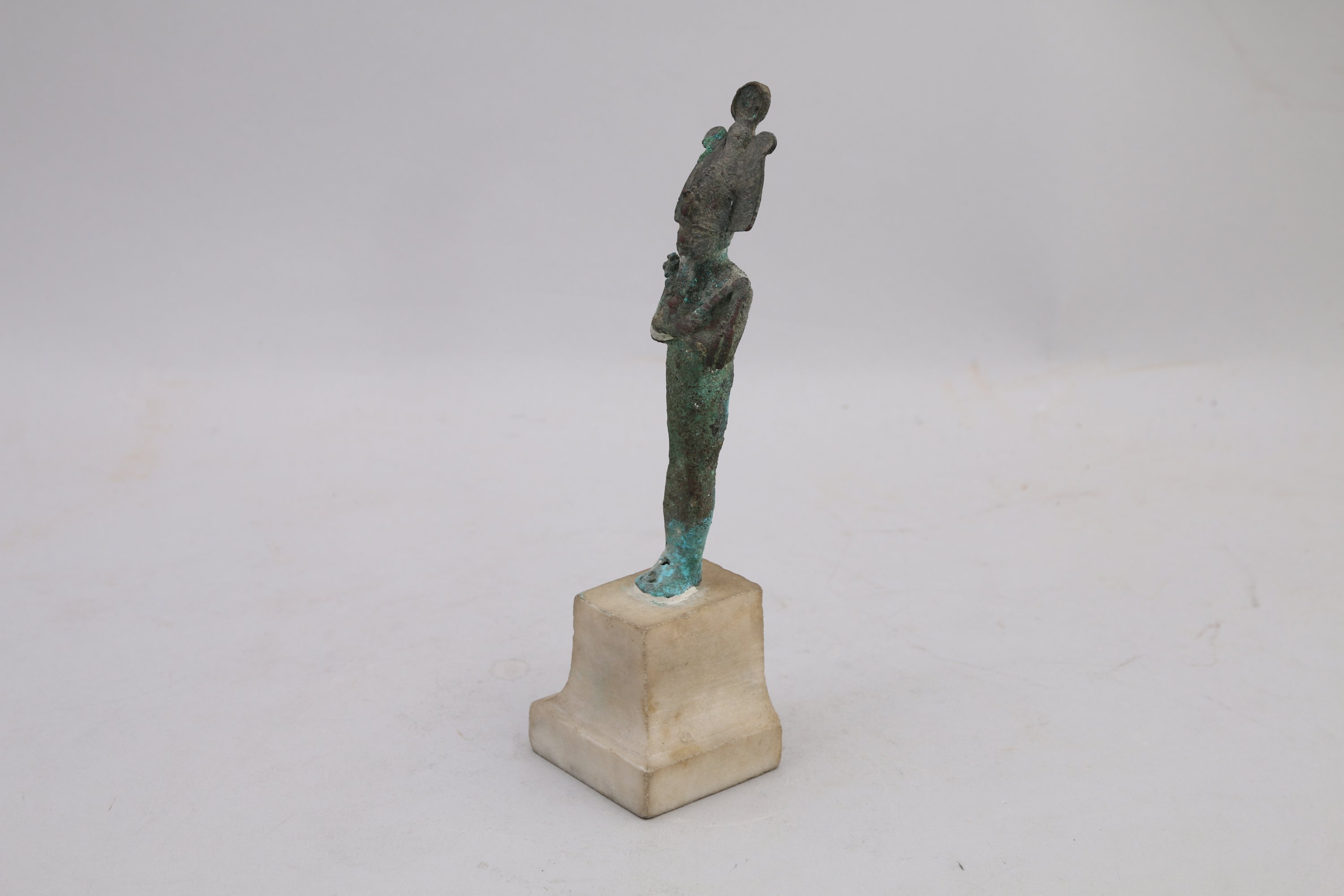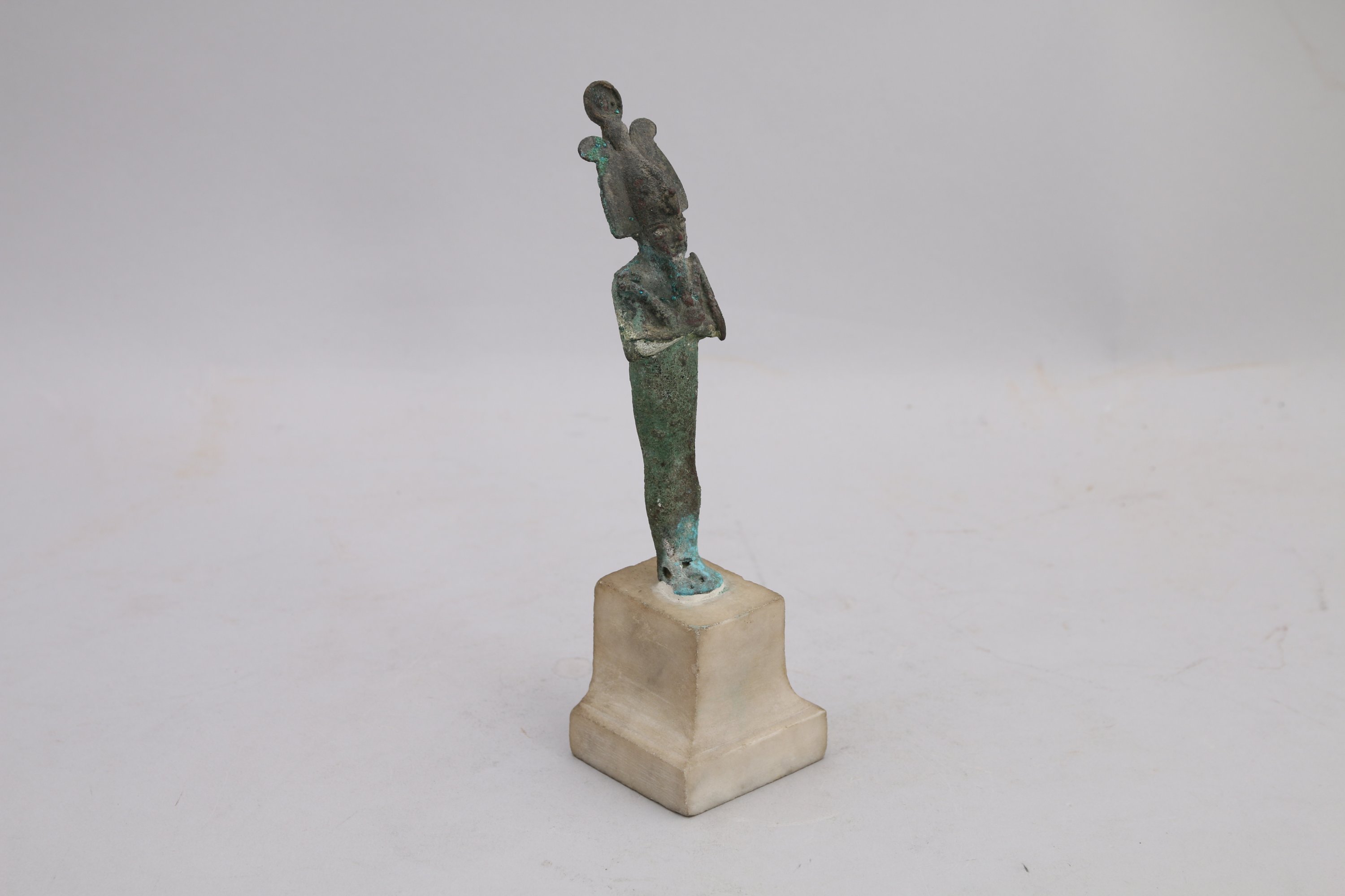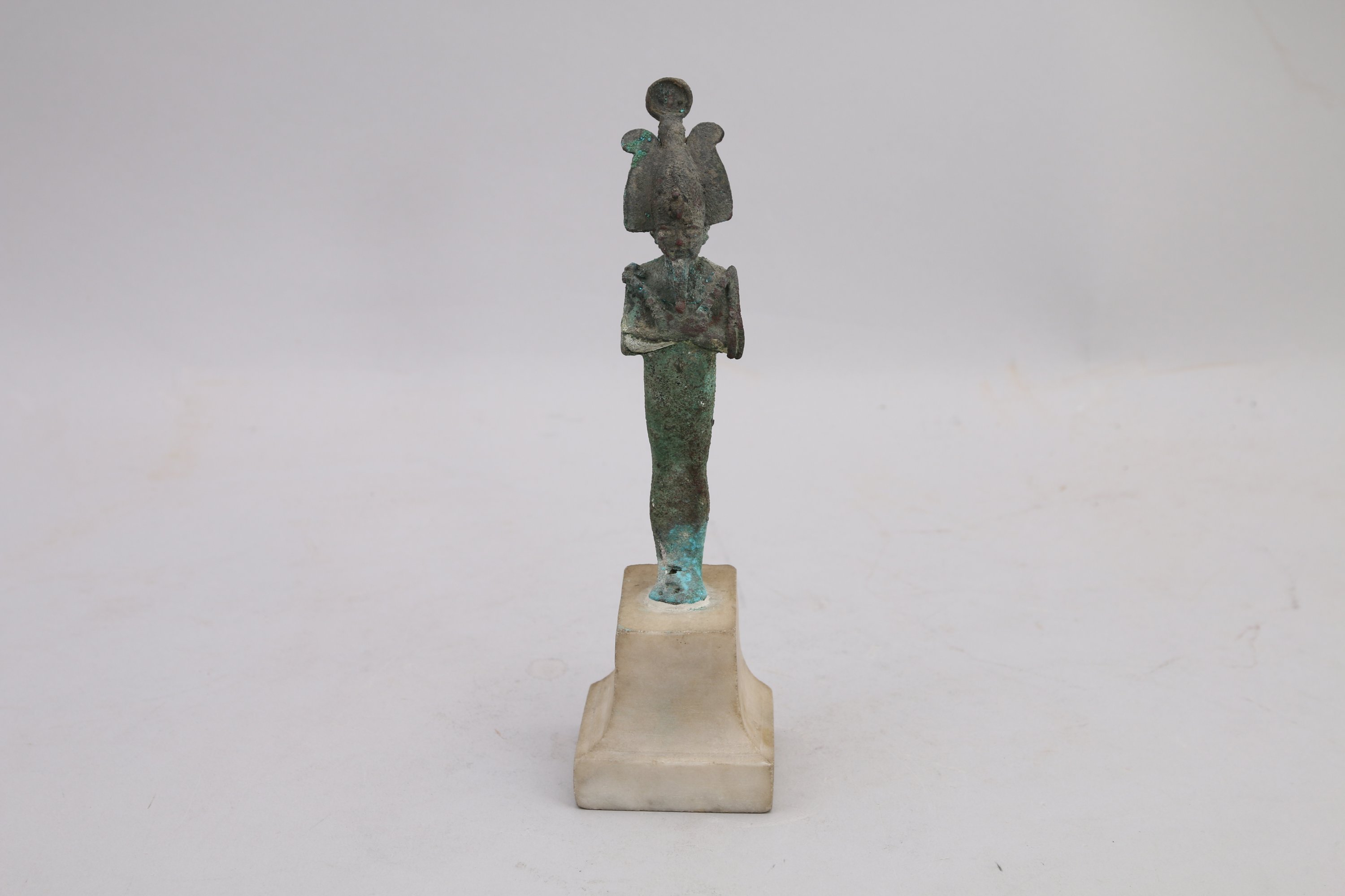 STATUETTE en bronze dOsiris momiforme coiffé de la couronne atef et portant une barbe postiche rattachée à sa poitrine par une petite baguette. Ses mains croisées sur la poitrine tiennent le sceptre Héka et le flagellum Nékhekh. Fonte creuse. Yeux incrustés.