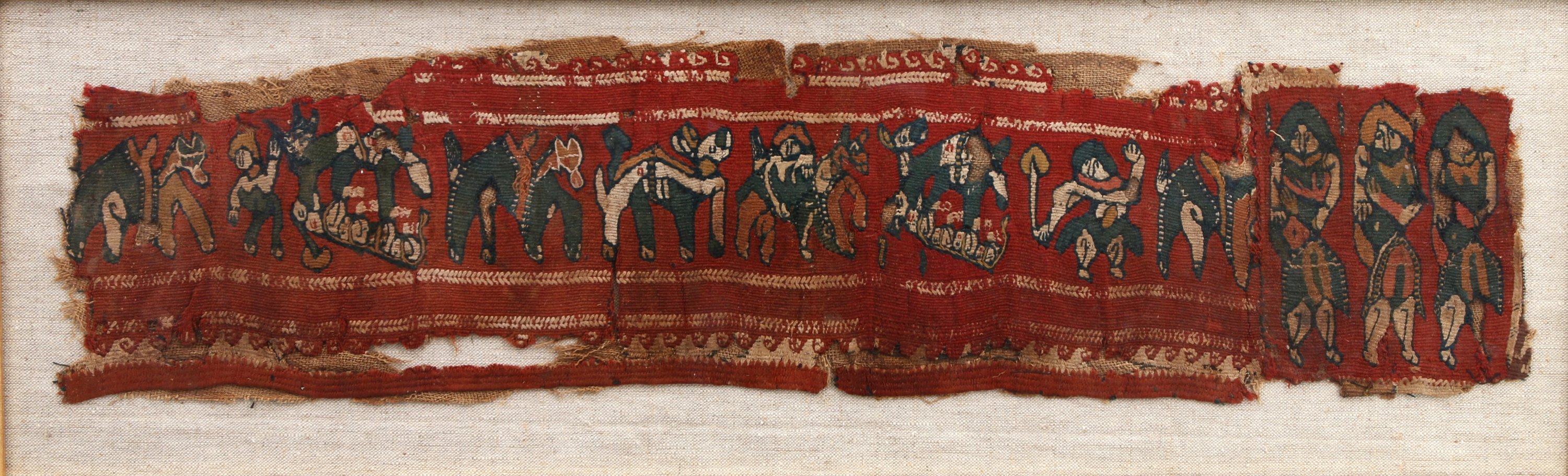 Bandeau en tapisserie copte, fond rouge, décor crème et noir de dromadaires et personnages