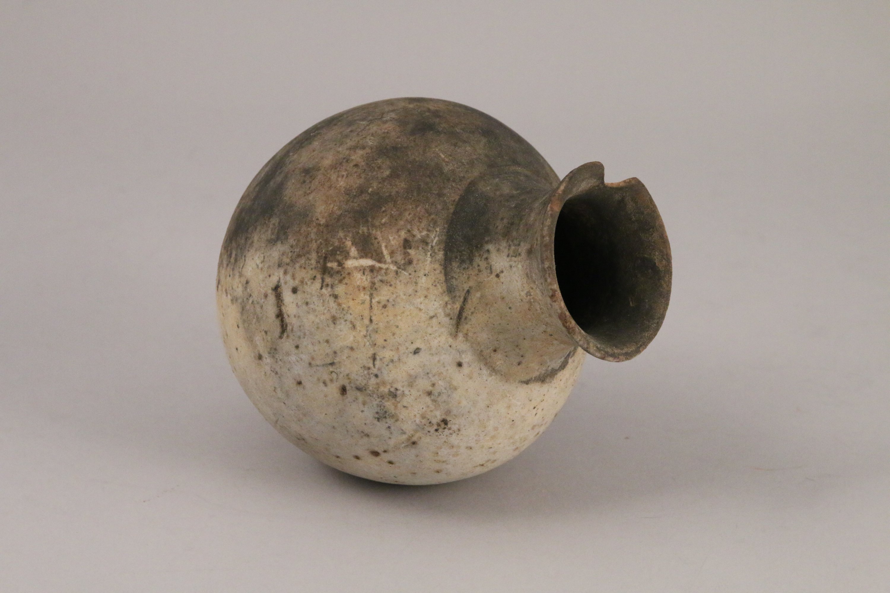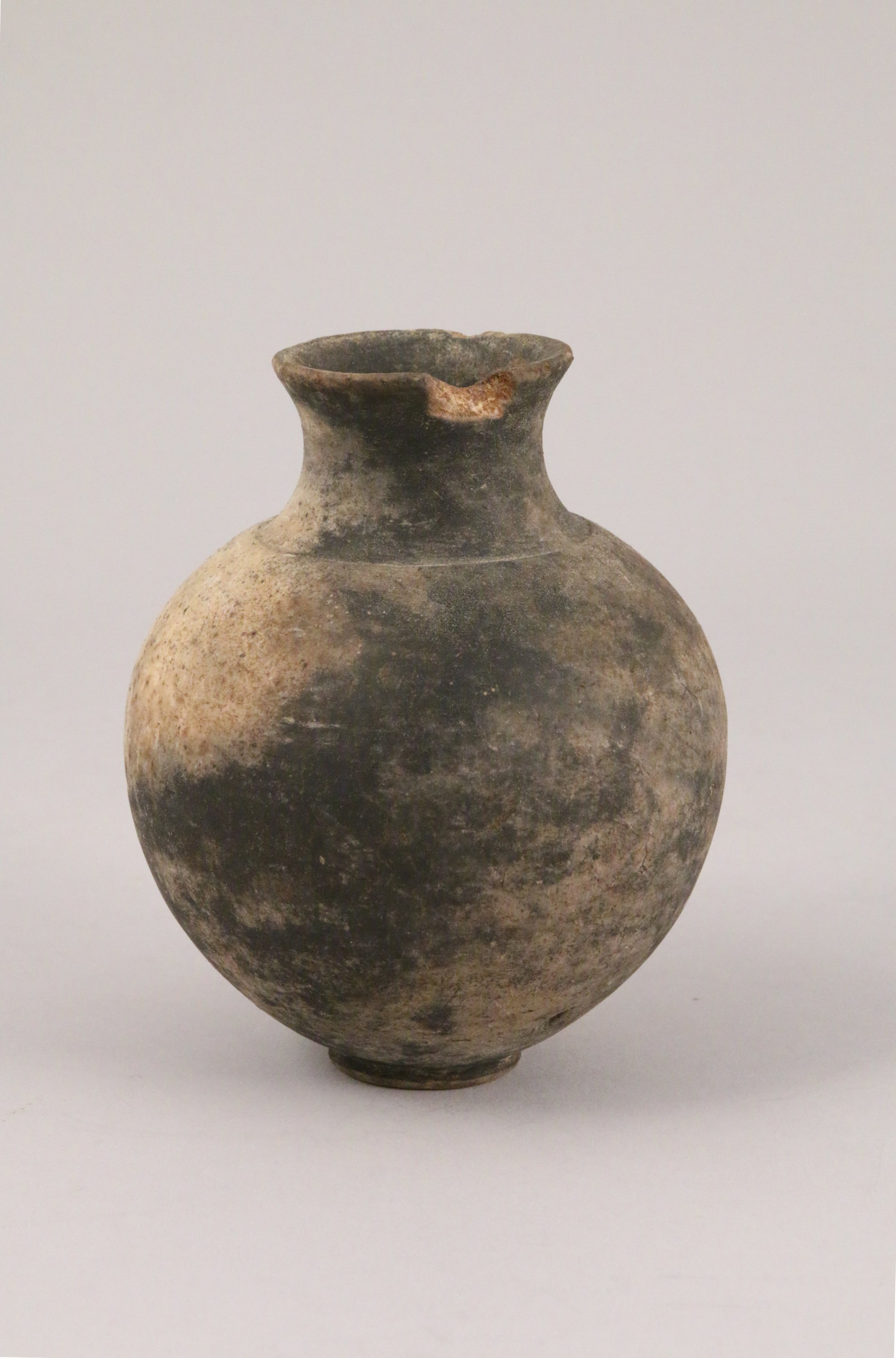 VASE à panse ronde en terre cuite grise découvert à Soings-en-Sologne, accompagné d’une ancienne fiche de collection enroulée à l’intérieur indiquant : « Vase gallo-romain, don du Dr Pierre Filloux, provenant des fouilles de Soings, le 6 février 1933 ». Sur la carte postale jointe, correspond au 5ème vase à partir la gauche sur la rangée du bas.