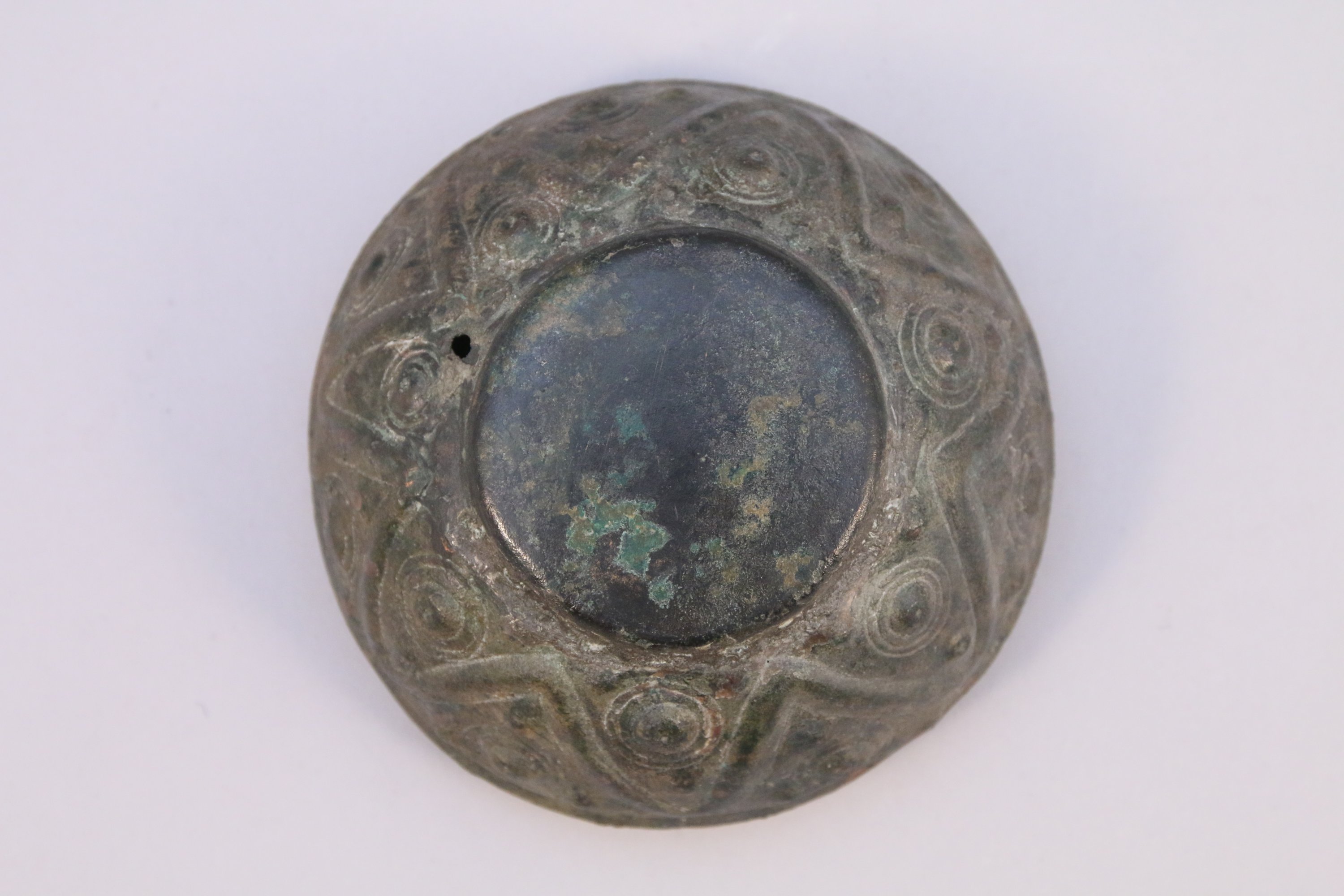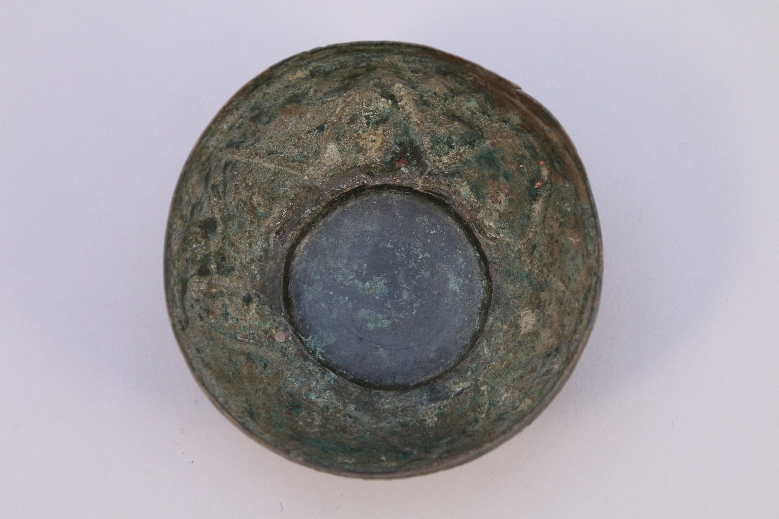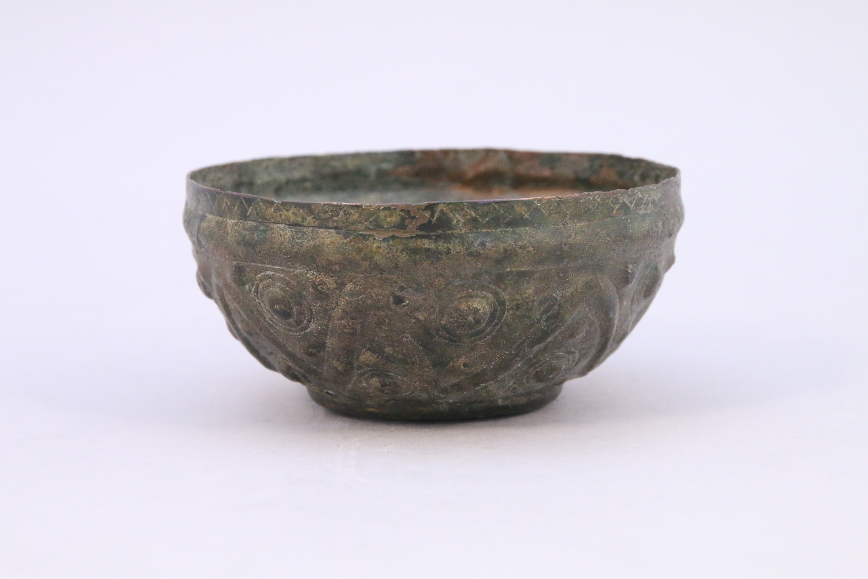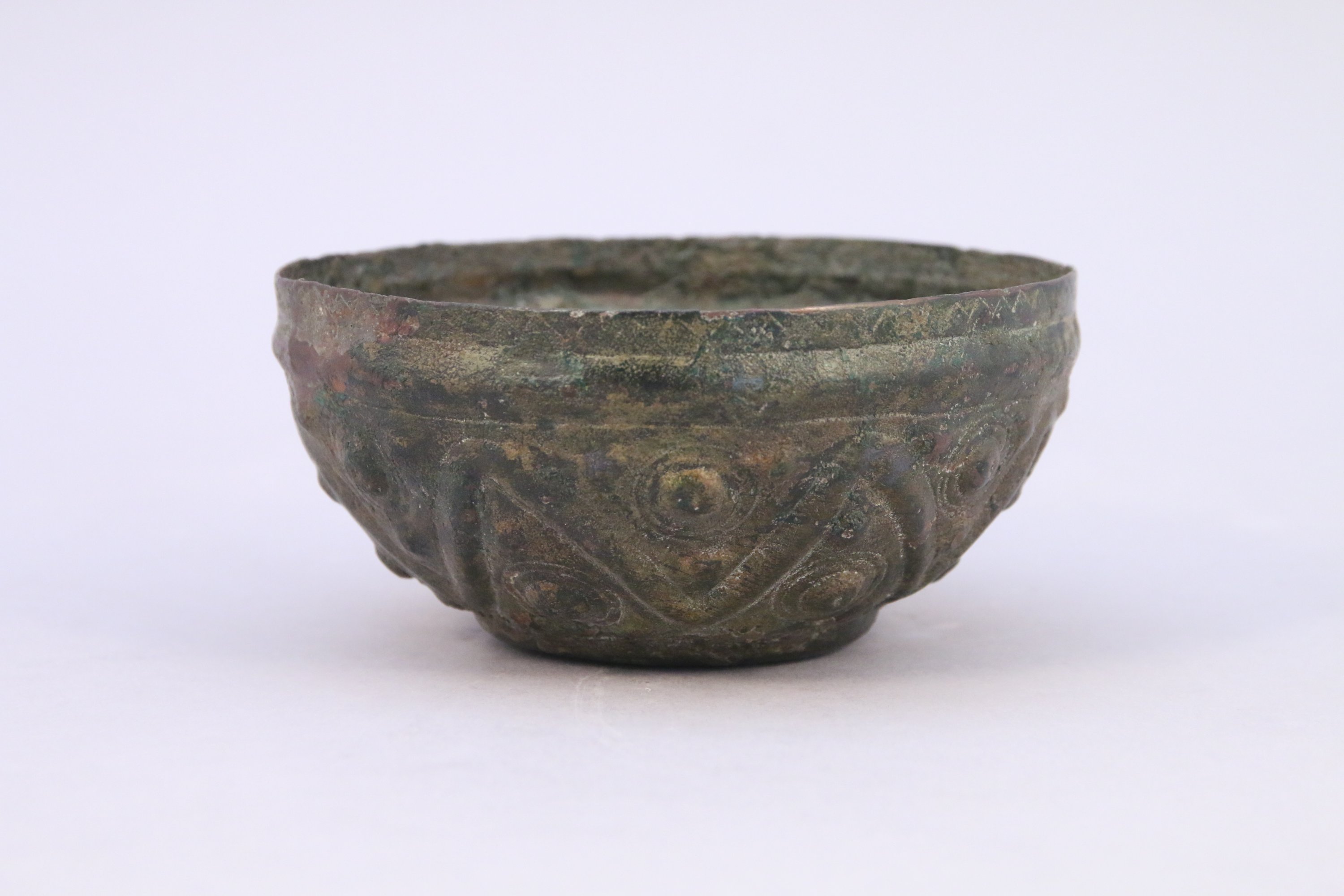 COUPELLE en cuivre décorée au repoussé de motifs géométriques. Fond restauré, reste un petit trou.