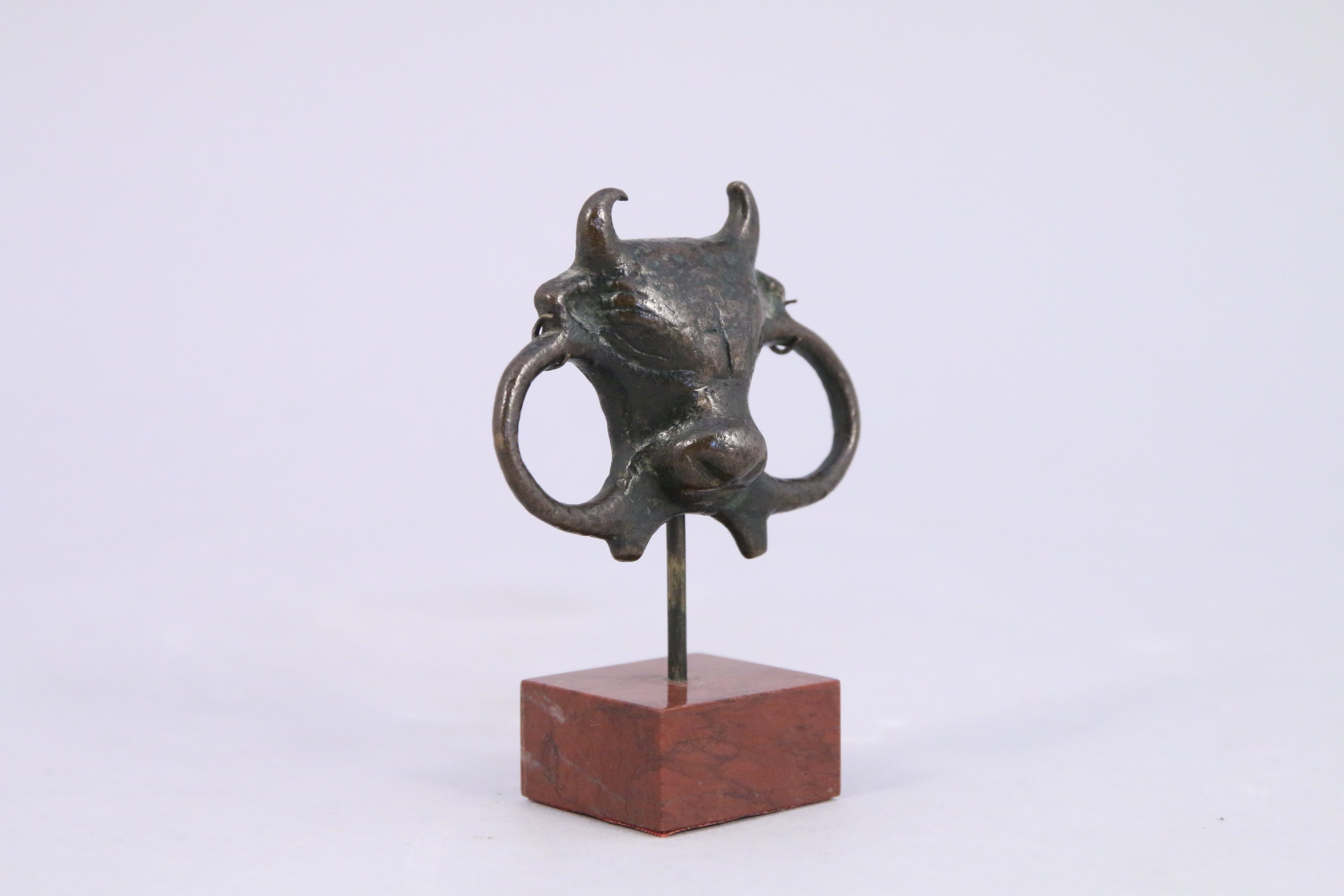 ÉLÉMENT d’HARNACHEMENT en bronze figurant une tête de taureau de face avec trois cercles. Ancien numéro de collection sous le socle.
