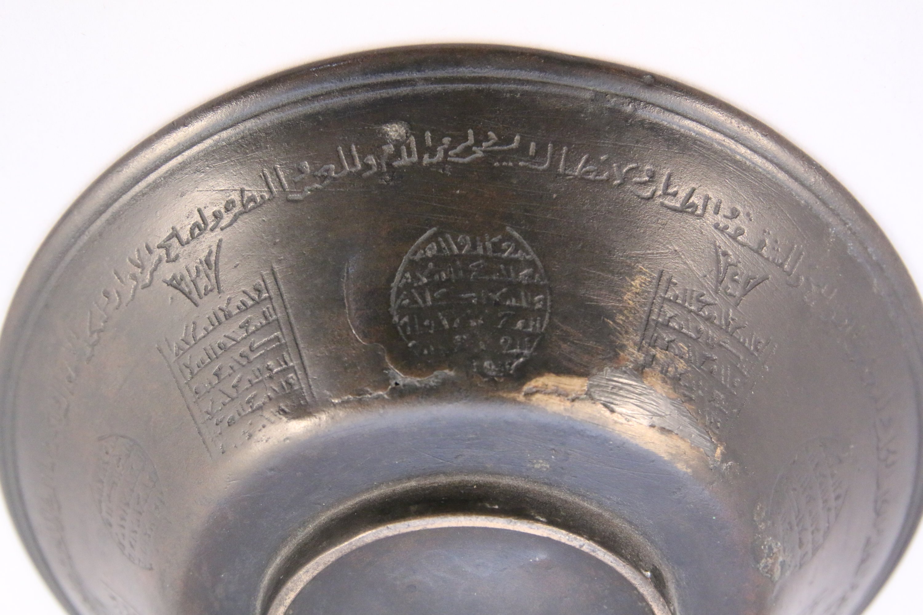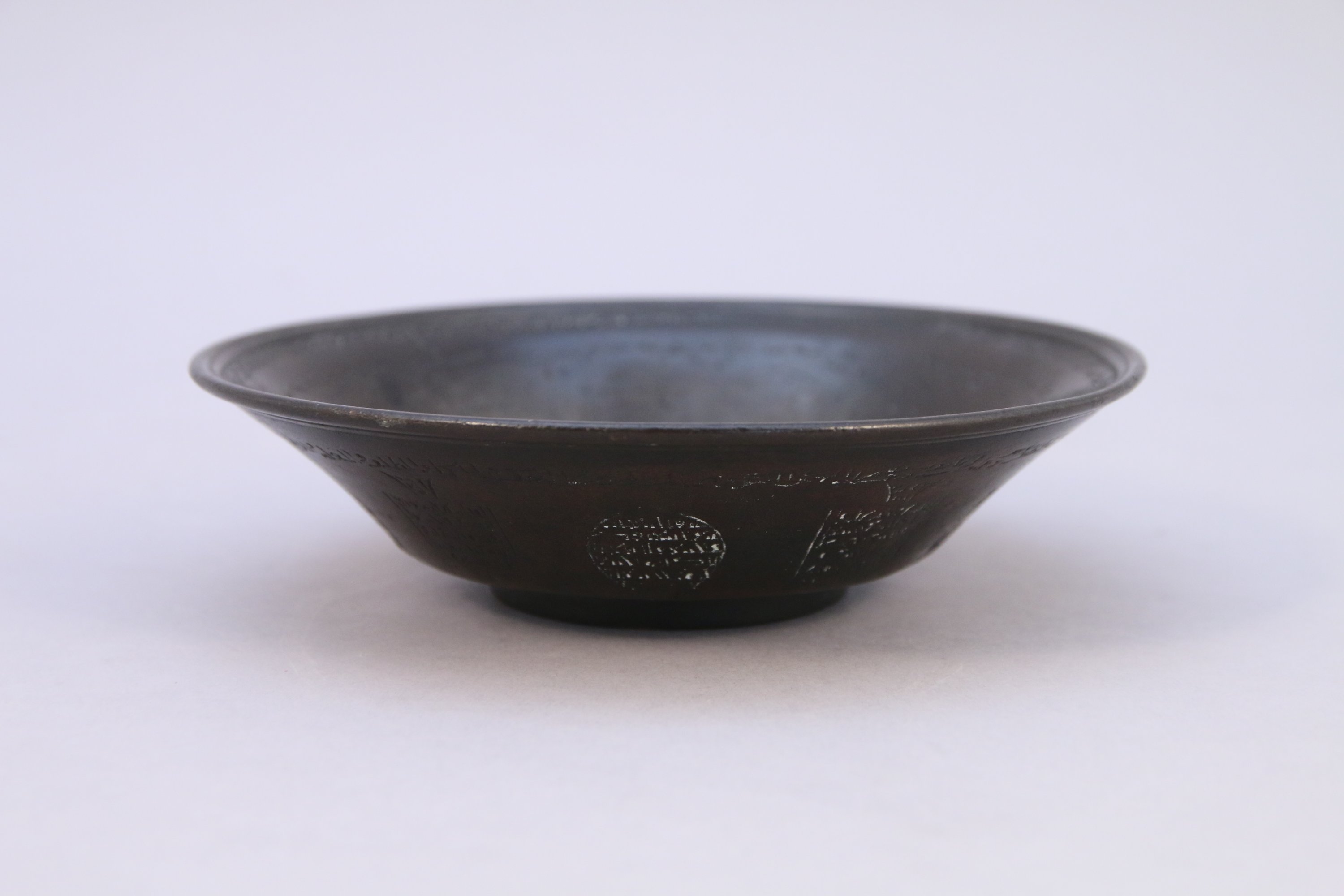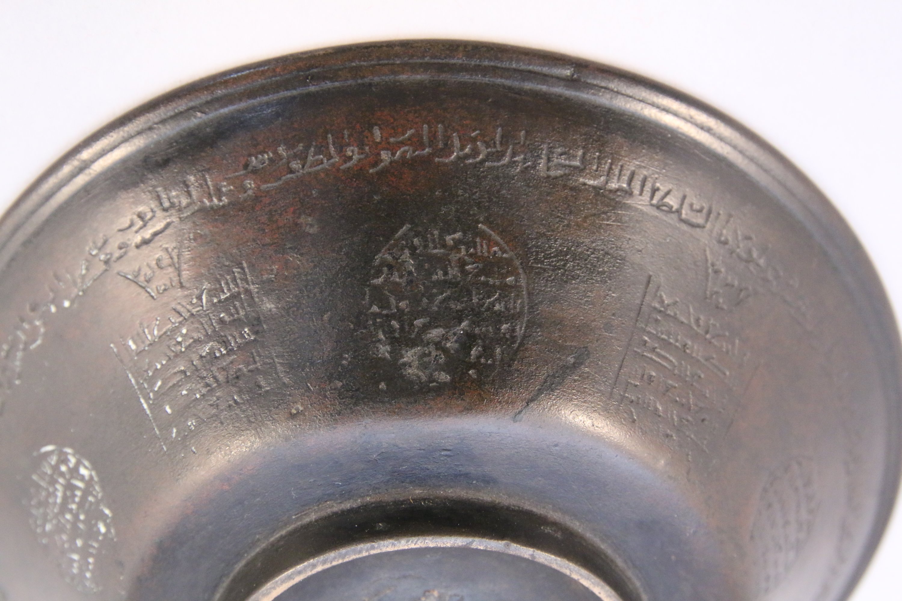 COUPE MAGIQUE en bronze, de forme évasée sur petit pied circulaire à décor gravé sur ses parois interne et externe d’inscriptions en arabe et de signes non identifiés, certains contenus dans des médaillons ou des cartouches.