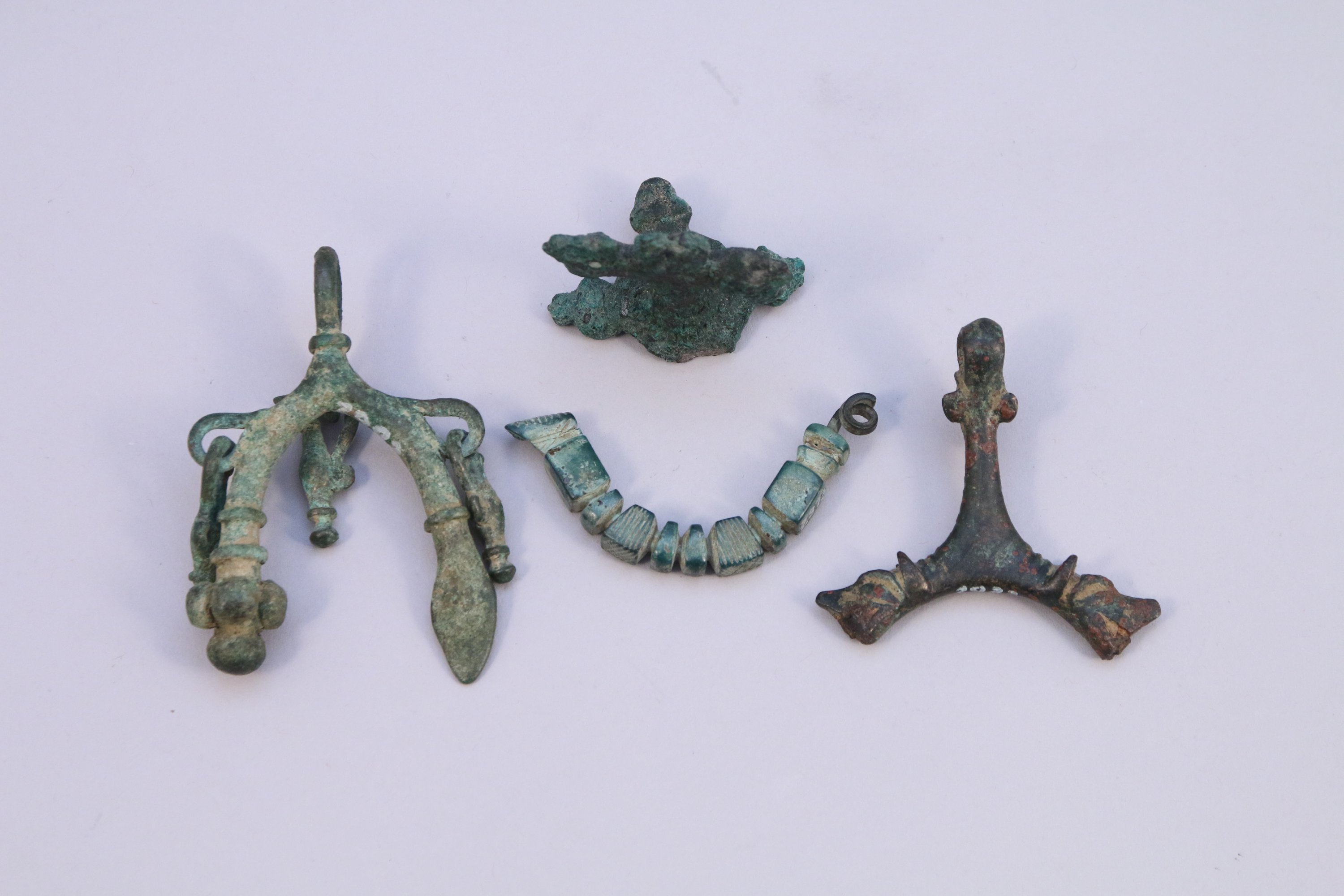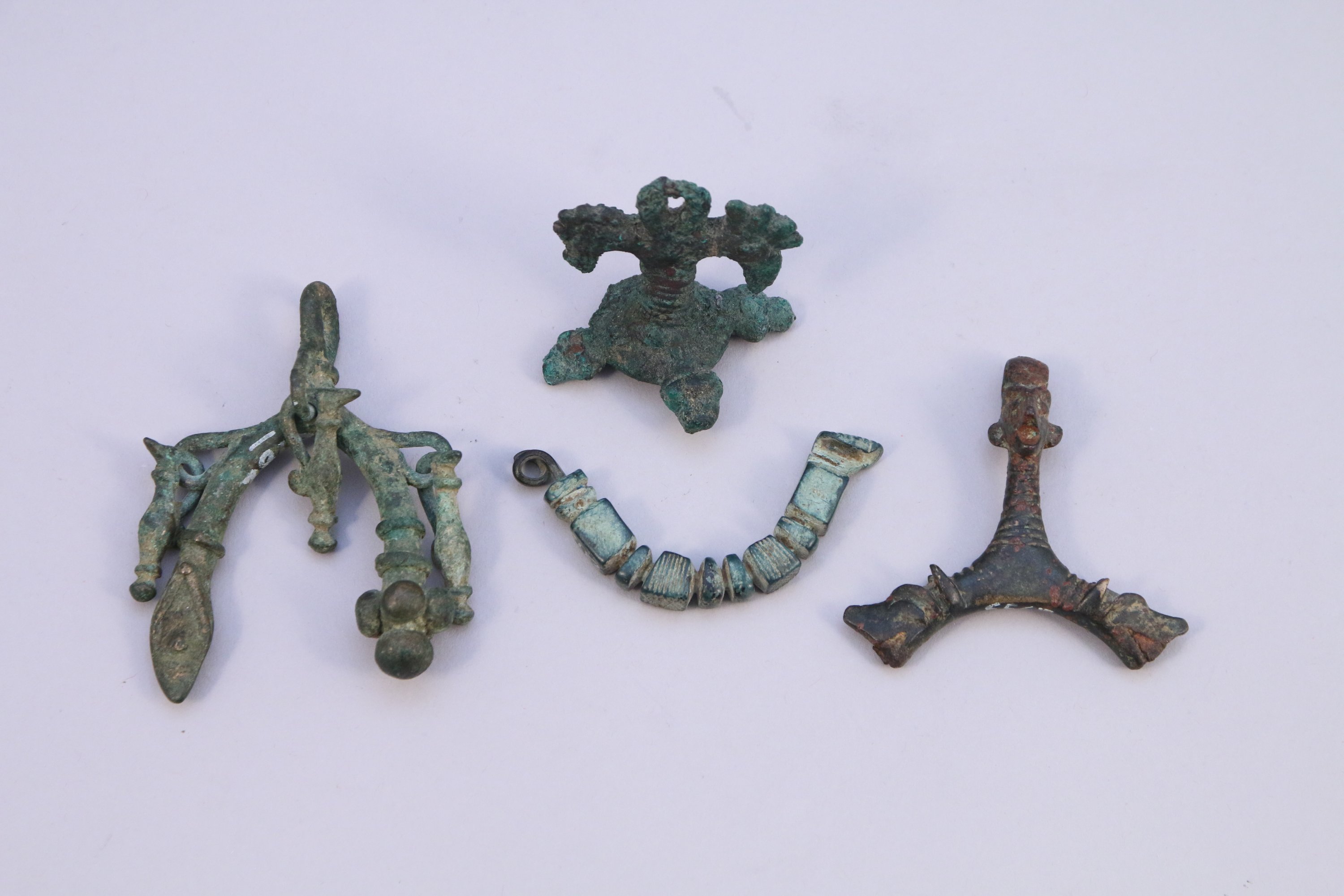TROIS PENDANTS en bronze à décors symétriques anthropomorphe, zoomorphe et d’aiguières.