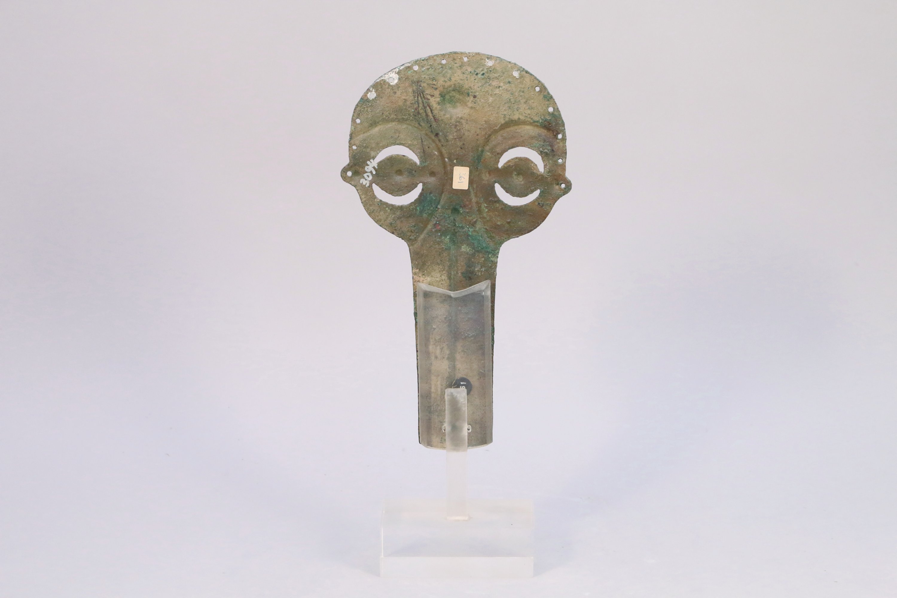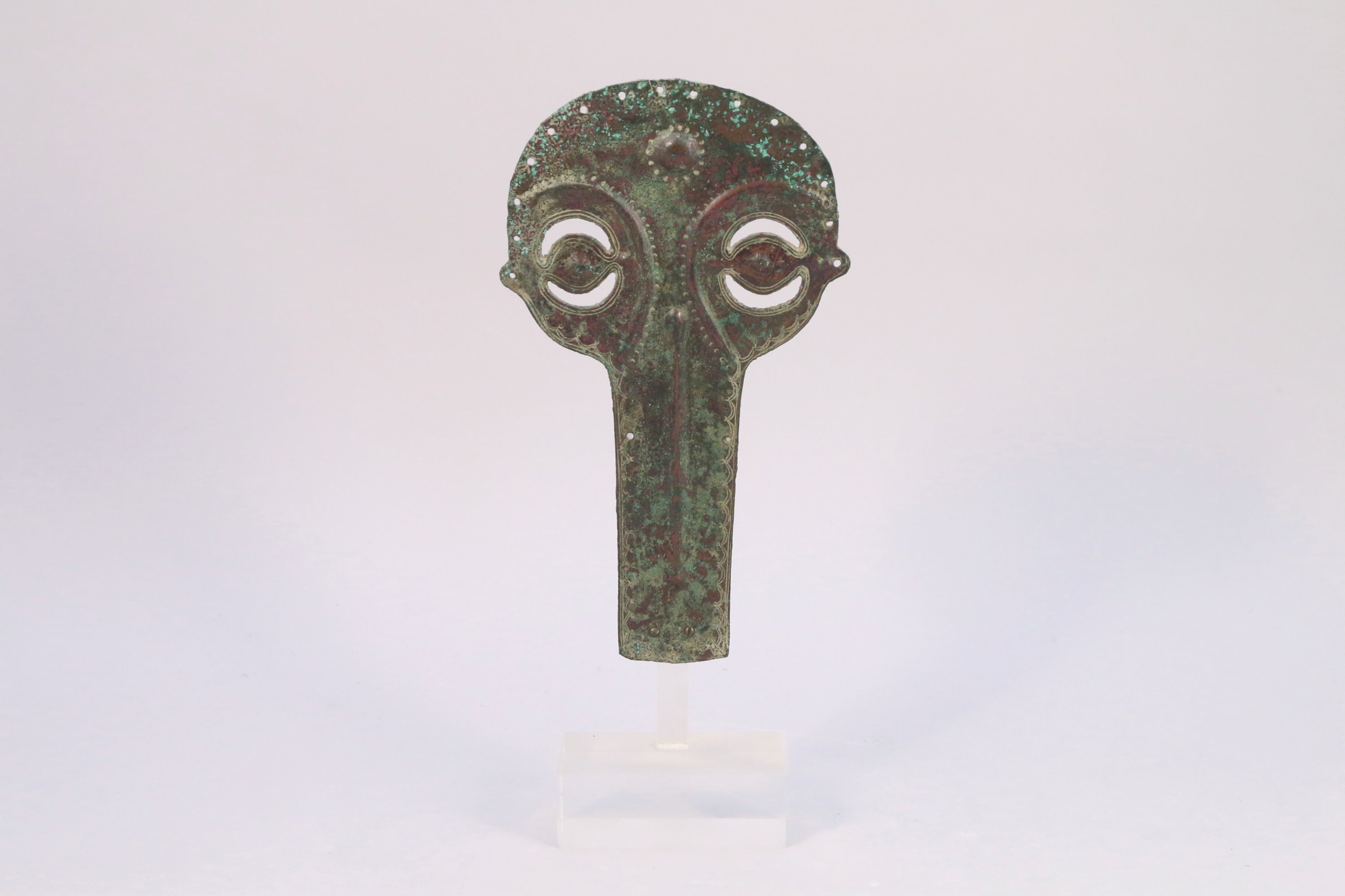 Exceptionnel CHANFREIN (protection pour la tête d’un cheval) en bronze à décor incisé et repoussé suggérant un visage avec les yeux ajourés. Trois anciens numéros de collection ou de vente au dos.