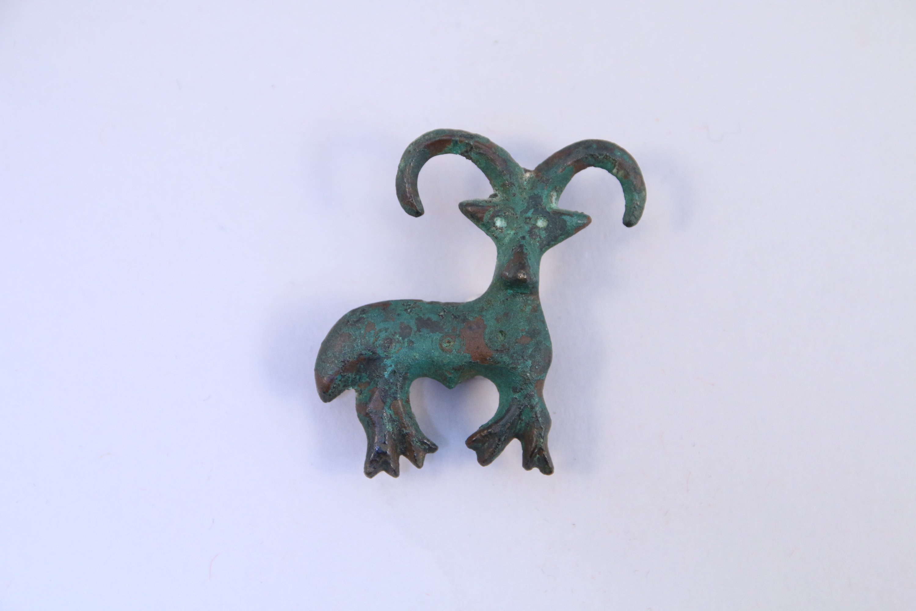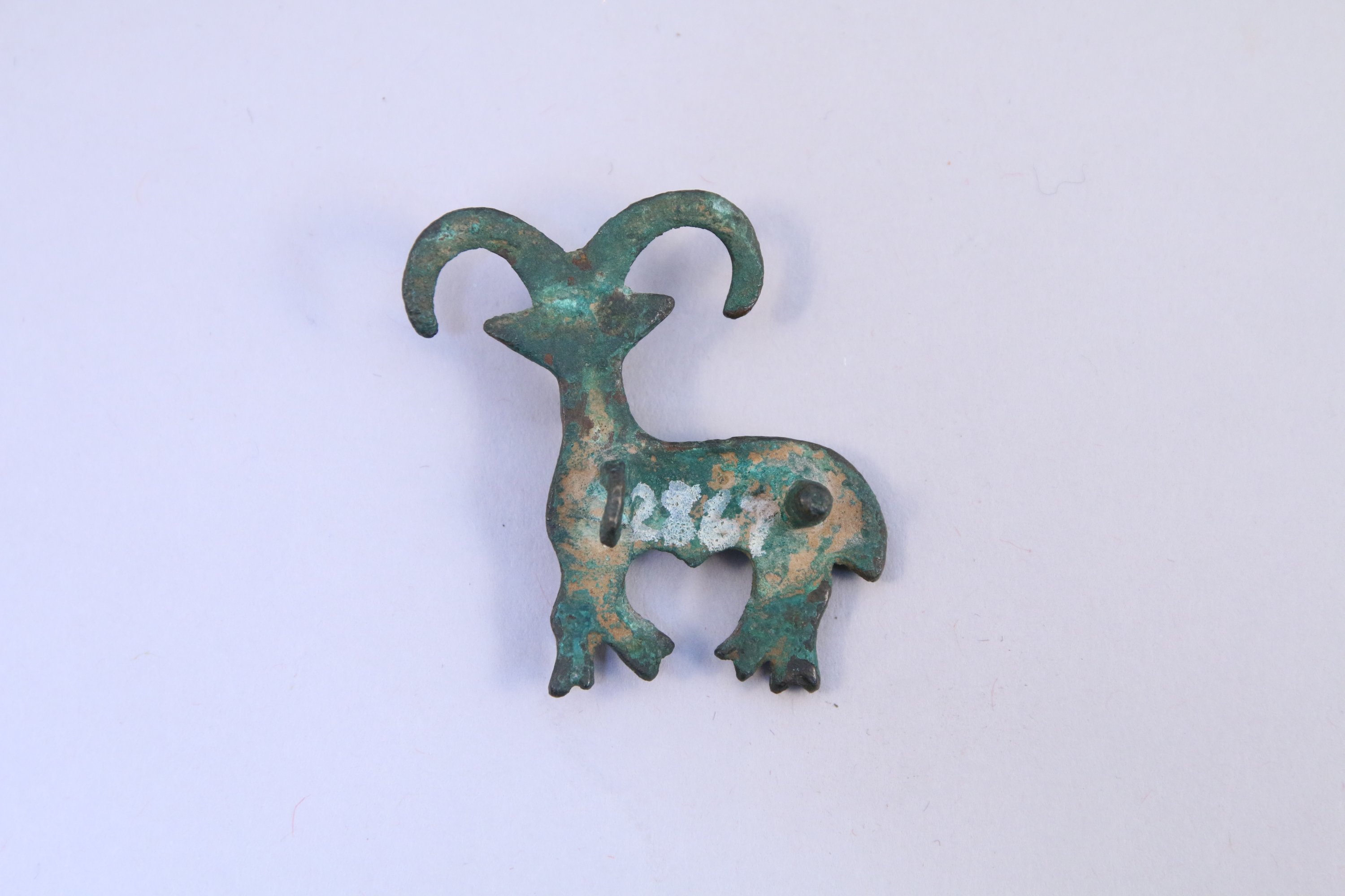 BROCHE en bronze en forme de bouquetin de profil à droite, la tête de face. Un ancien numéro de collection au dos, à l’encre blanche.