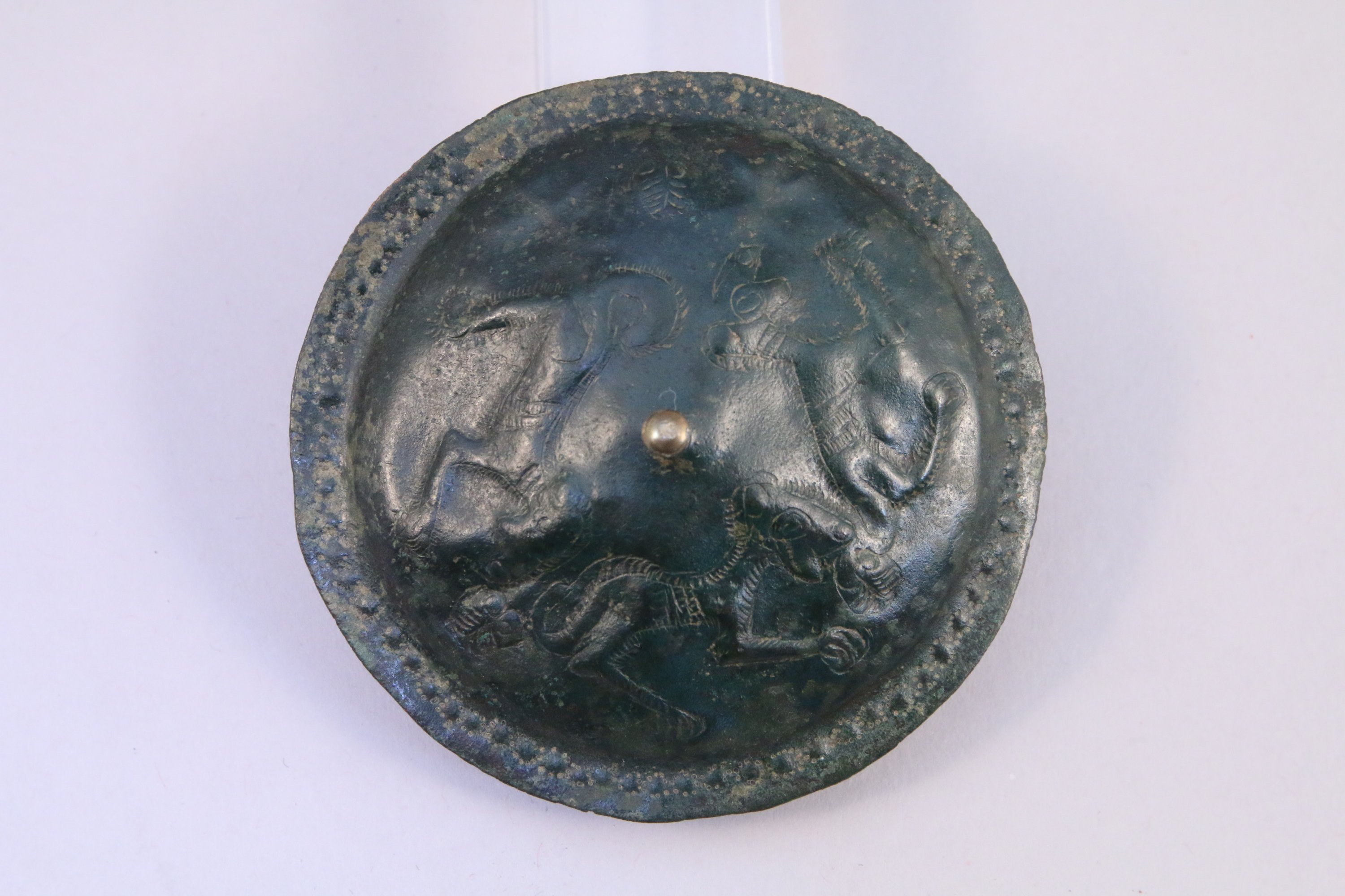 UMBO en bronze patiné avec un décor gravé de trois félins dans des feuillages. Une ancienne étiquette de vente au dos.