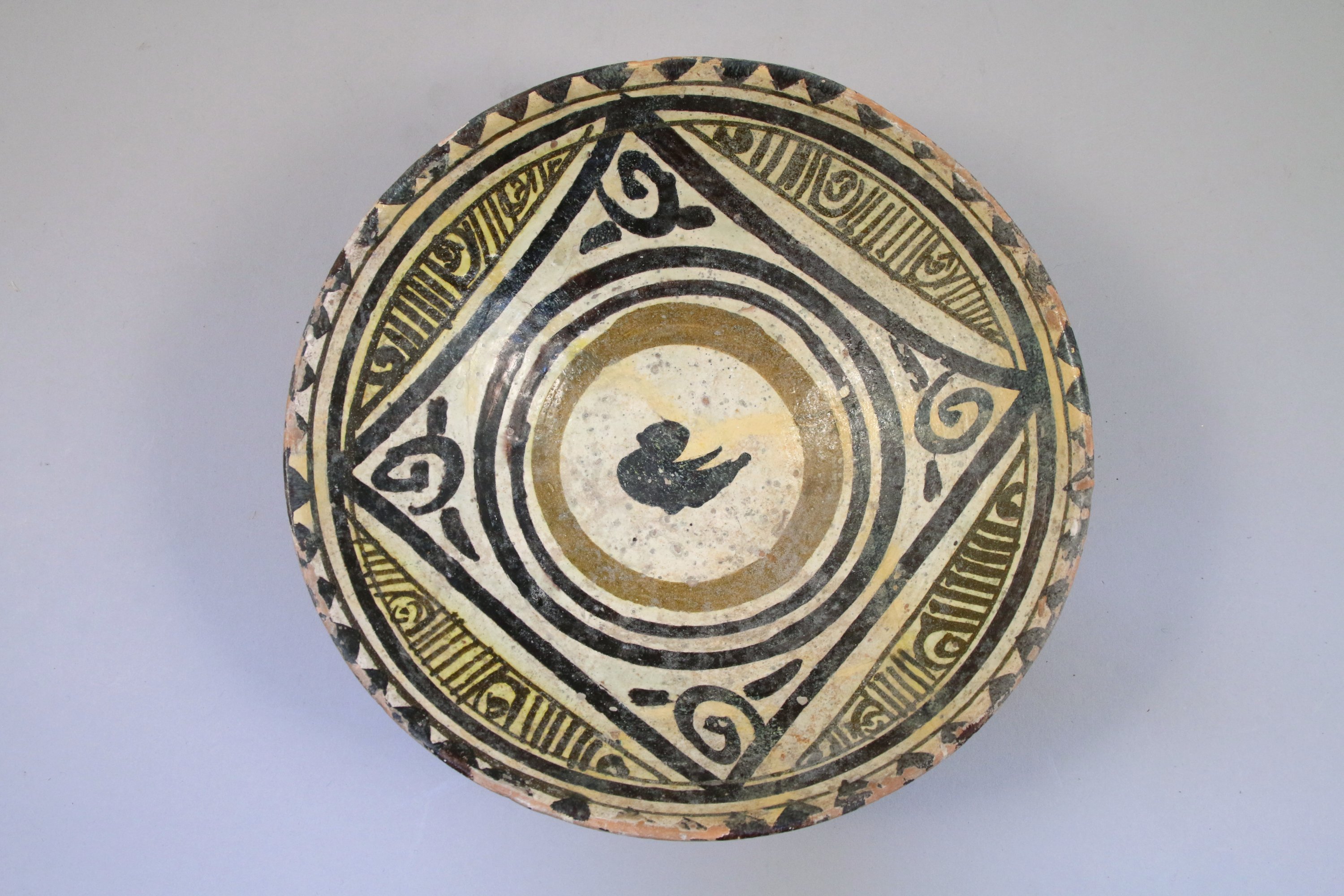 COUPE de type Sari. Céramique argileuse à décor peint en brun et vert d'un oiseau de profil au centre de cercles dans un carré.