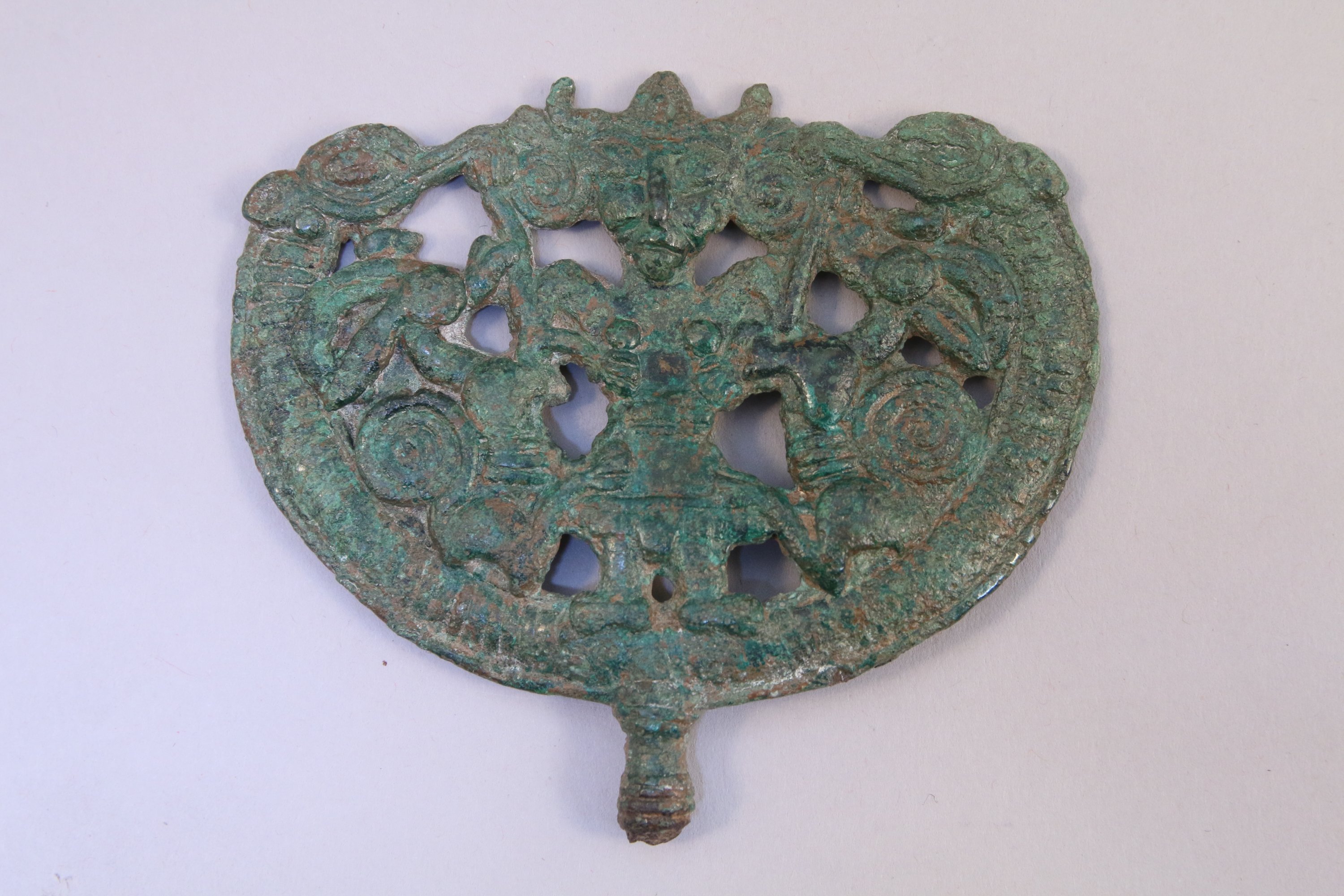 SOMMET dÉPINGLE ajouré en bronze figurant « la maîtresse des animaux » entre deux bouquetins, dans un croissant formé par le cou et deux têtes de félins.