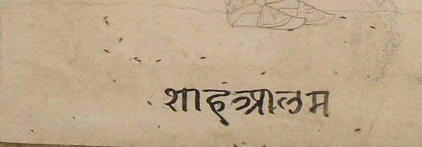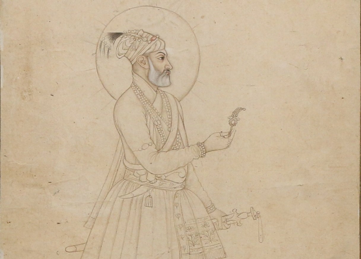 Portrait de Shah Alam (1759-1806) d'empereur moghol, debout de profil, vêtu d'une robe et d'un pantalon jama et tenant une aigrette. Inscription en nagari.