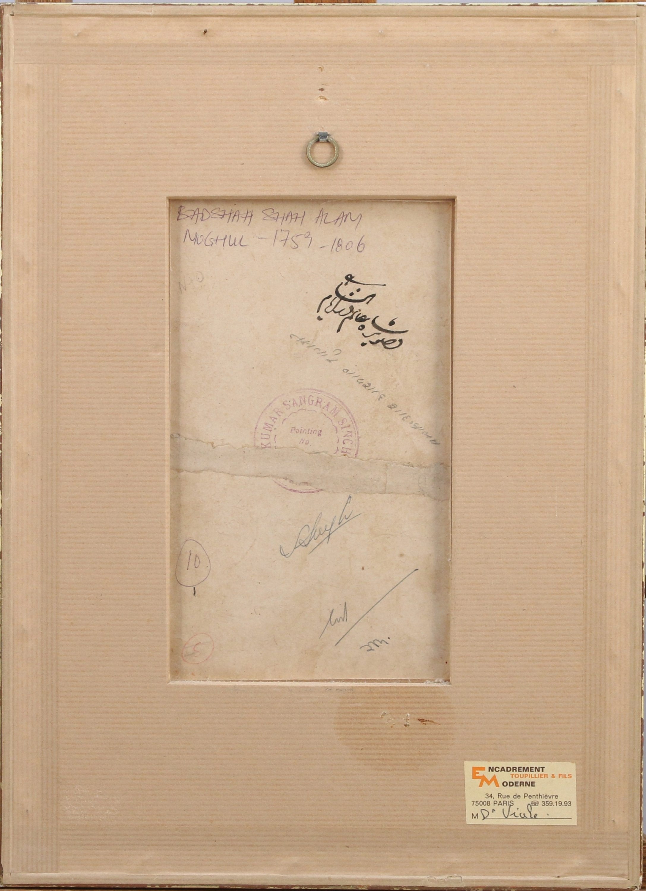 Au revers, inscription en persan partiellement illisible " L'image du Shah Alam dans… " et tampon de Kumar Sangram Singh.