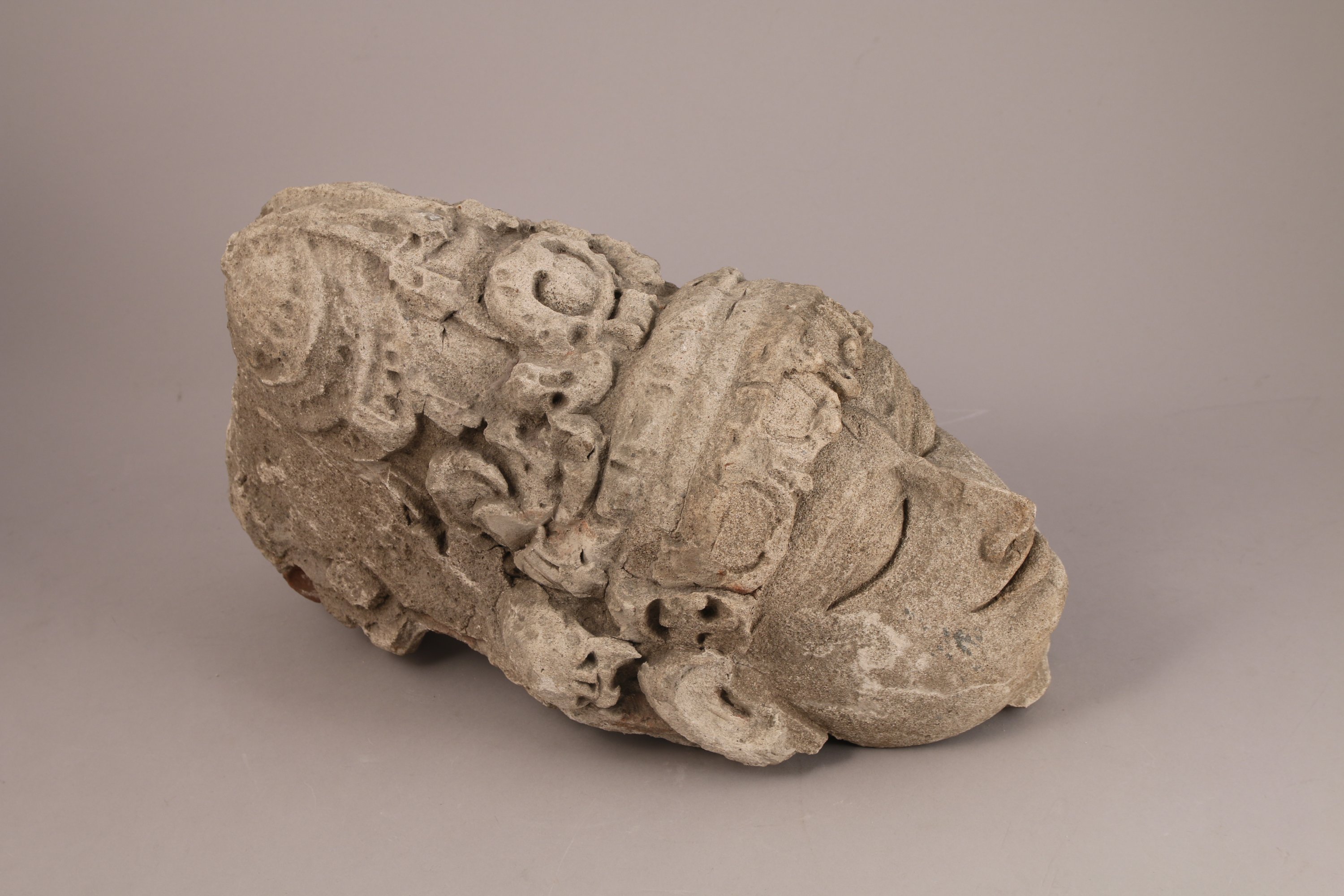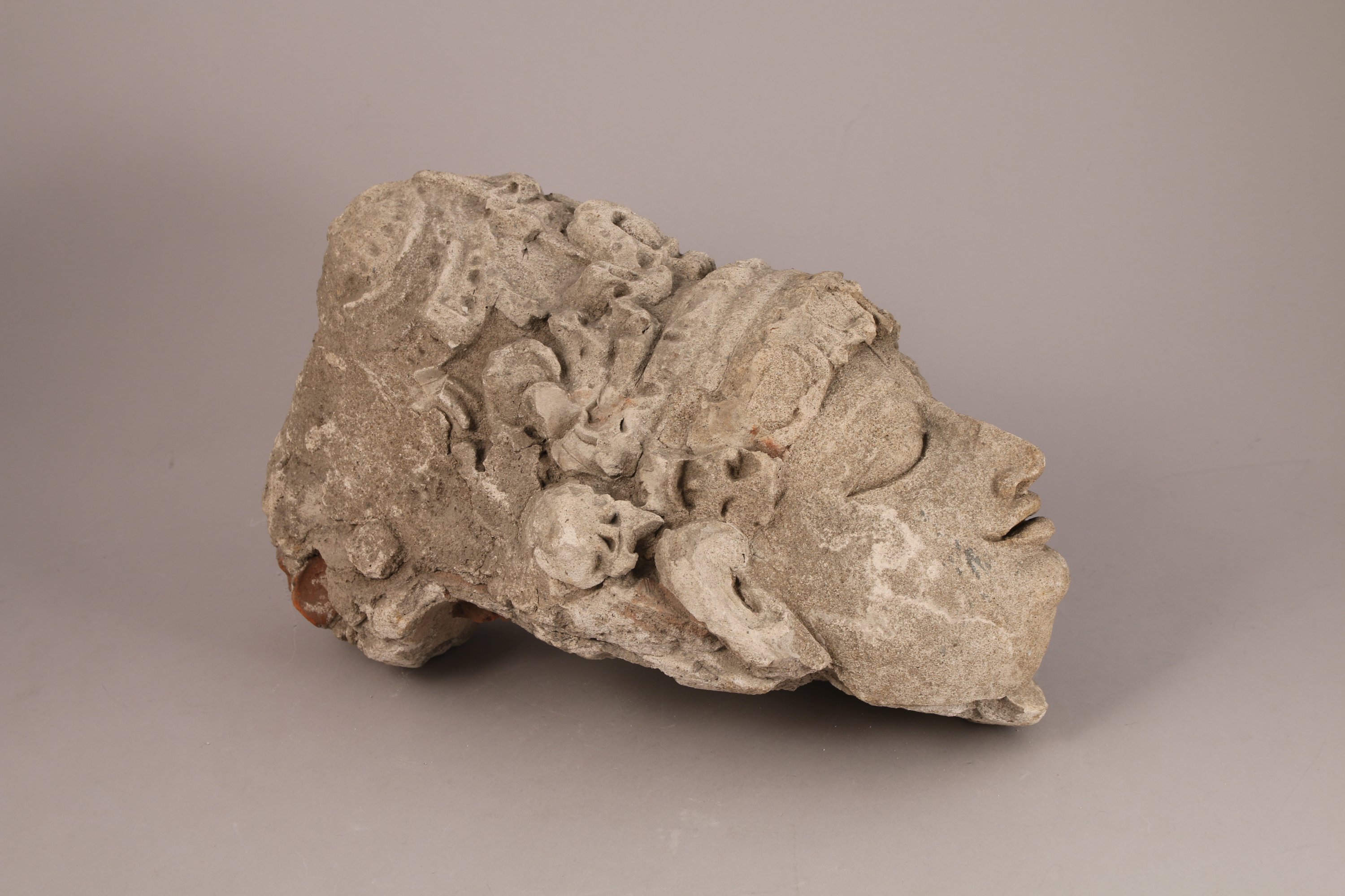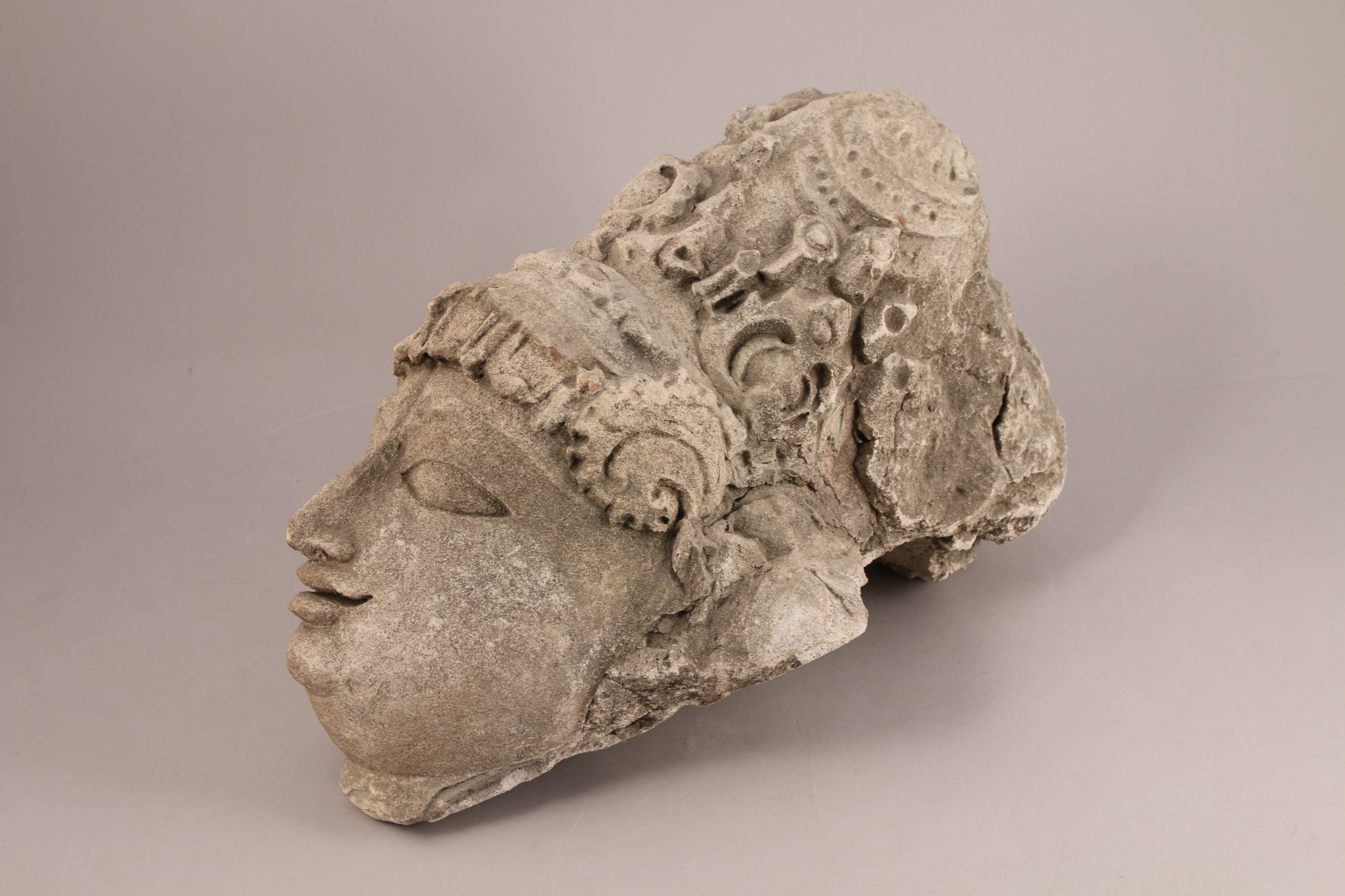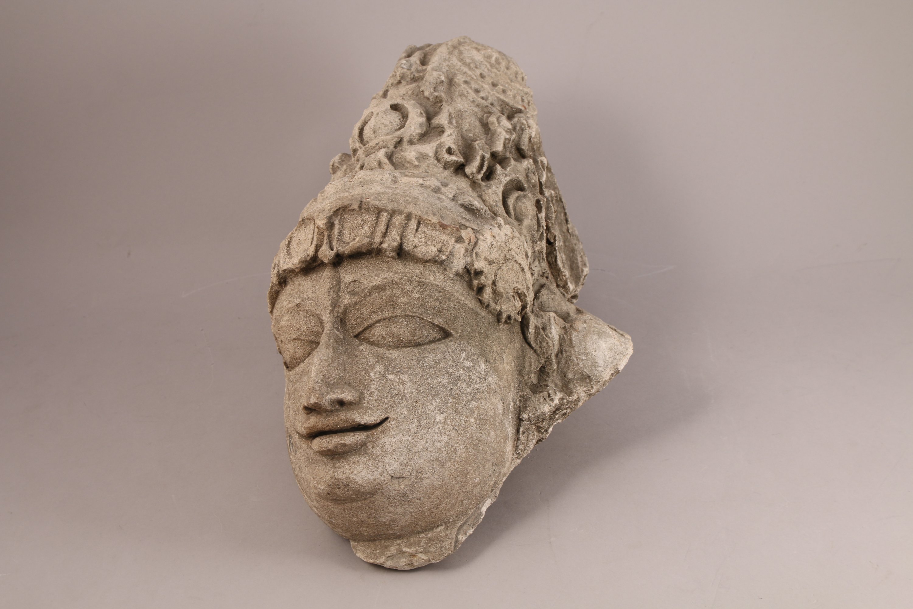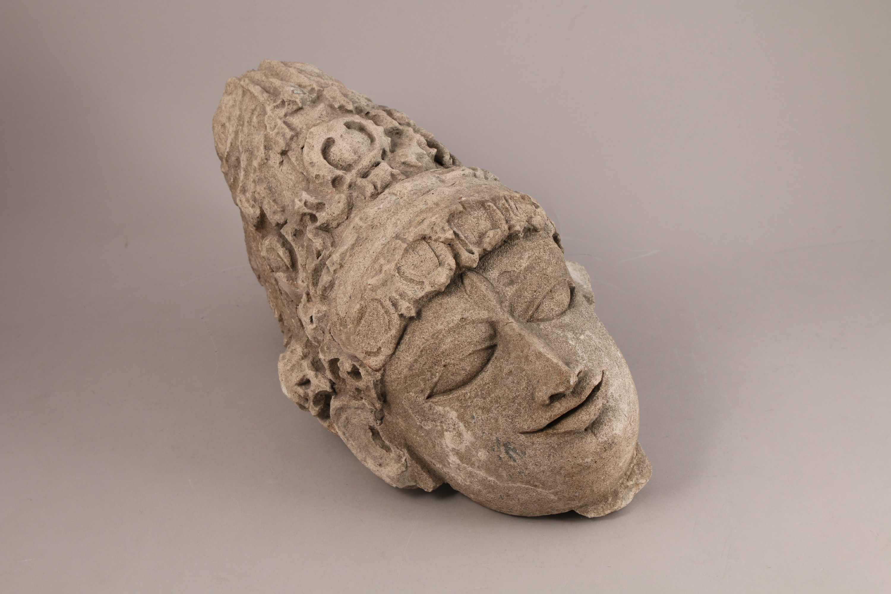 TÊTE DE DIVINITÉ MASCULINE, probablement Shiva, en pierre reconstituée beige, les yeux grands ouverts, la coiffe en haut chignon ornée de frises, de fleurs et de rinceaux.