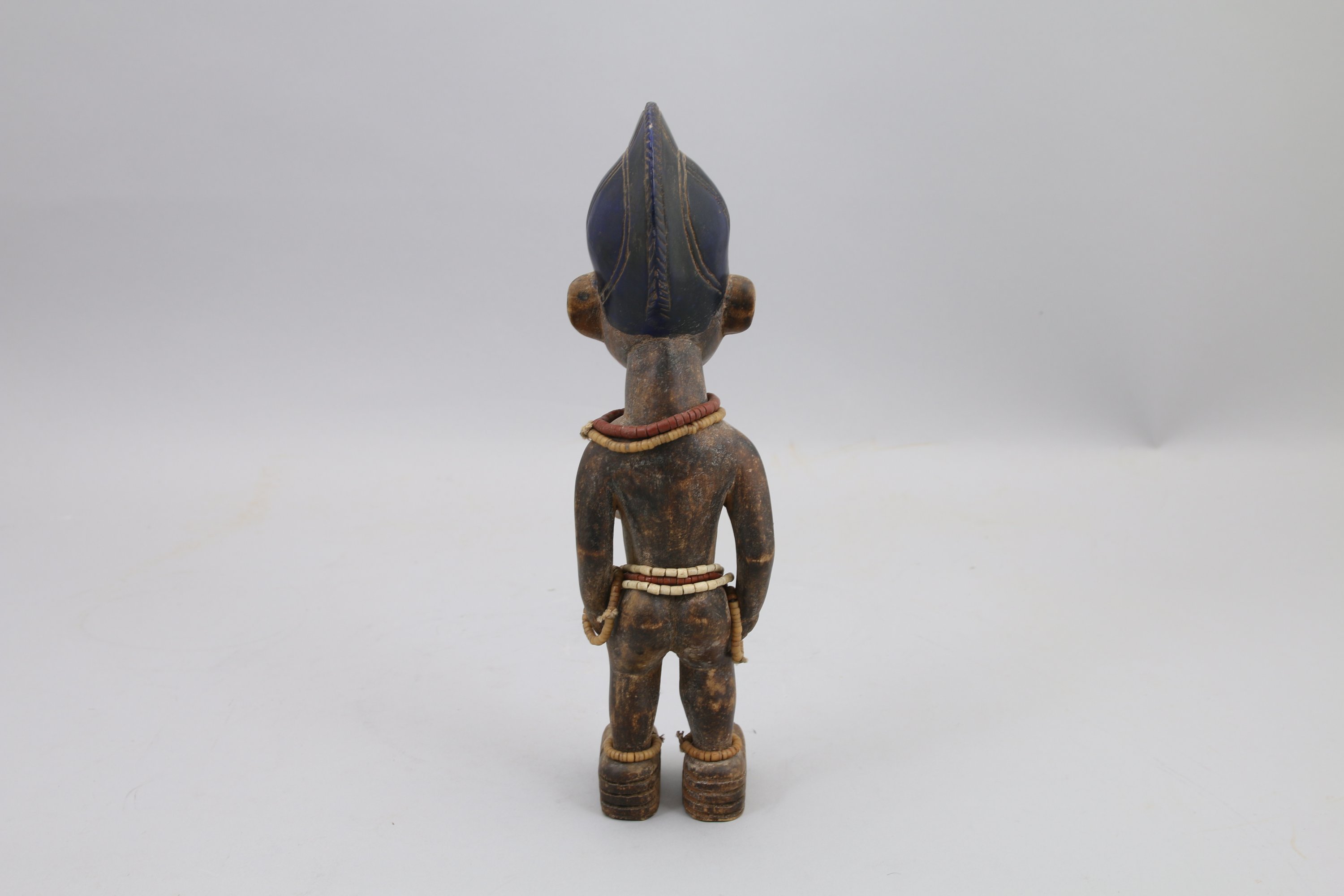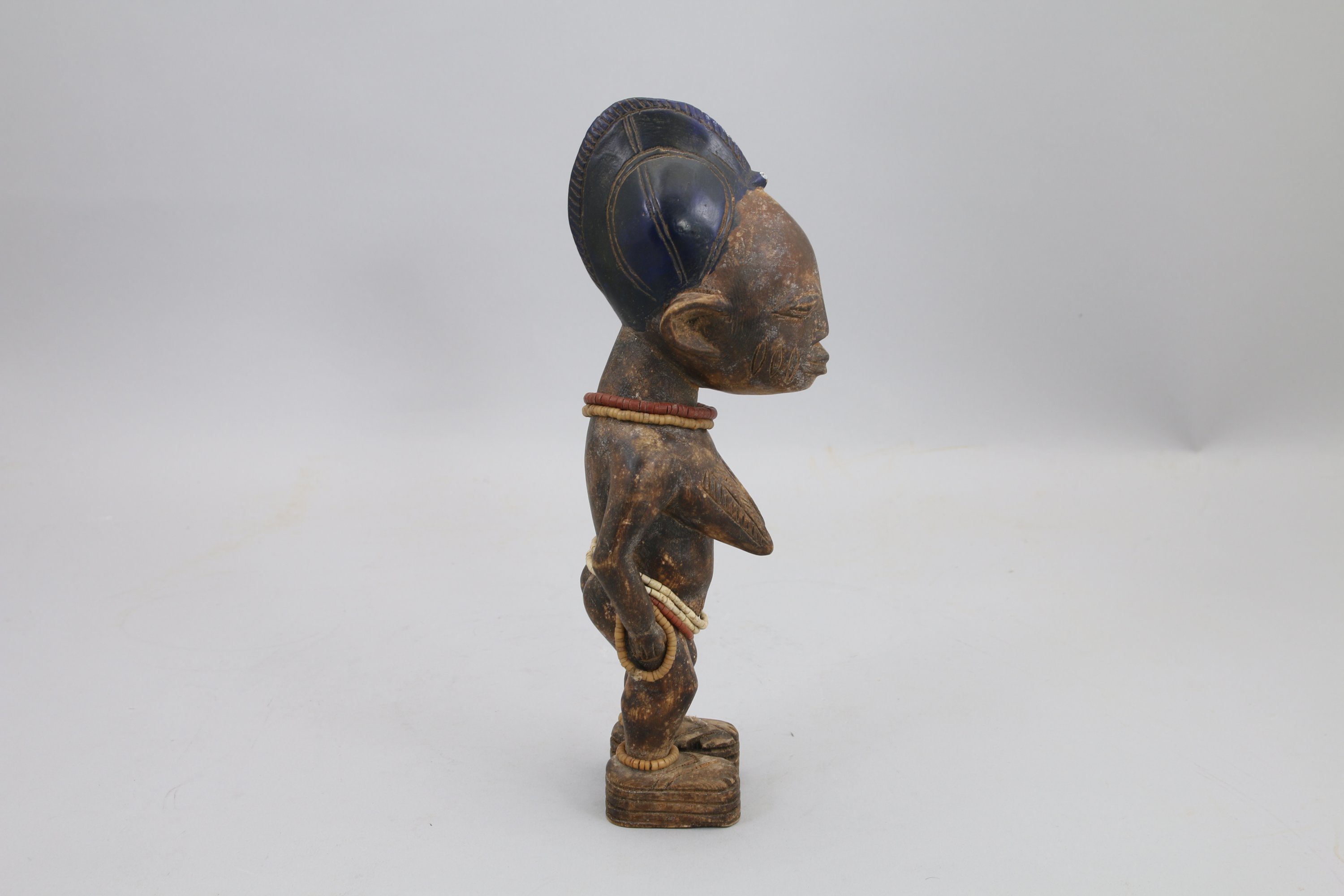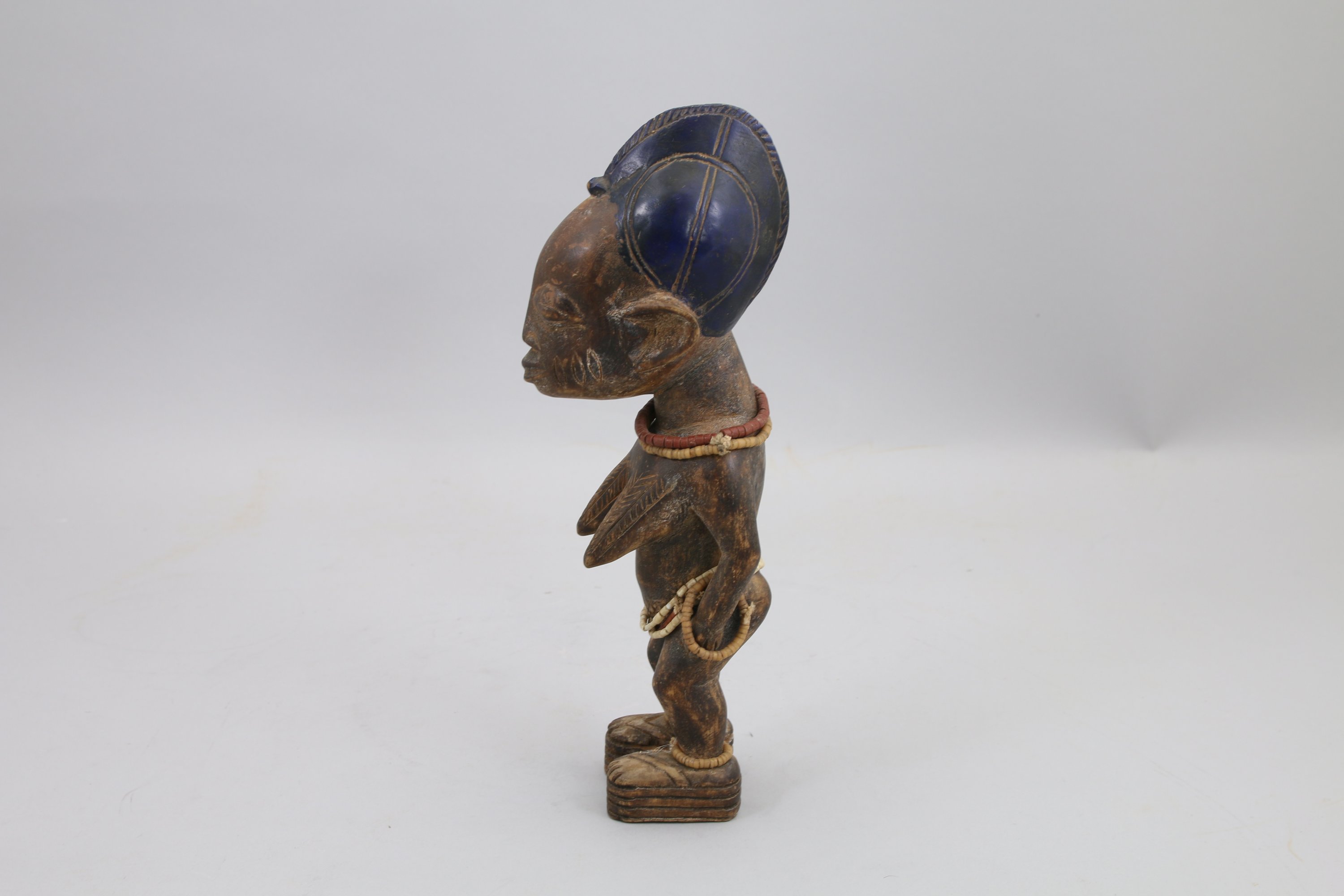 IBEJI en bois sculpté et incisé, la coiffe peinte en bleue, collier de perles.