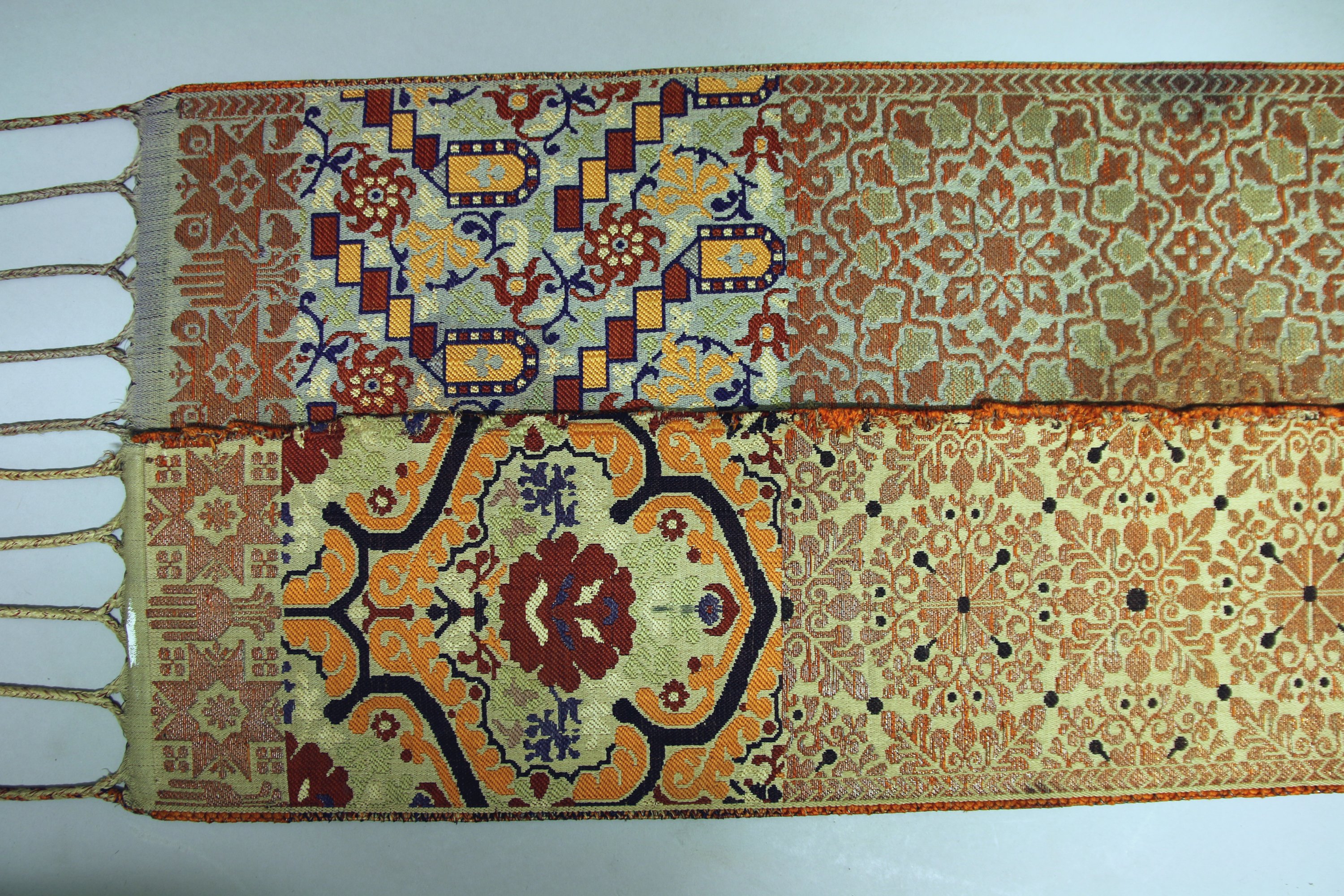 Demi ceinture de Fès, Maroc, brocatelle, fond gris orné darcatures et fleurs, fond crème avec fleurs dans des polylobes à dominante orangée, fond crème décor cuivre de fleurs stylisées, aux extrémités croix chérifienne et main de fatima.