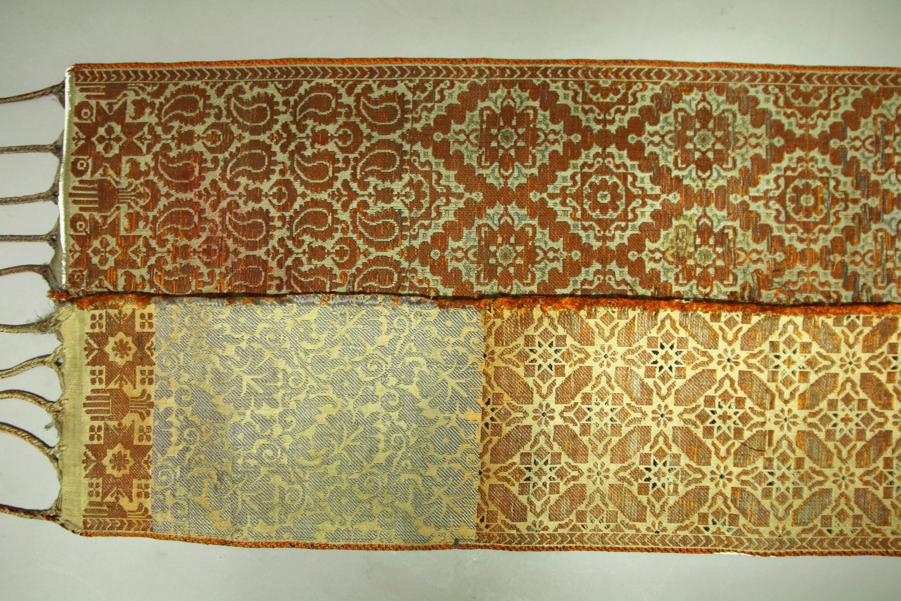 Demi ceinture de Fès, Maroc, brocatelle, fond crème décor orange de palmes et fleurs dans un réseau, décor crème de fleurs et orange de fleurs stylisées, extrémités avec croix chérifiennes et main de fatima.