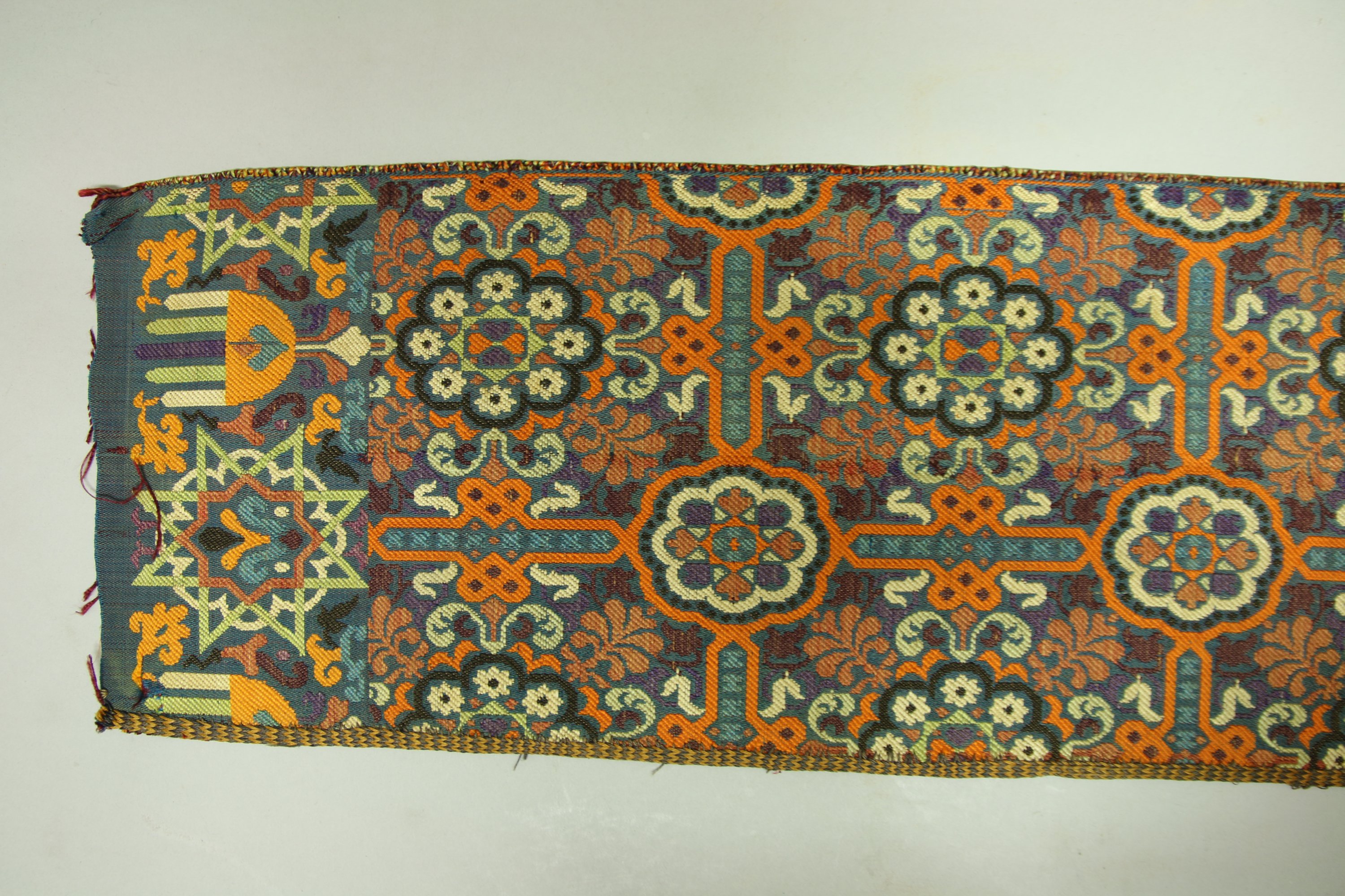 Fragment de demi ceinture de Fès, Maroc, brocatelle, fond noir décor de fleurs rayonnantes à dominante orange.