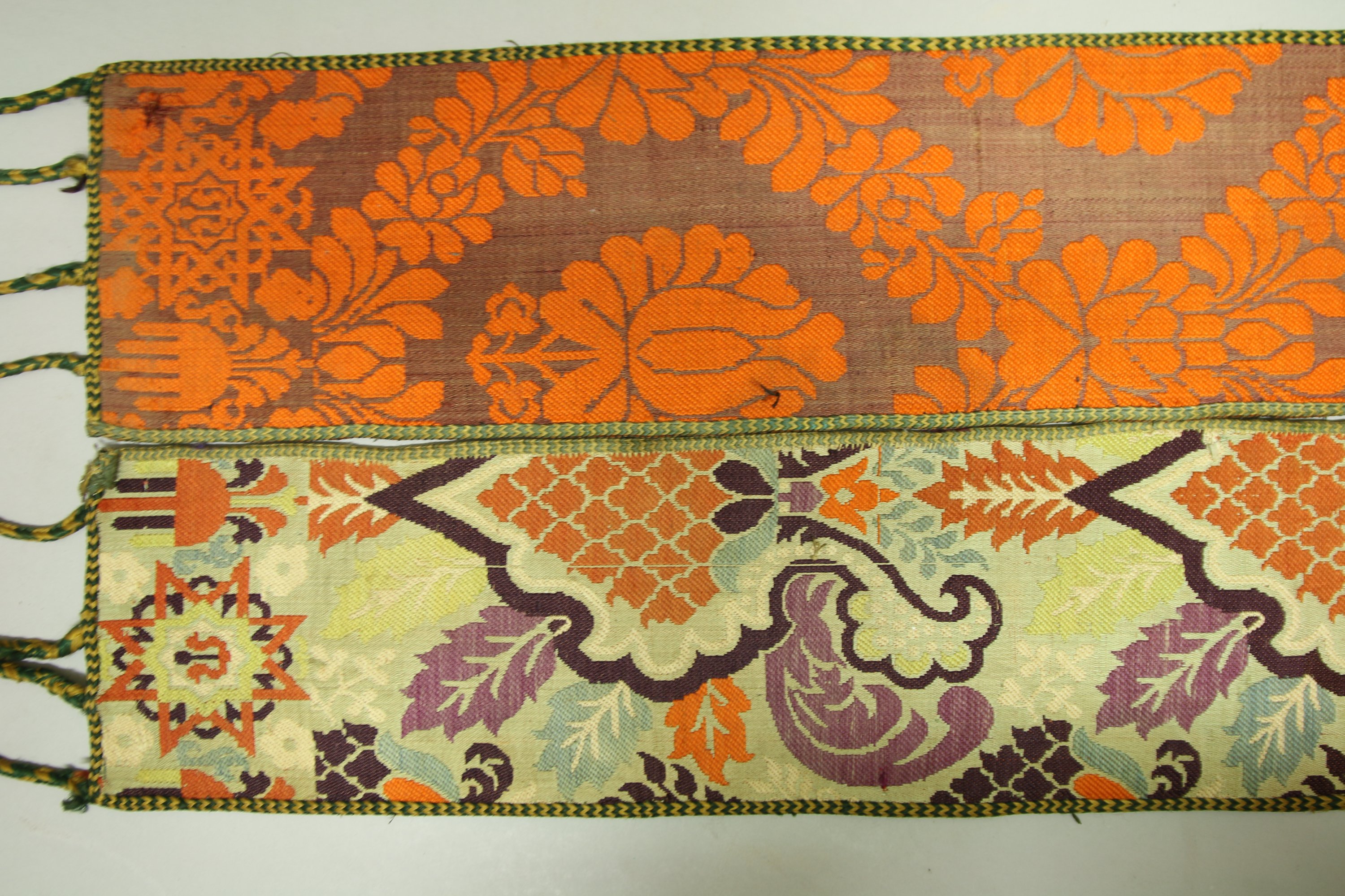 Demi ceinture de Fès, Maroc, brocatelle, fond gris décor orange de pommes de pin dans des rinceaux et palmes, et violet décor orange de fleurs dans un réseau floral, main de fatima et croix chérifiennes aux extrémités.