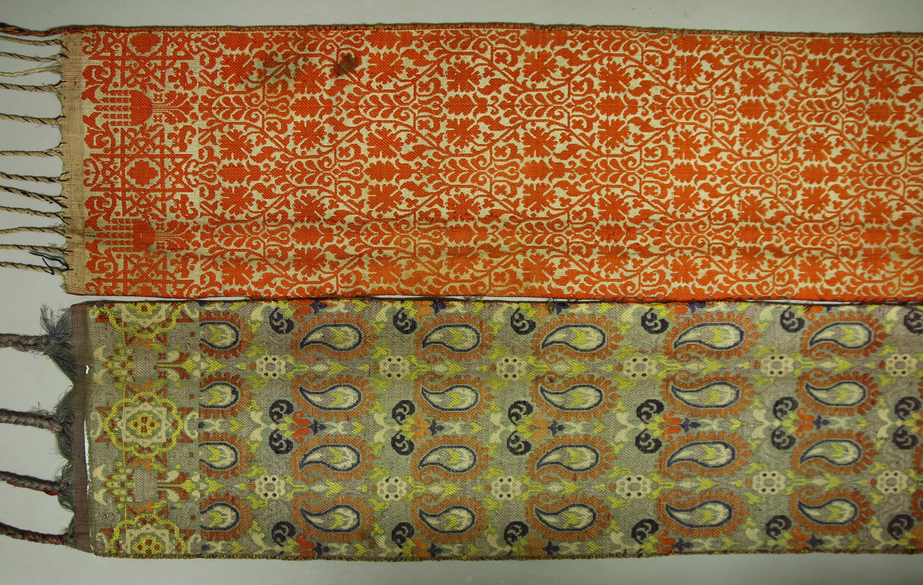 Demi ceinture de Fès, Maroc, brocatelle, fond gris décor de palmes mille fleurs, et décor orange de tiges fleuries, mains de fatima et croix chérifiennes aux extrémités.