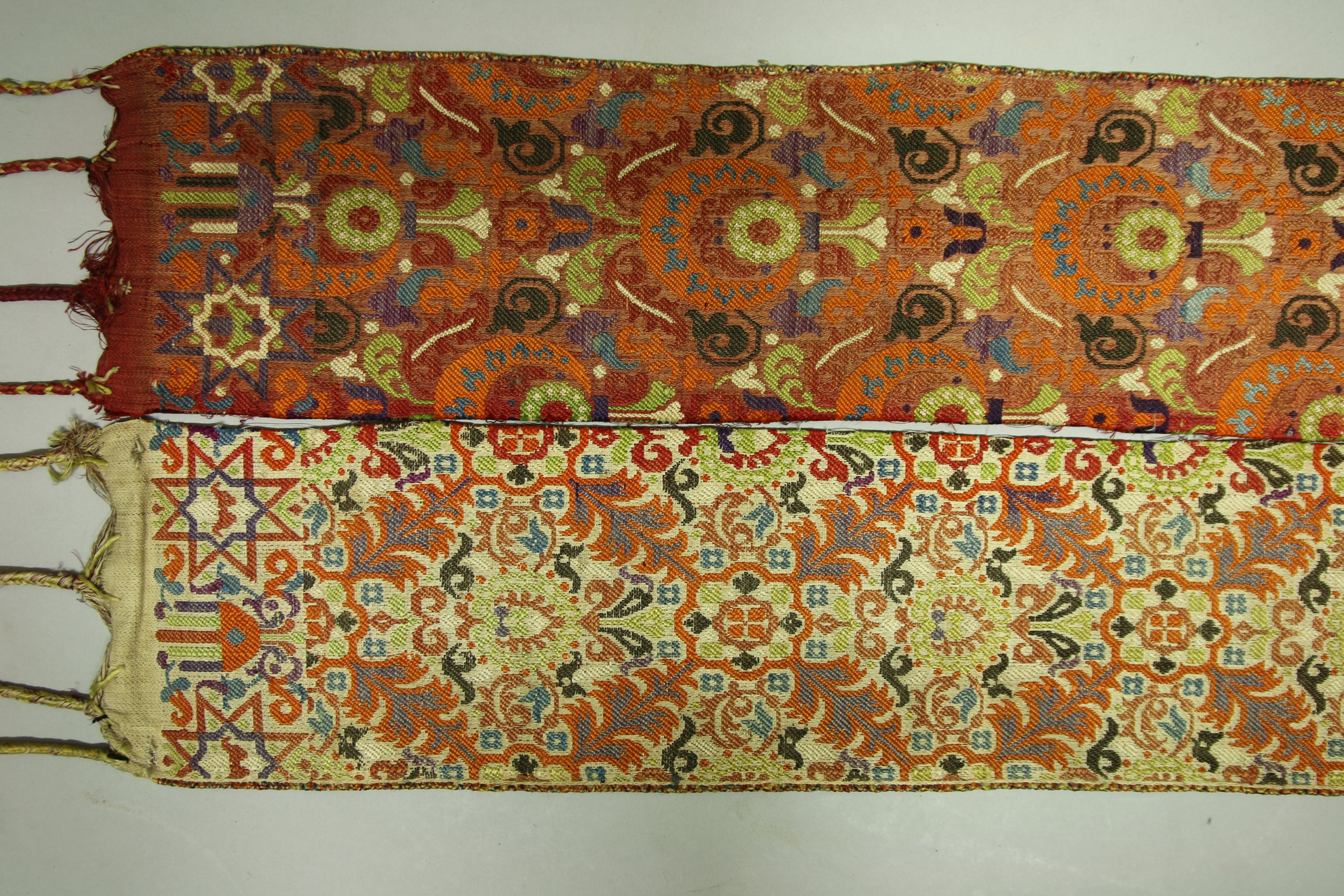 Demi ceinture de Fès, Maroc, brocatelle, fond crème décor rayonnant orange, et fond vieux rose décor de croissants et fleurs (décoloration).