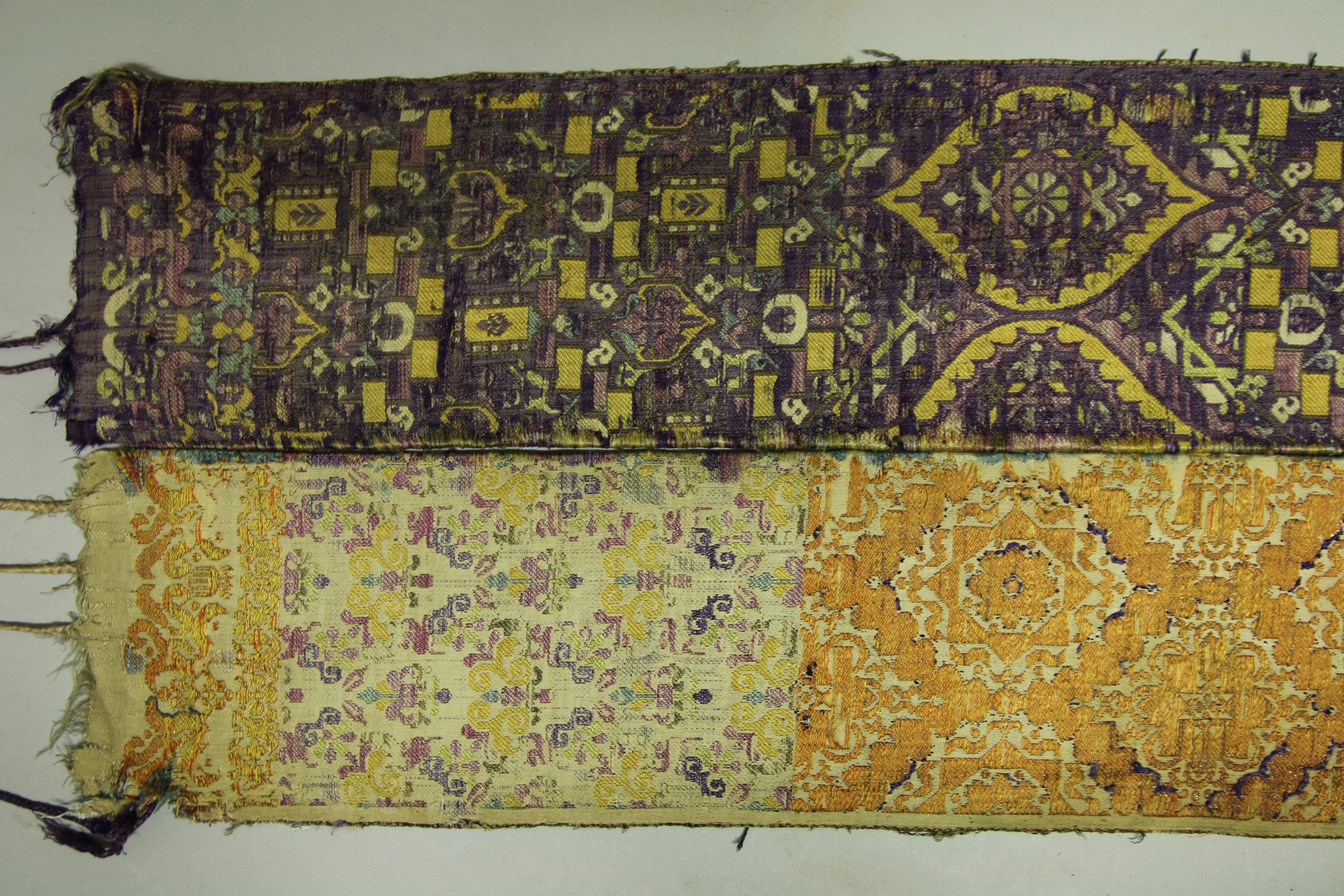 Demi ceinture de Fès, Maroc, brocatelle fond crème décor géométrique floral et tramé cuivre de médaillons, fond violet décor géométrique avec mandorle et fleurs (usures).