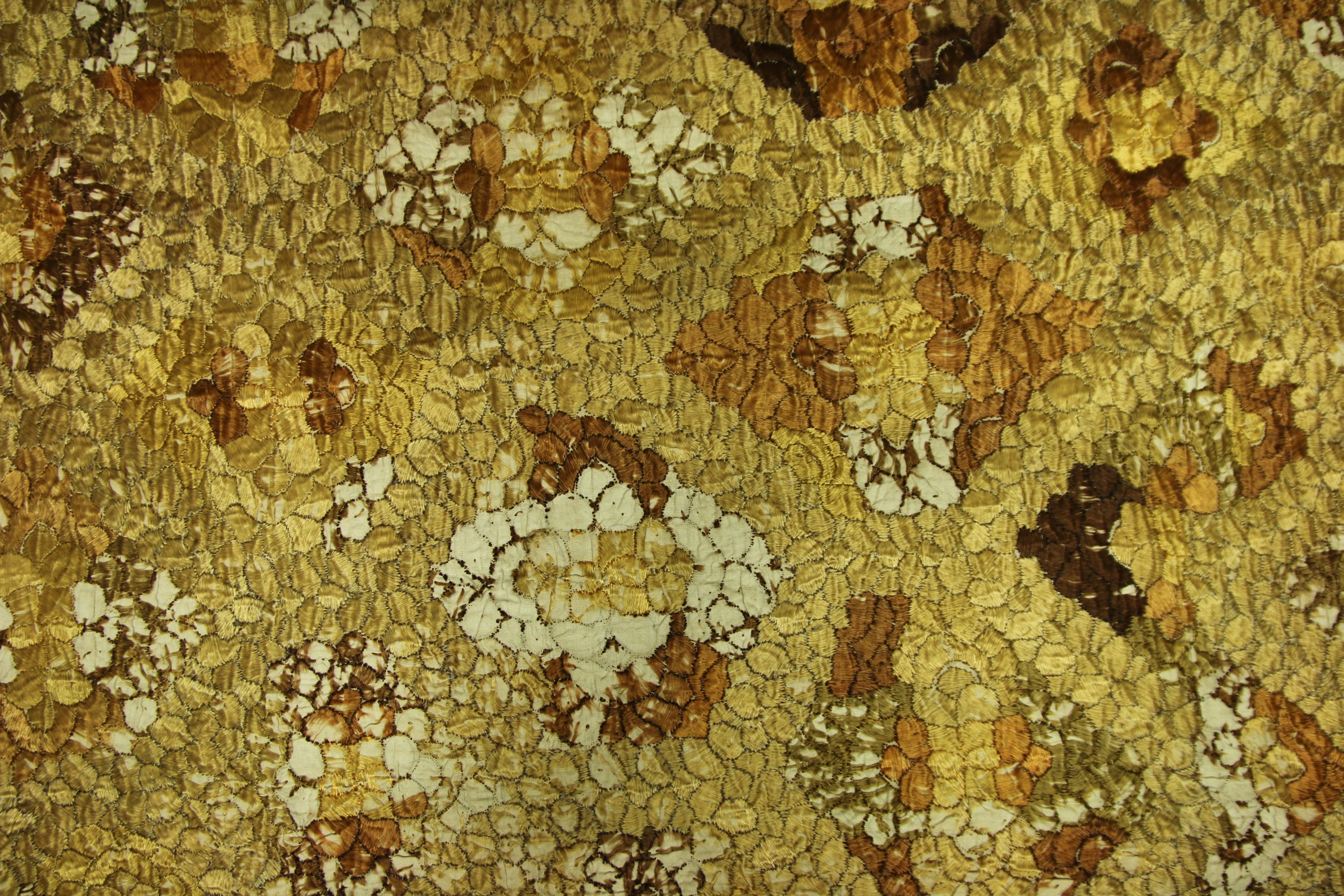 Dessus de coffre, Rabat, Maroc, coton brodé en camaïeu de soie floche jaune tabac, fleurs dans un réseau losangé (importantes usures à la soie de la broderie).