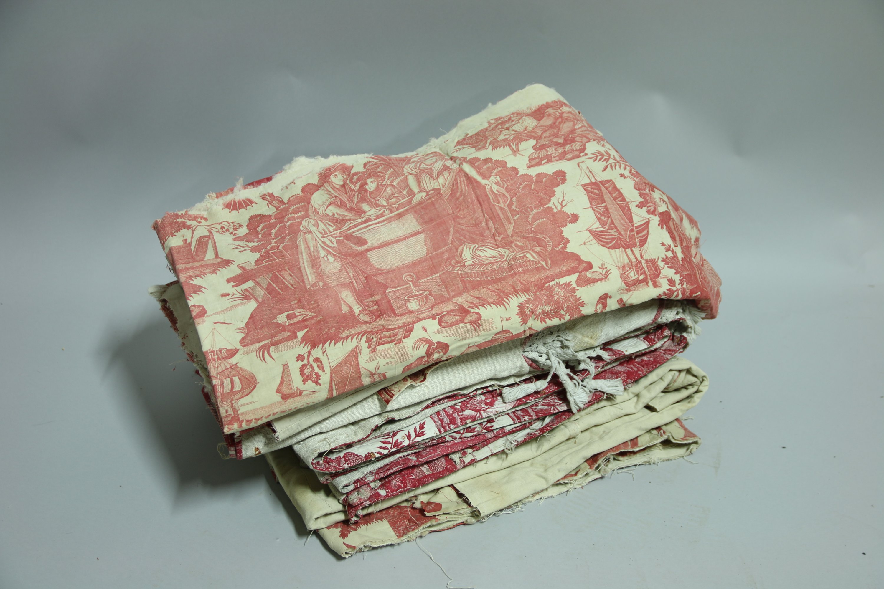 Coton imprimé en rouge à la planche « La Danse Savoyarde », Manufacture de Leclerc père et fils à Pont-de-La-Maye, vers 1790. Petits savoyards dansant, lavandière sous un palmier, vieillard faisant la lecture de la bible à un petit enfant daprès Greuze. (trous).