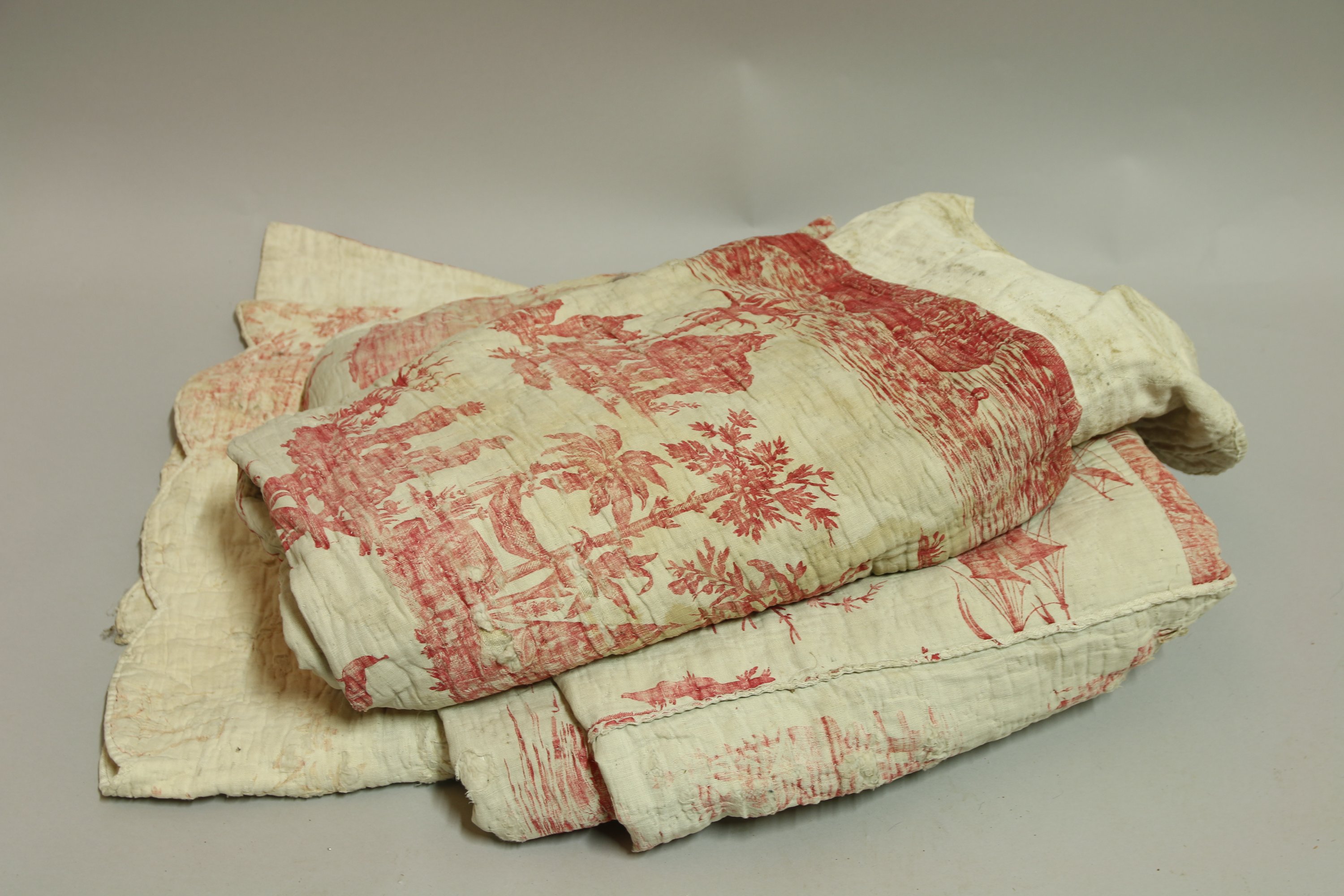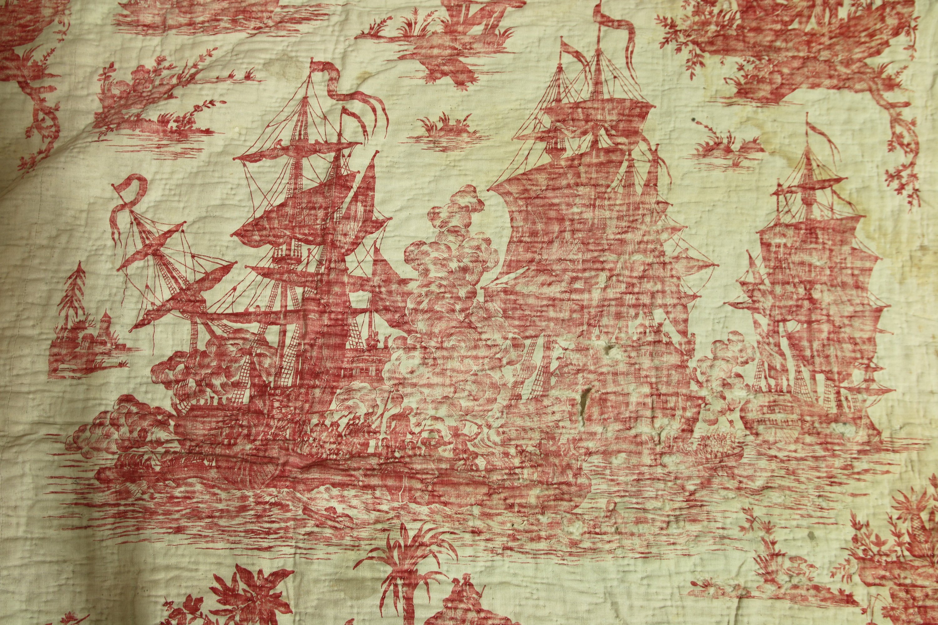 Coton imprimé « Le Combat de Trinquemale entre « Le Héros » et « Le Superbe » imprimé à la planche de bois en rouge sur coton, manufacture Favre Petit pierre, à Nantes, vers 1802, évoque le combat naval de lamiral de Suffren au large de Trinquemale du 3 septembre 1782.