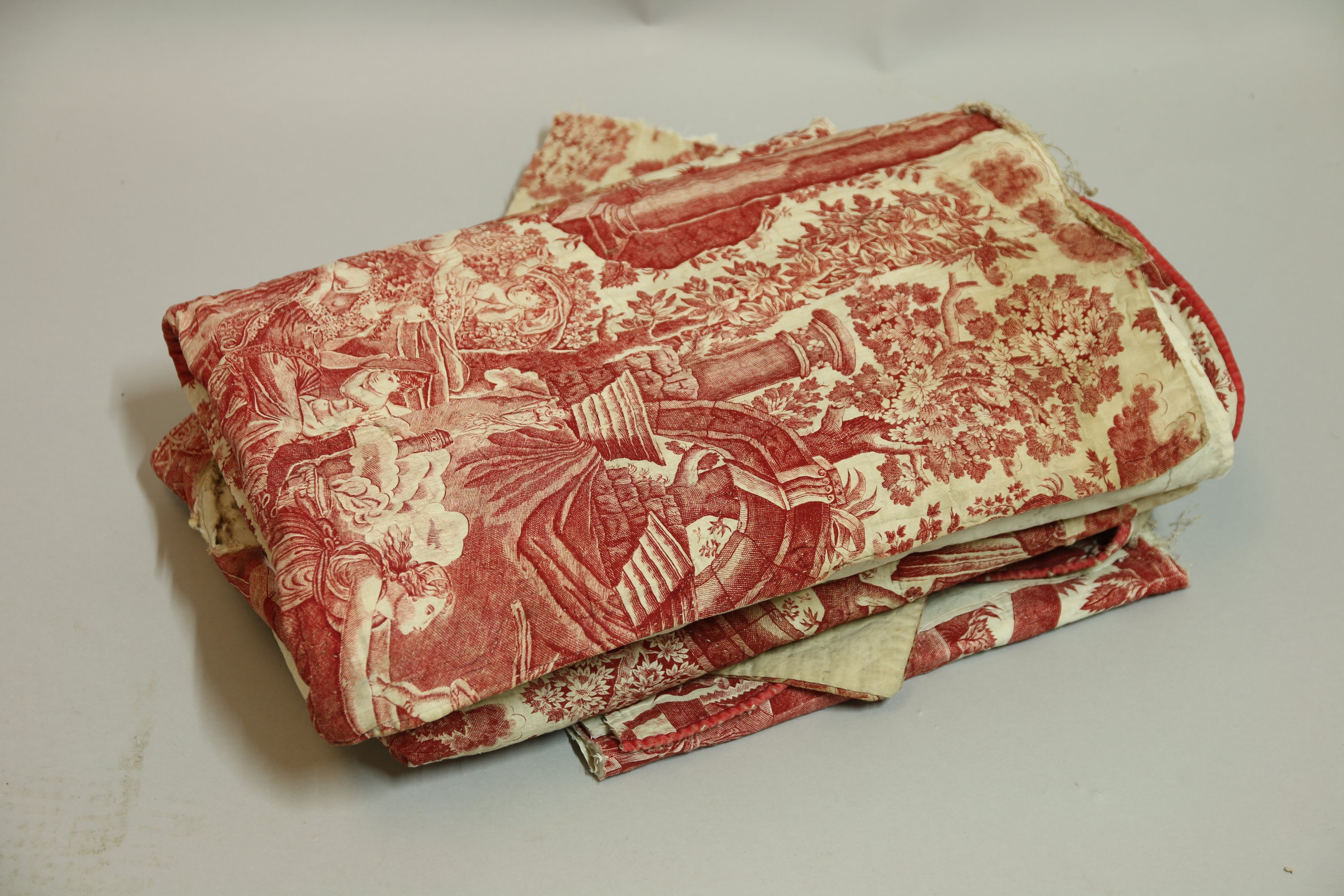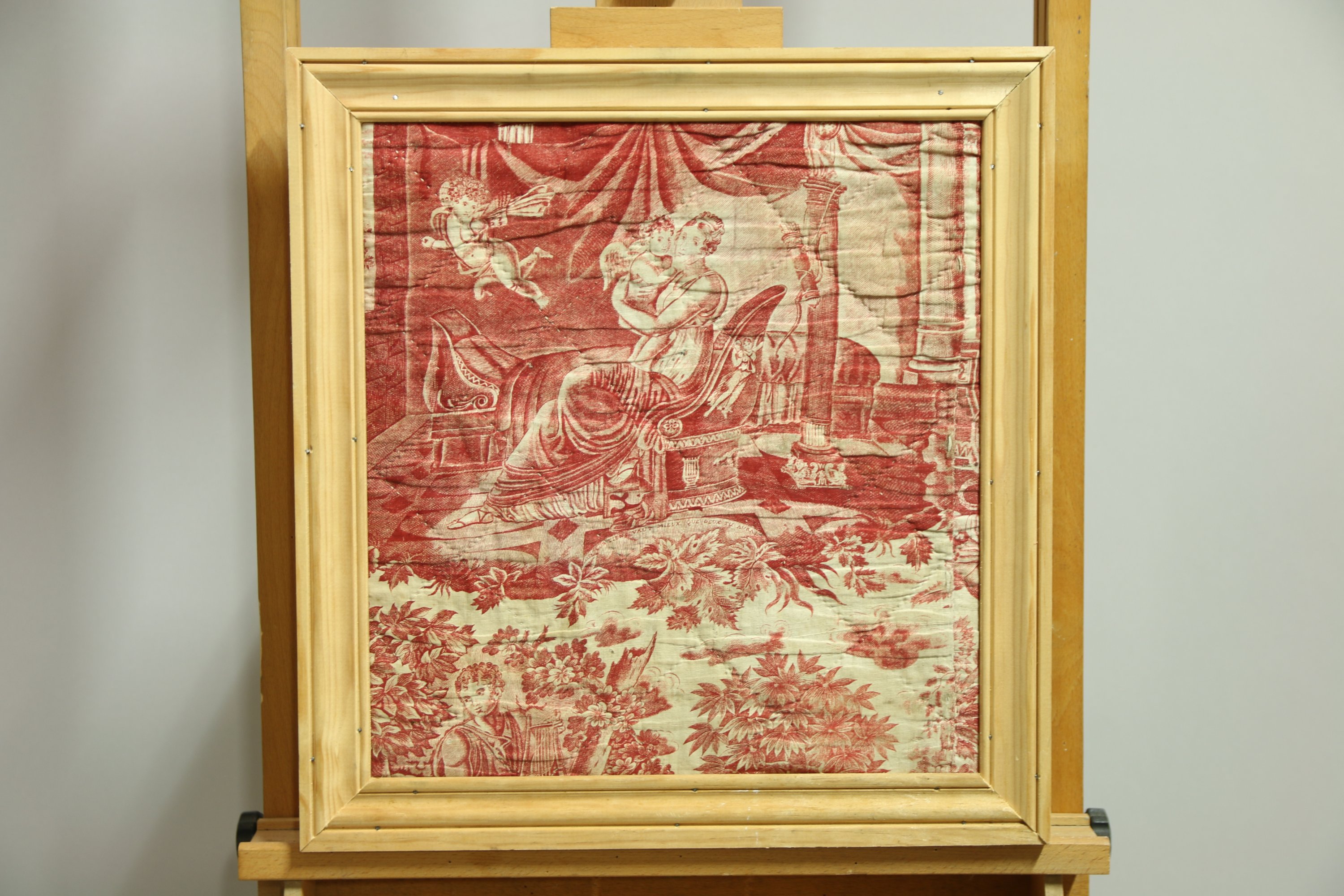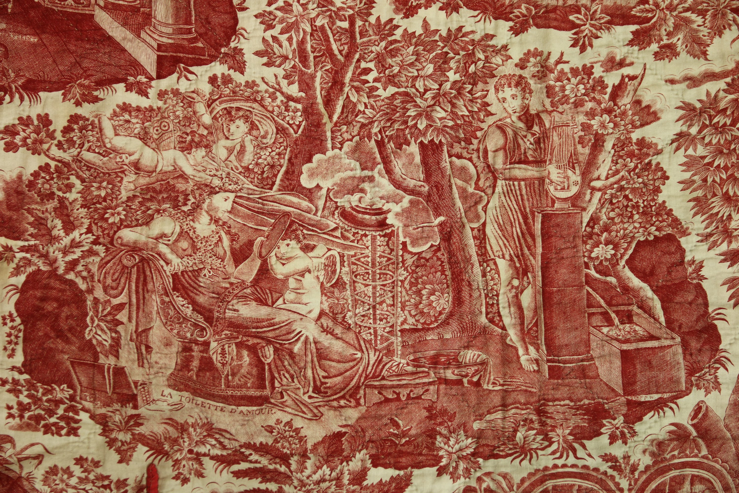 Coton imprimé à la planche de cuivre en sanguine, « La Toilette dAmour », manufacture P. Wingaërt à Bolbec, 1857, gravé par Bucquet, Qui Trop Embrasse Mal Etreint, Si Un Tiens Vaut Mieux Que Deux Tu lAuras.