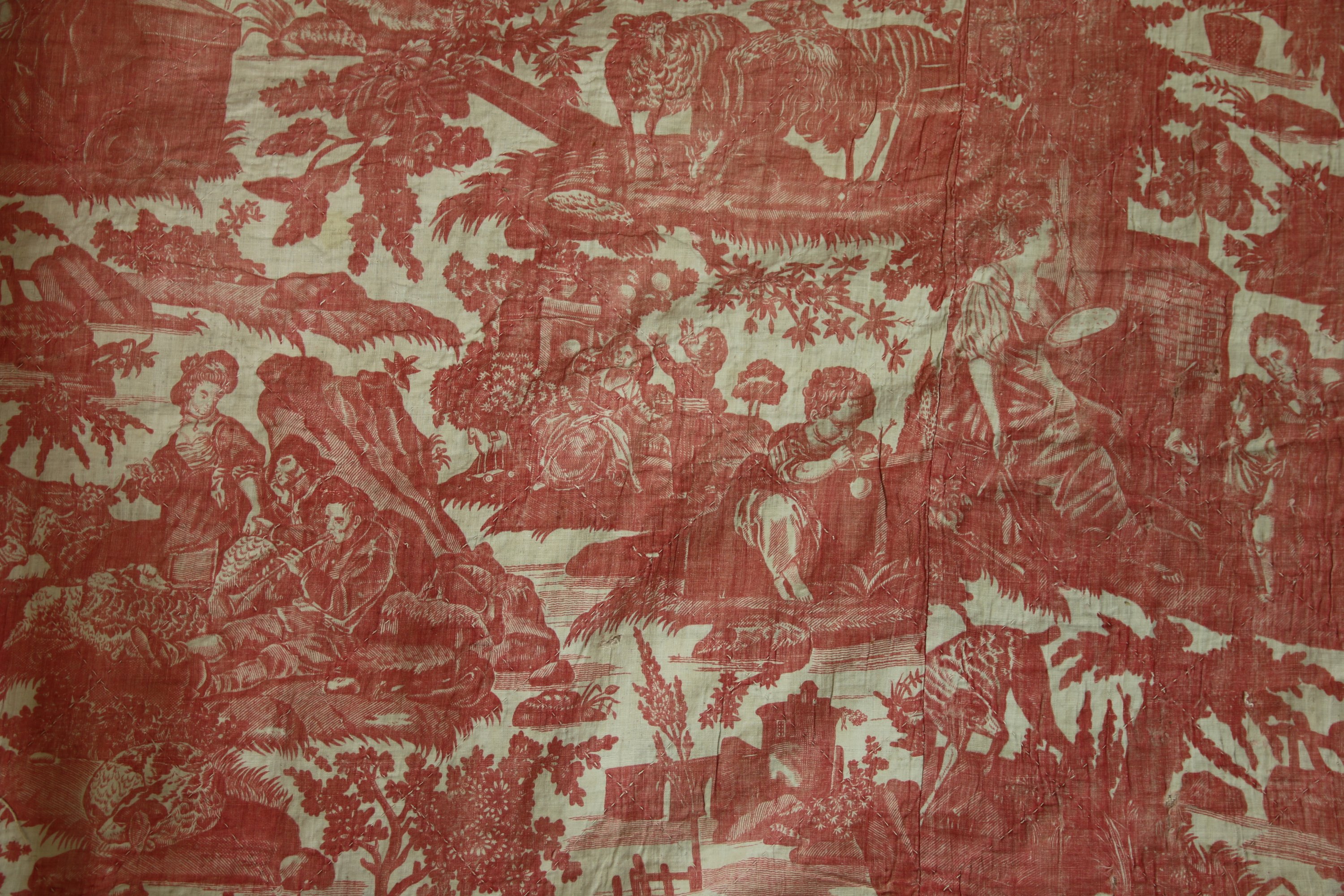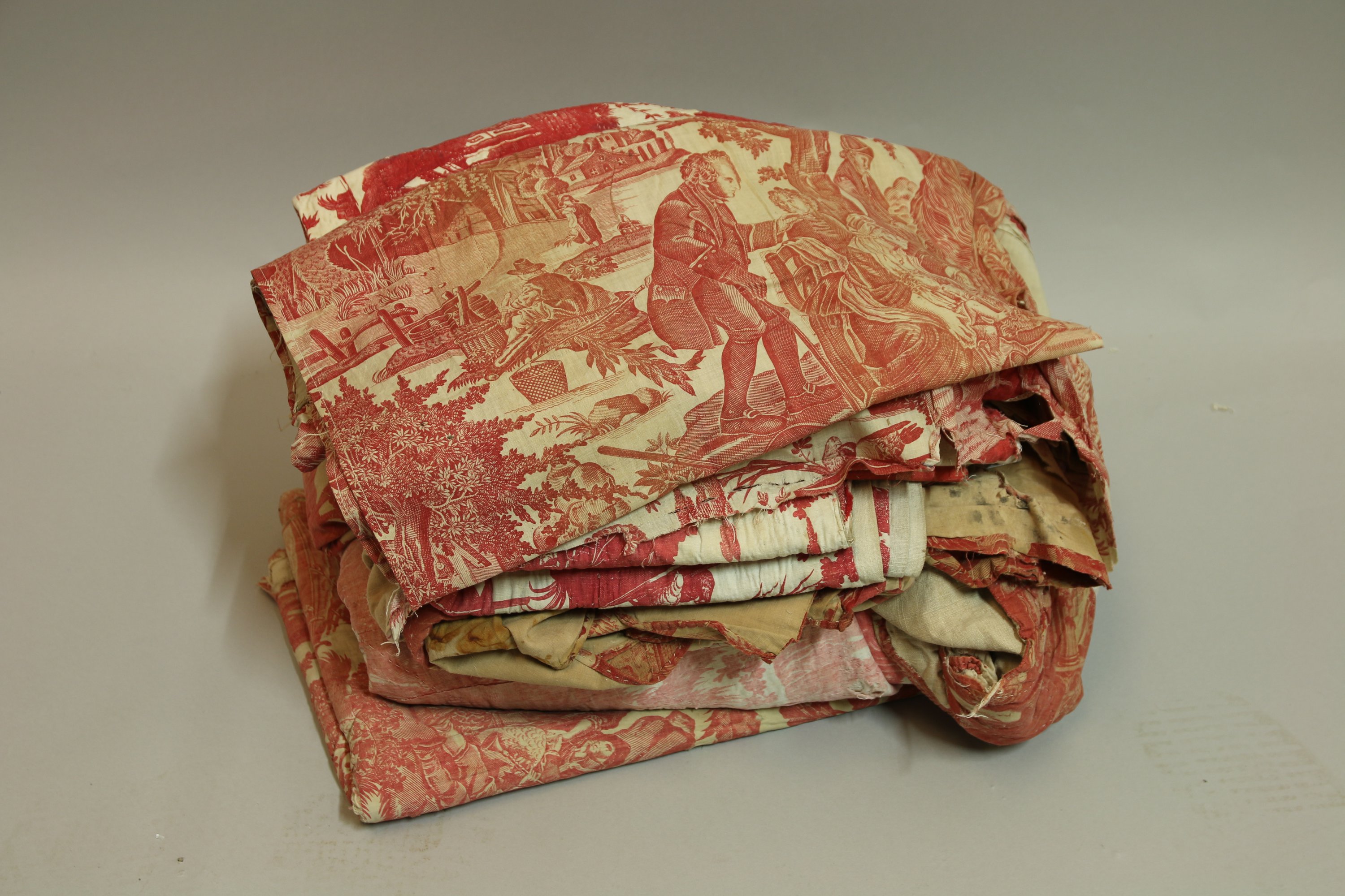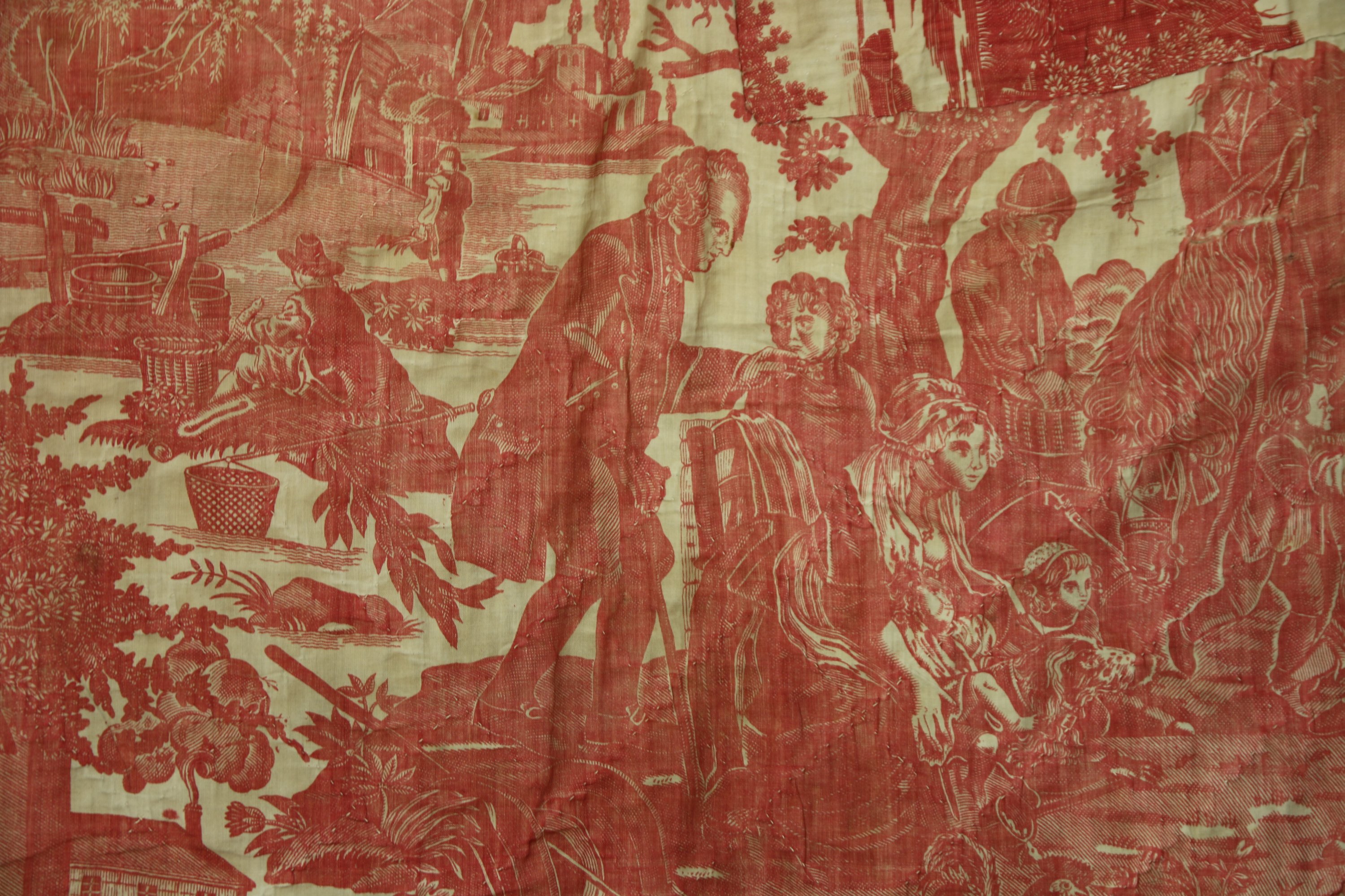 Réunion de toiles à personnages en coton imprimé de divers modèles imprimés à la planche en rouge, XVIII et XIXème siècle.