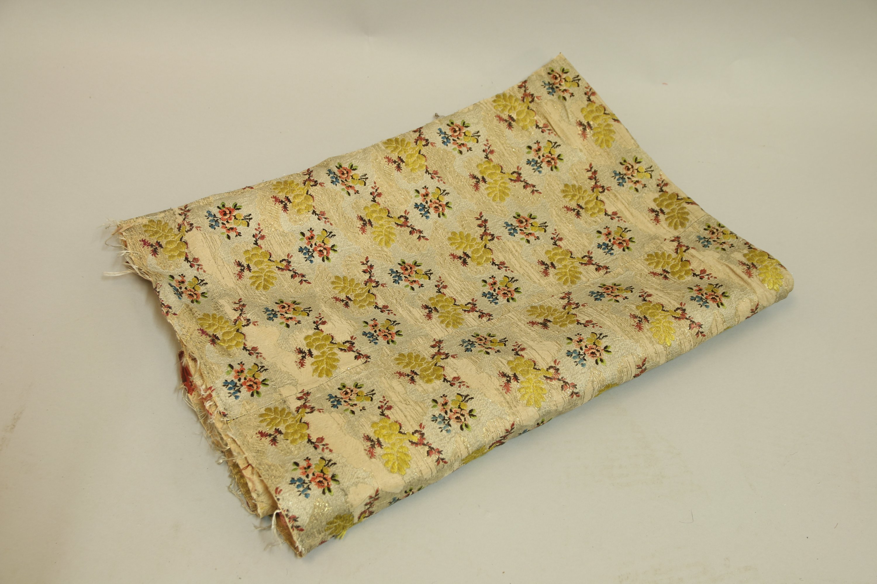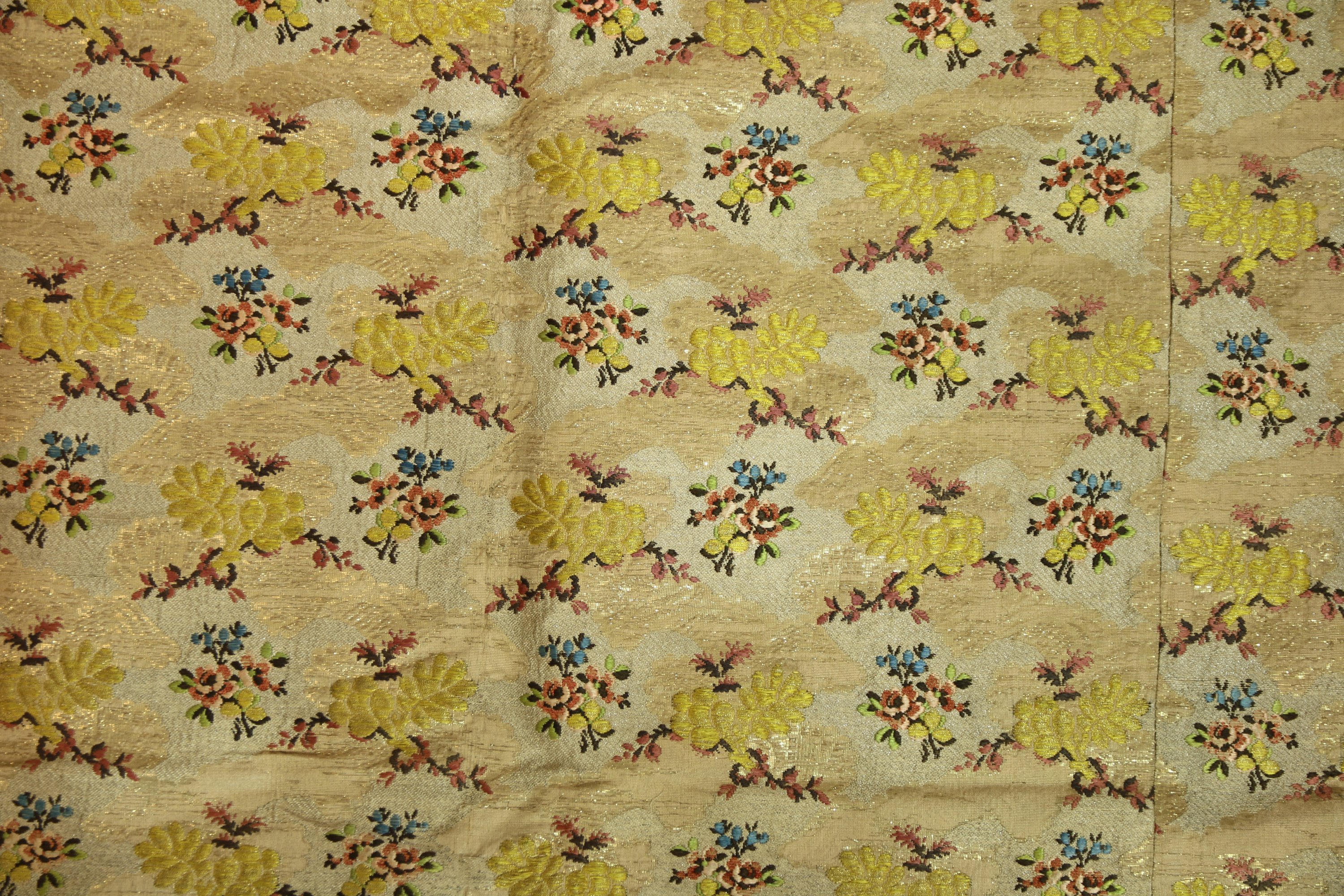 Brocart, XVIIIème siècle, faille rose tramée argent, décor broché polychrome et or filé riant de rivières de fleurs et feuilles. Provient dune chape.