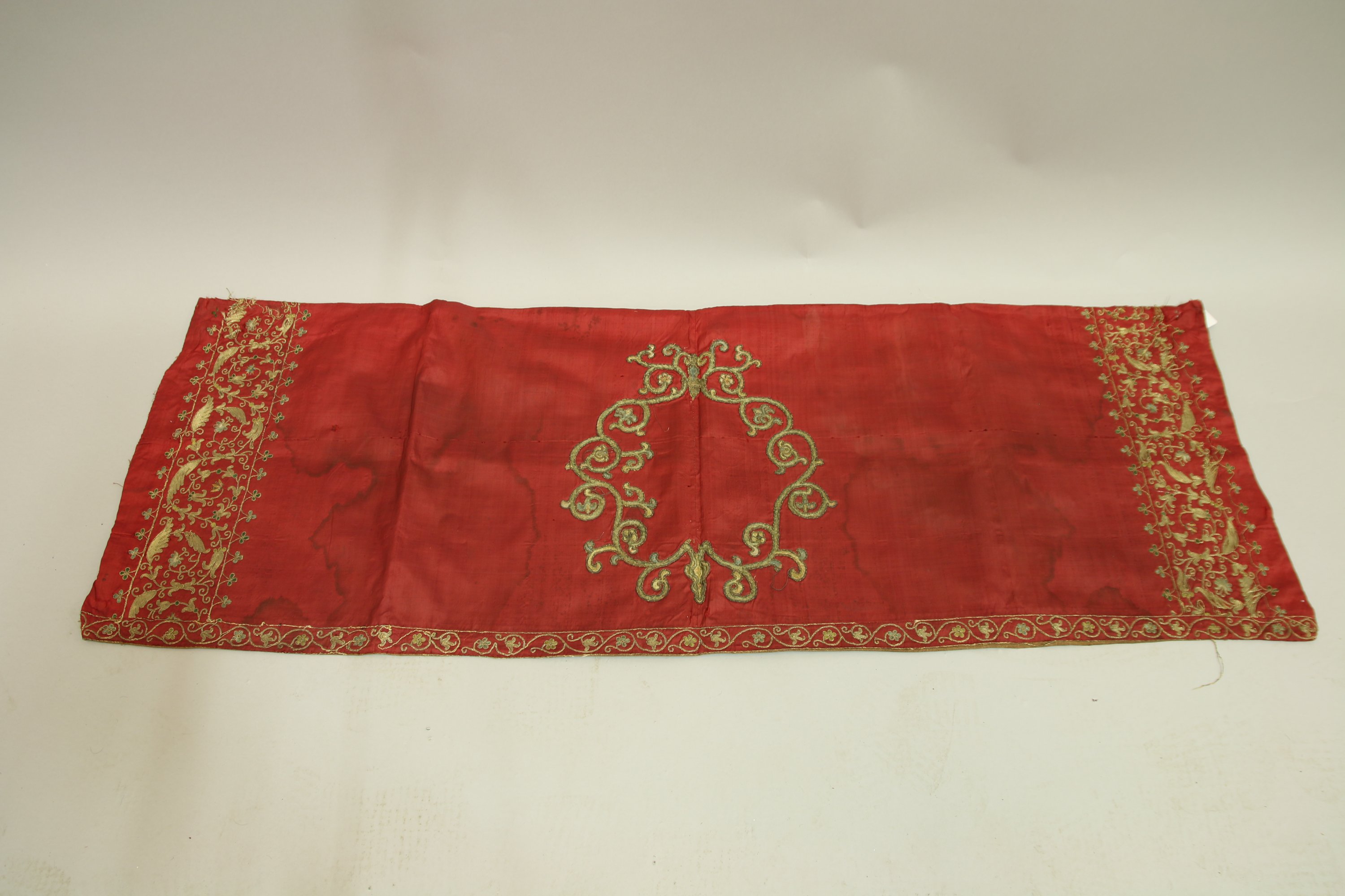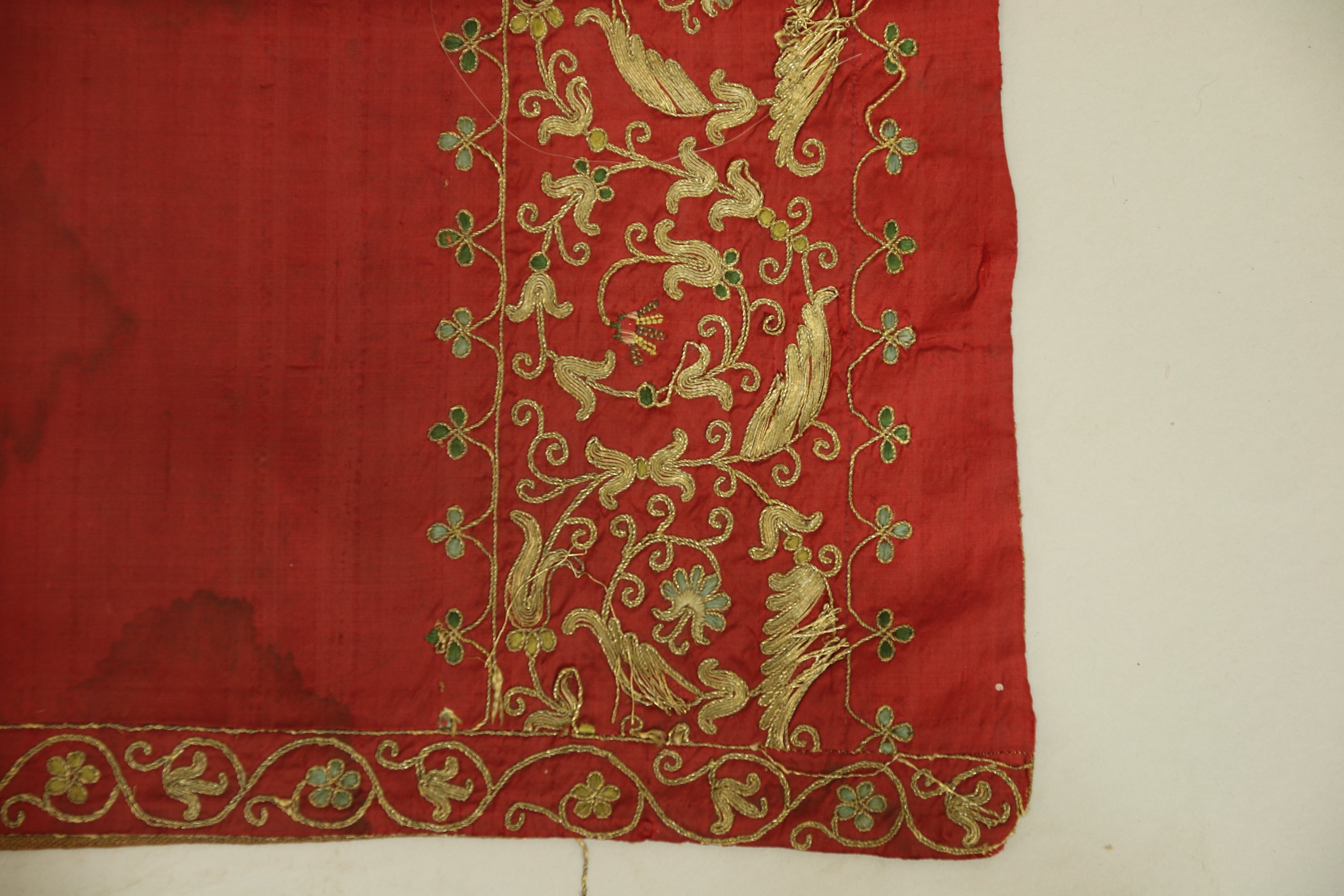 Bas de panneau, XVIème siècle, taffetas rouge brodé en fil dor et camaïeu de soie verte dun médaillon, bordure de rinceaux fleuris.