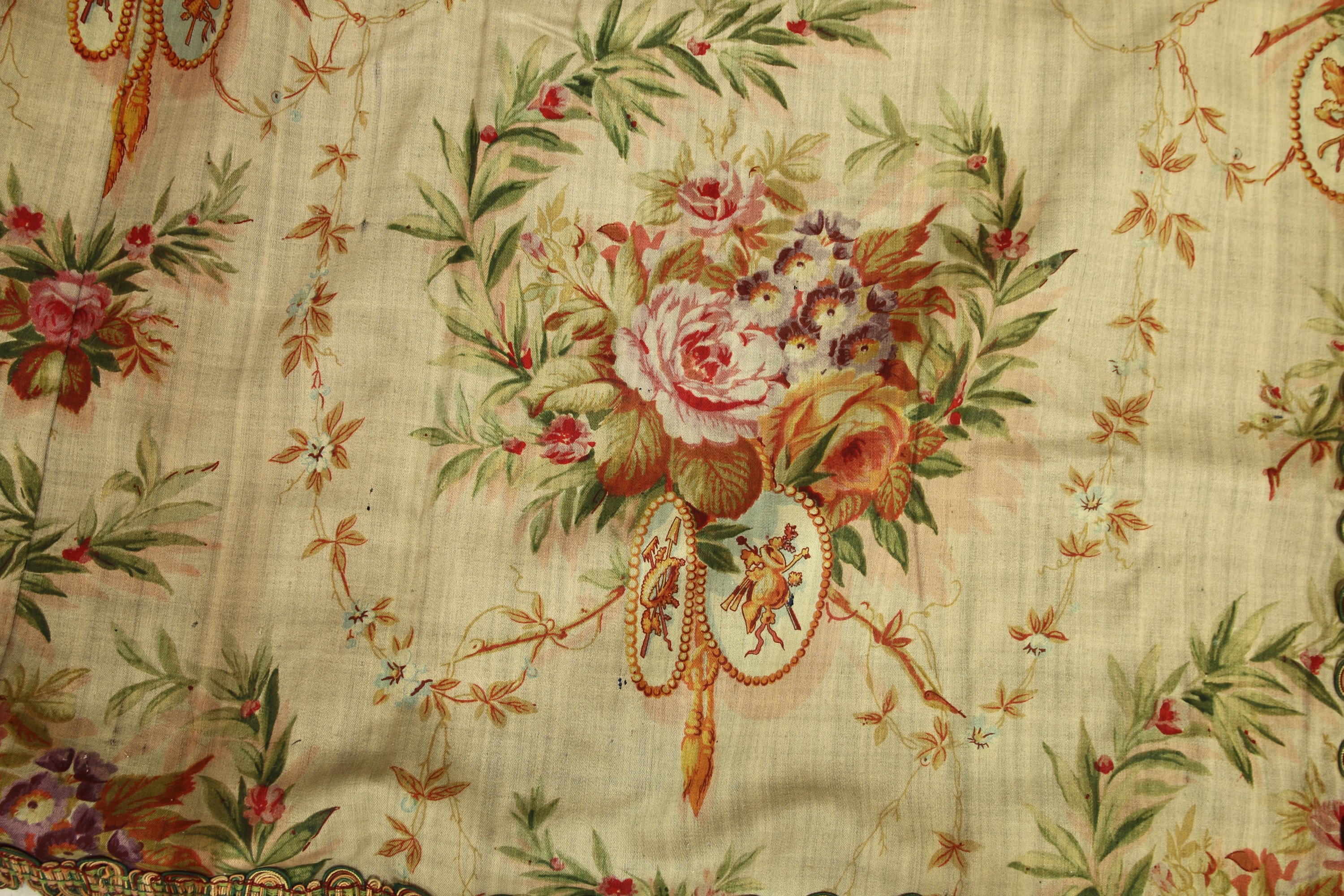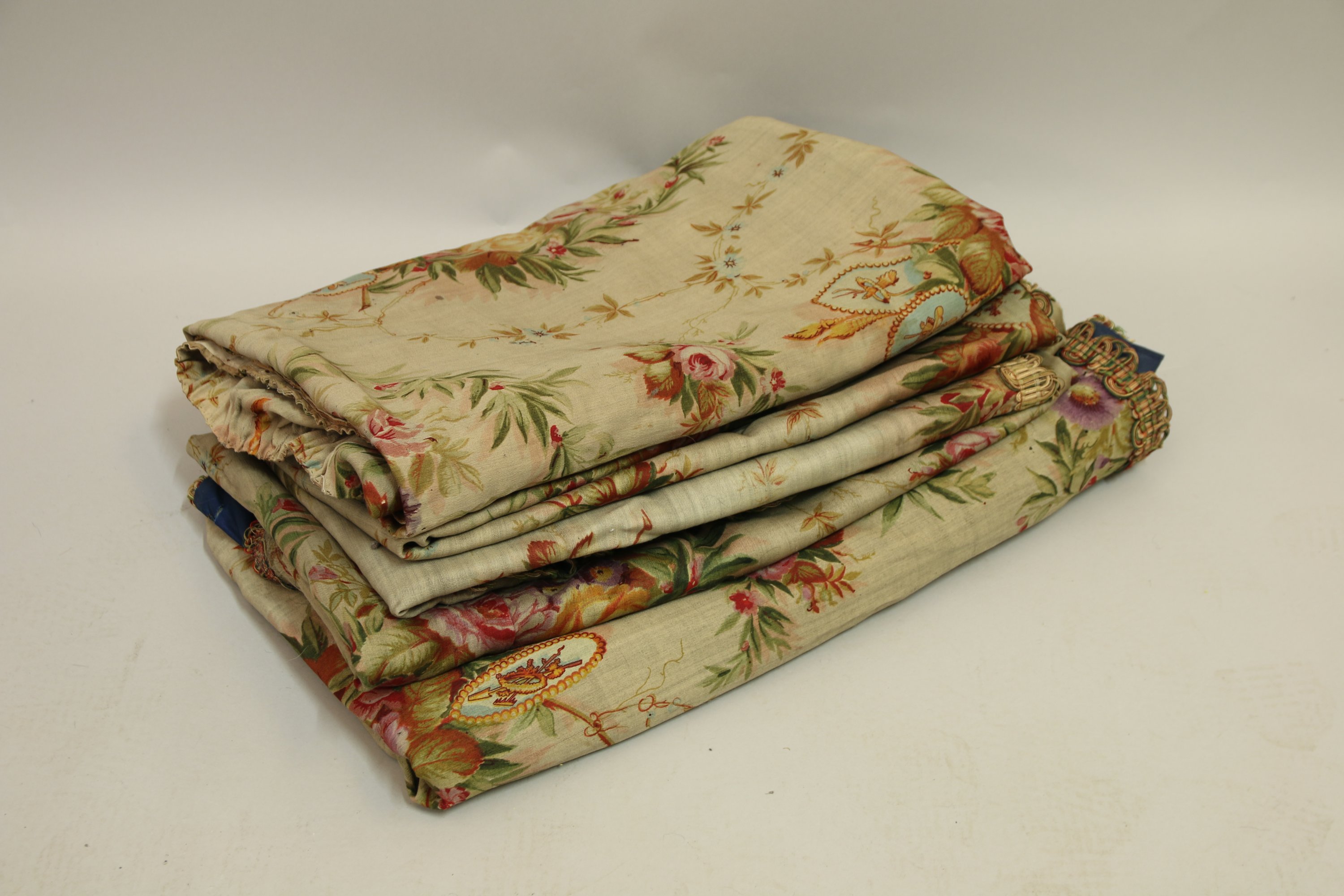 Deux paires de rideaux en lin imprimé, fin XIXème siècle, décor de gerbes de fleurs dans une couronne laurée et médaillons avec trophées, doublure de percale bleue, galonnés.