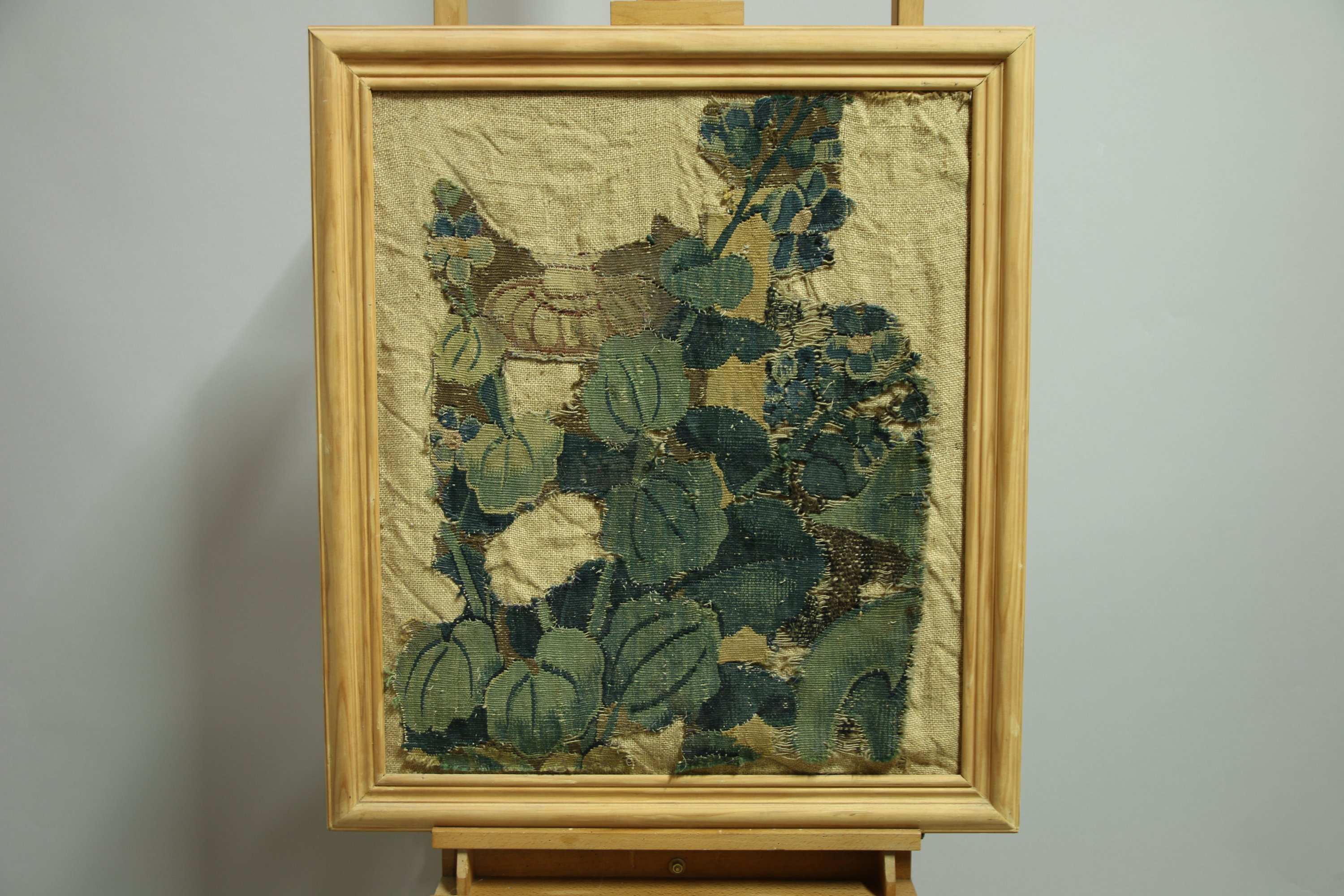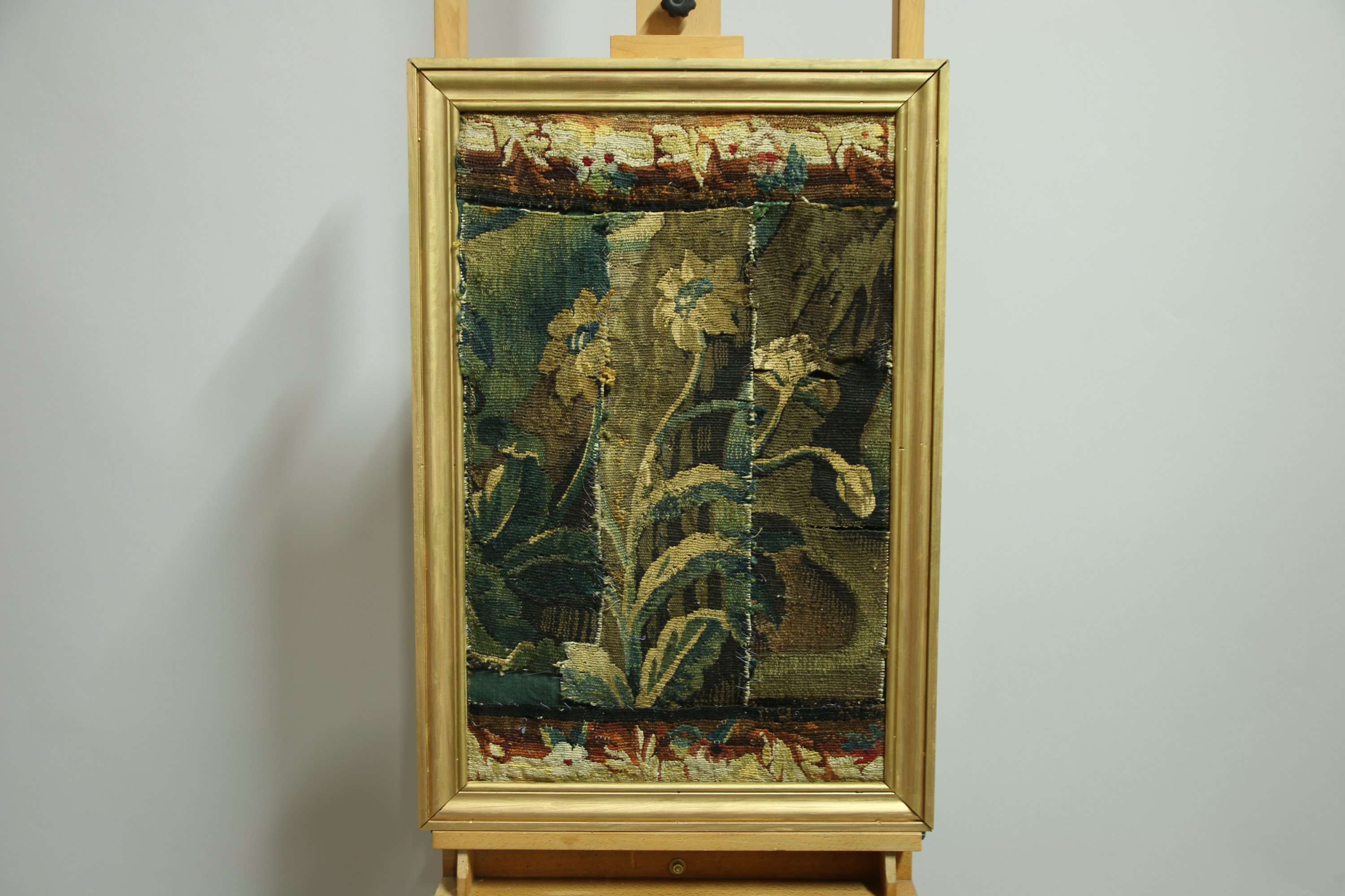Réunion de fragments de tapisseries encadrés, Flandre, Aubusson, XVI, XVII et XVIIIème siècle, fleurs, fruits et personnages daprès Julliard dans la suite de Téniers.