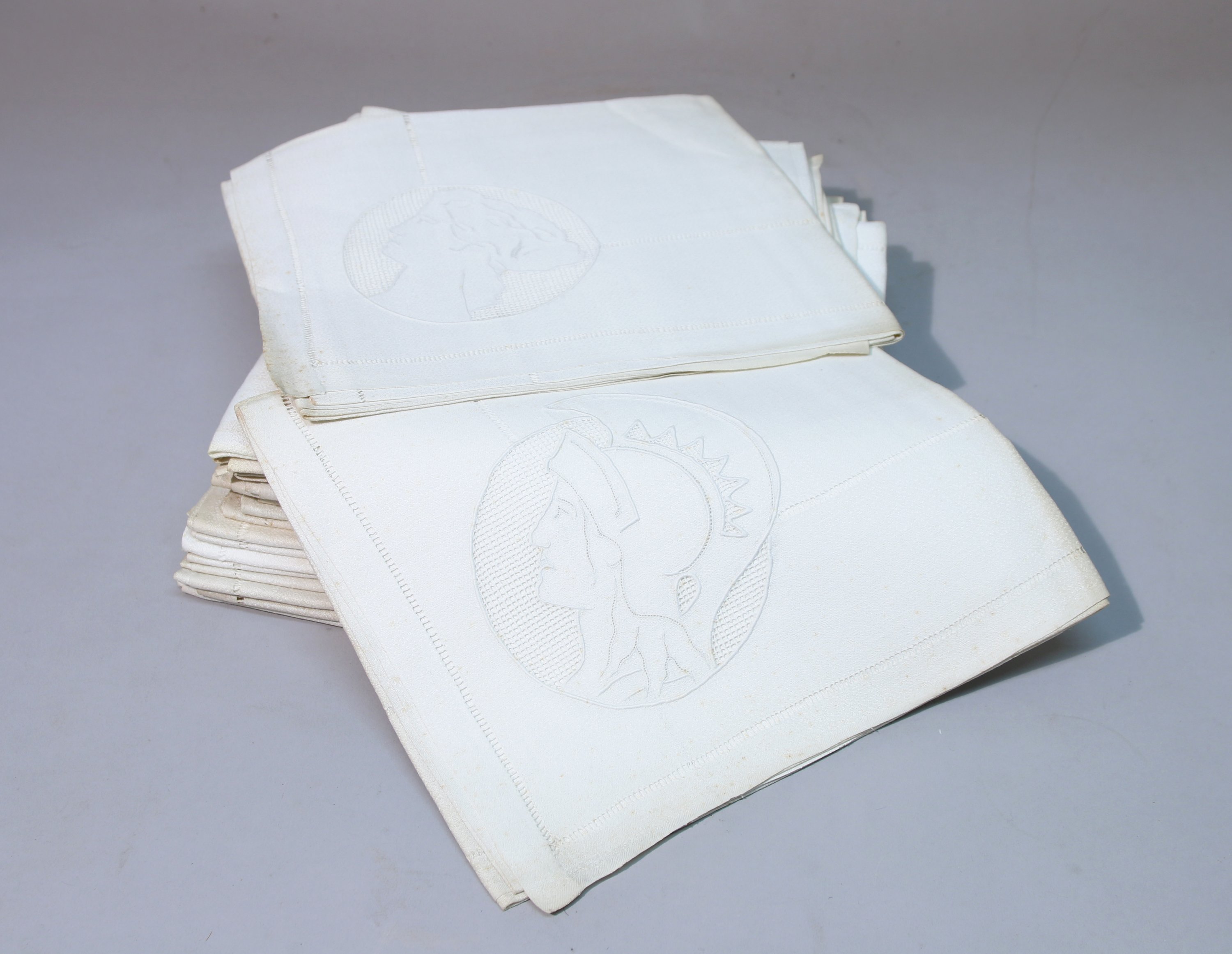 Vingt quatre serviettes en granité, circa 1930, décor ajouré dun médaillon avec la tête dune divinité : Diane, Minerve, Jésus Christ, Vénus, Mercure, Apollon, Flore.