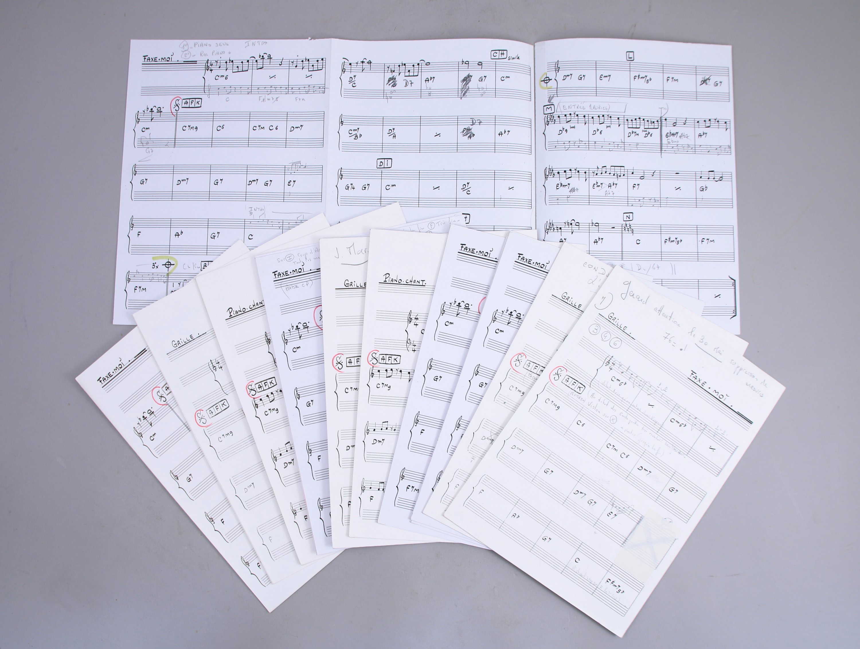 Les partitions étaient toutes conservées - soigneusement - dans une chemise cartonnée à rabats (32x23 cm), sur laquelle le titre de la chanson est inscrit, en capitales, au feutre. Les partitions et grilles d'accords présumés de la main de Barbara, ou de ses proches comme de copistes. Arrangements pour les différents instruments. Annotations manuscrites. Ces partitions sont des documents de travail de première importance tant pour la création musicale que le travail de scène et les enregistrements.