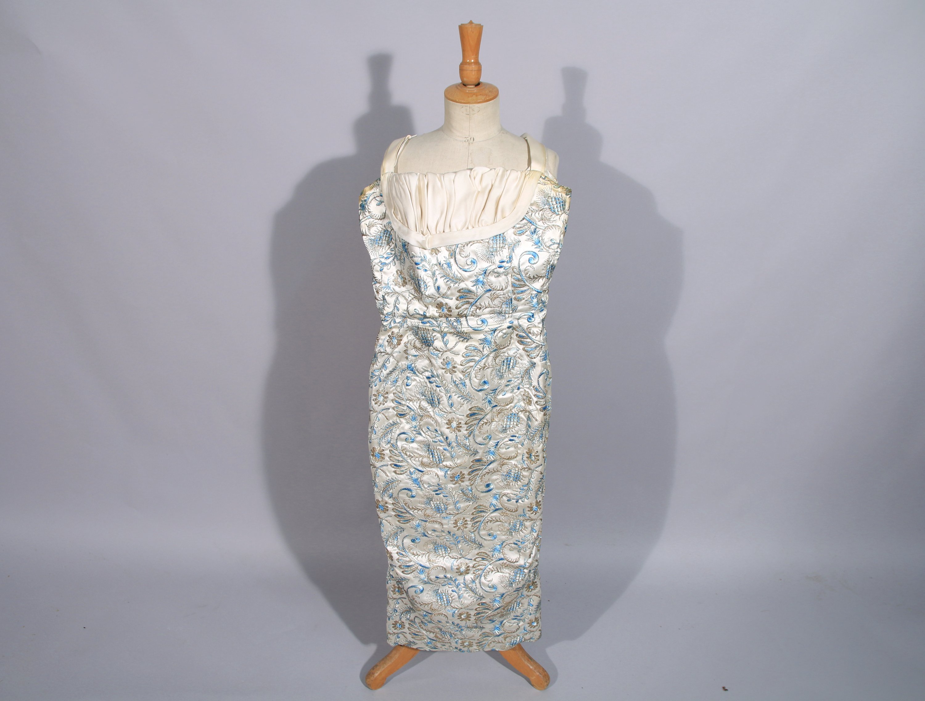 ROBE BUSTIER, satin crème broché bleu et crème de palmes.