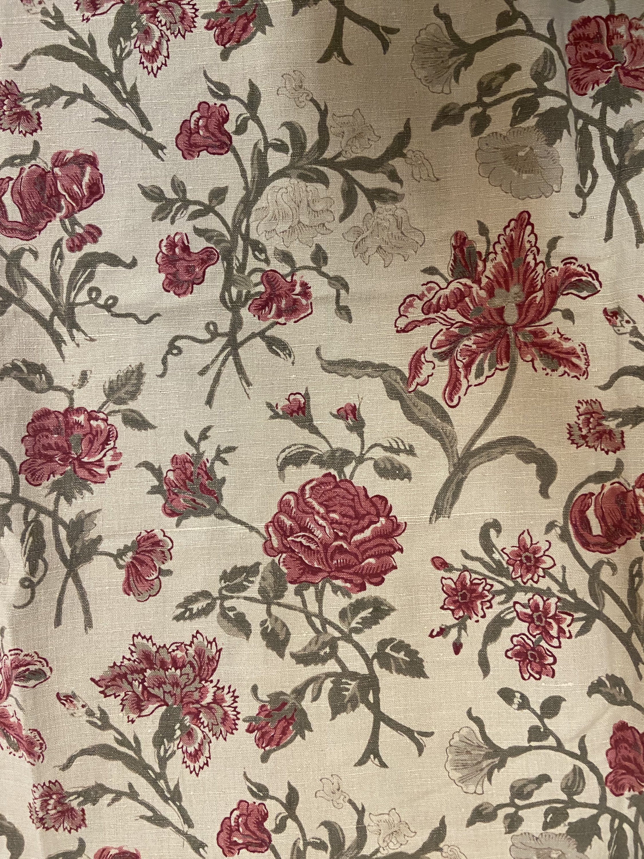 Indienne en lin imprimé, Angleterre, deuxième tiers du Xxème siècle, fond crème, décor vert, gris et rouge de fleurs.