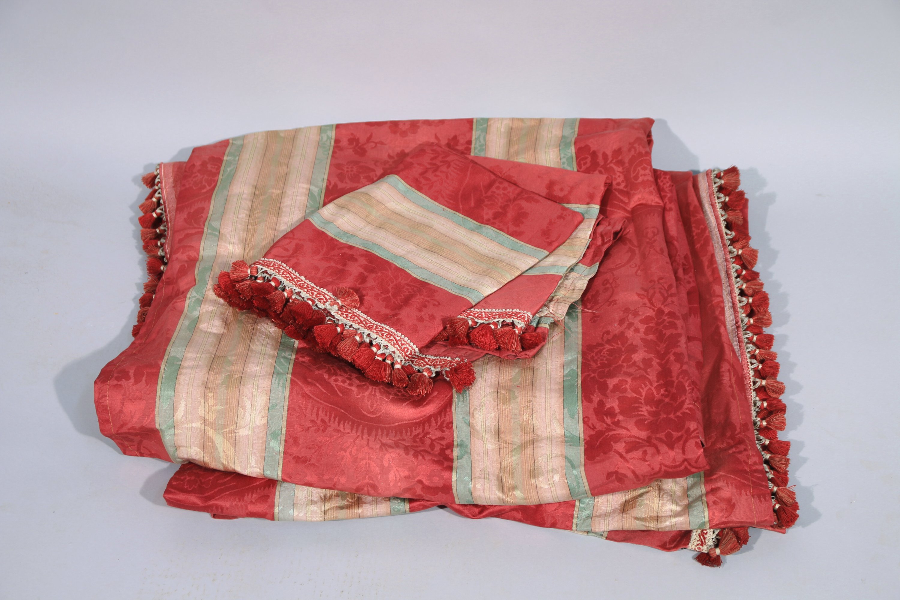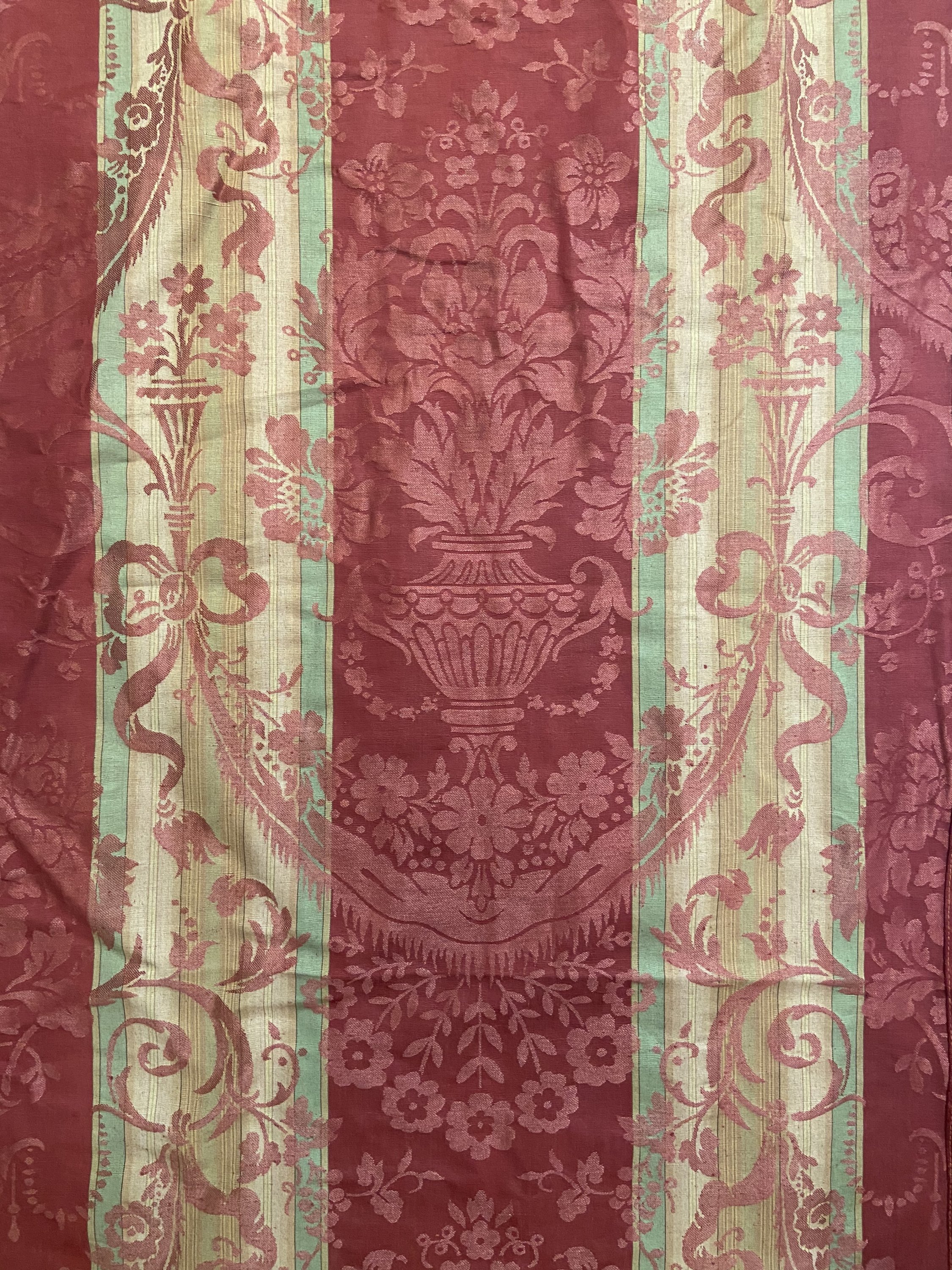 Paire de rideaux en damas rayé, style du XVIIIème siècle, rouge, crème et vert chiné, décor dun vase de fleurs dans des draperies et rinceaux.