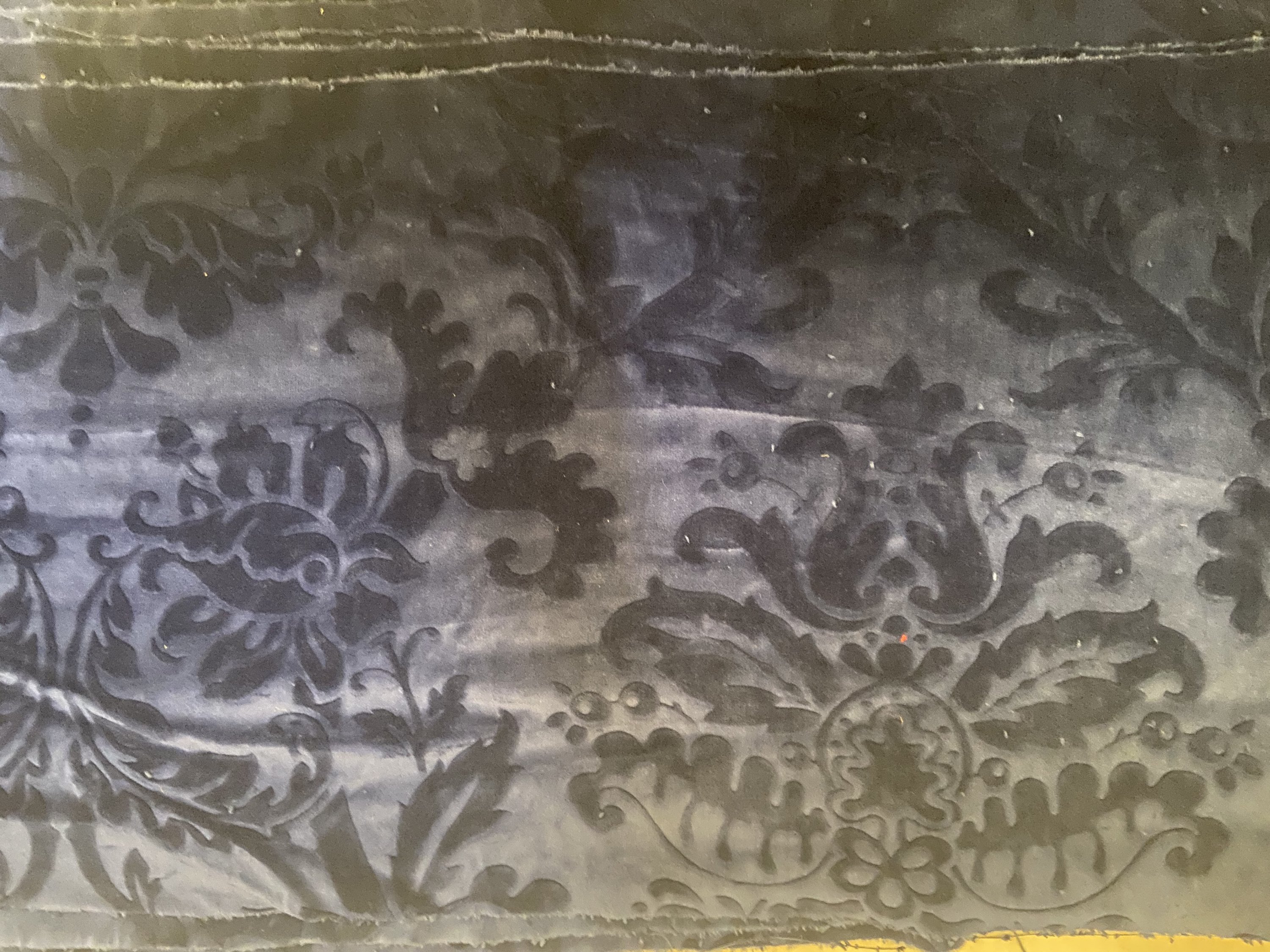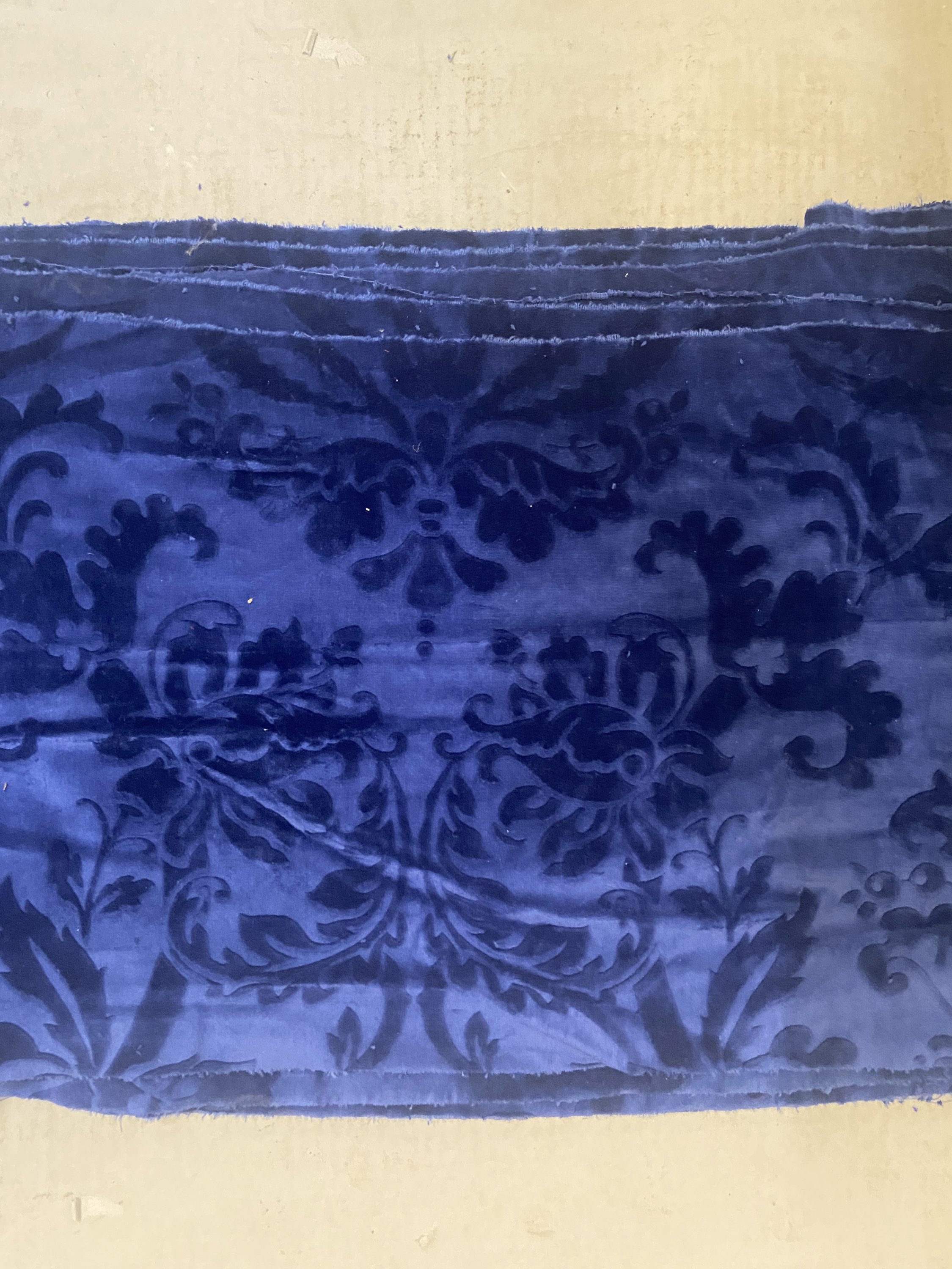 Bande de velours gaufré bleu roi, style du XVIIIème siècle, rinceaux de fleurs et grenades.