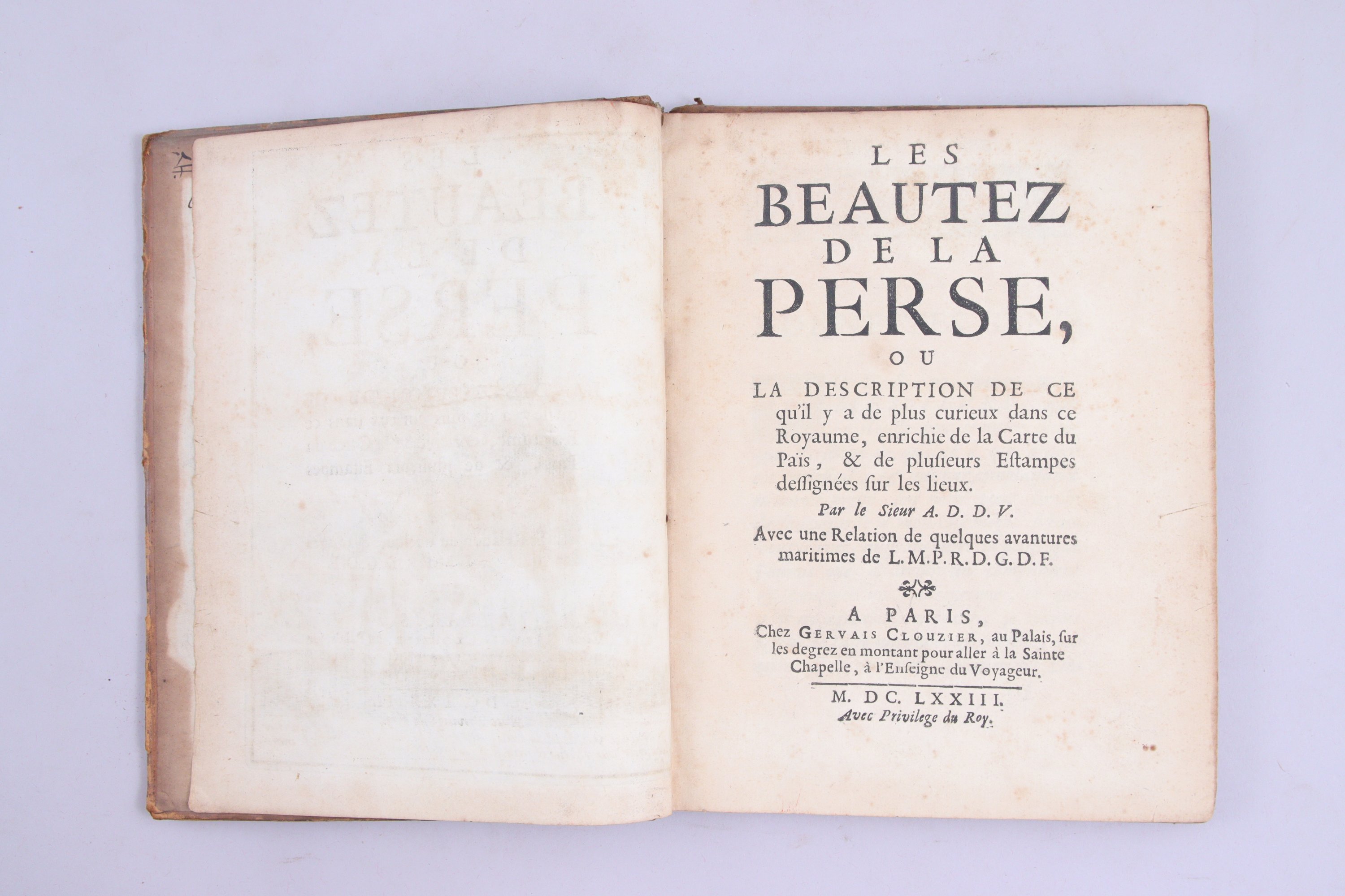 Les beautez de la Perse, ou la description de ce qu'il y a de plus curieux dans ce Royaume, enrichie de la Carte du Païs, et de plusieurs estampes dessignées sur les lieux. Par le Sieur A.D.D.V.,avec une relation de quelques avantures maritimes ...